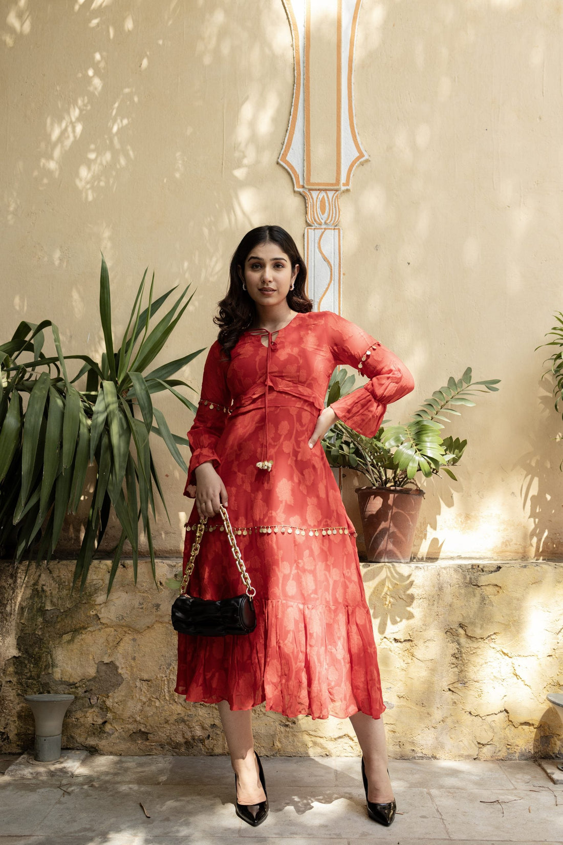 This striking cotton Short Kurti features a bold handblock print in shades of maroon and...