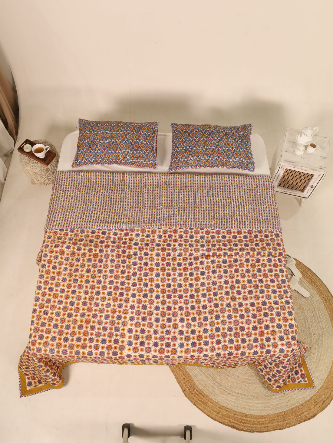 Blue and Off White Quiltted Reversible Bedcover