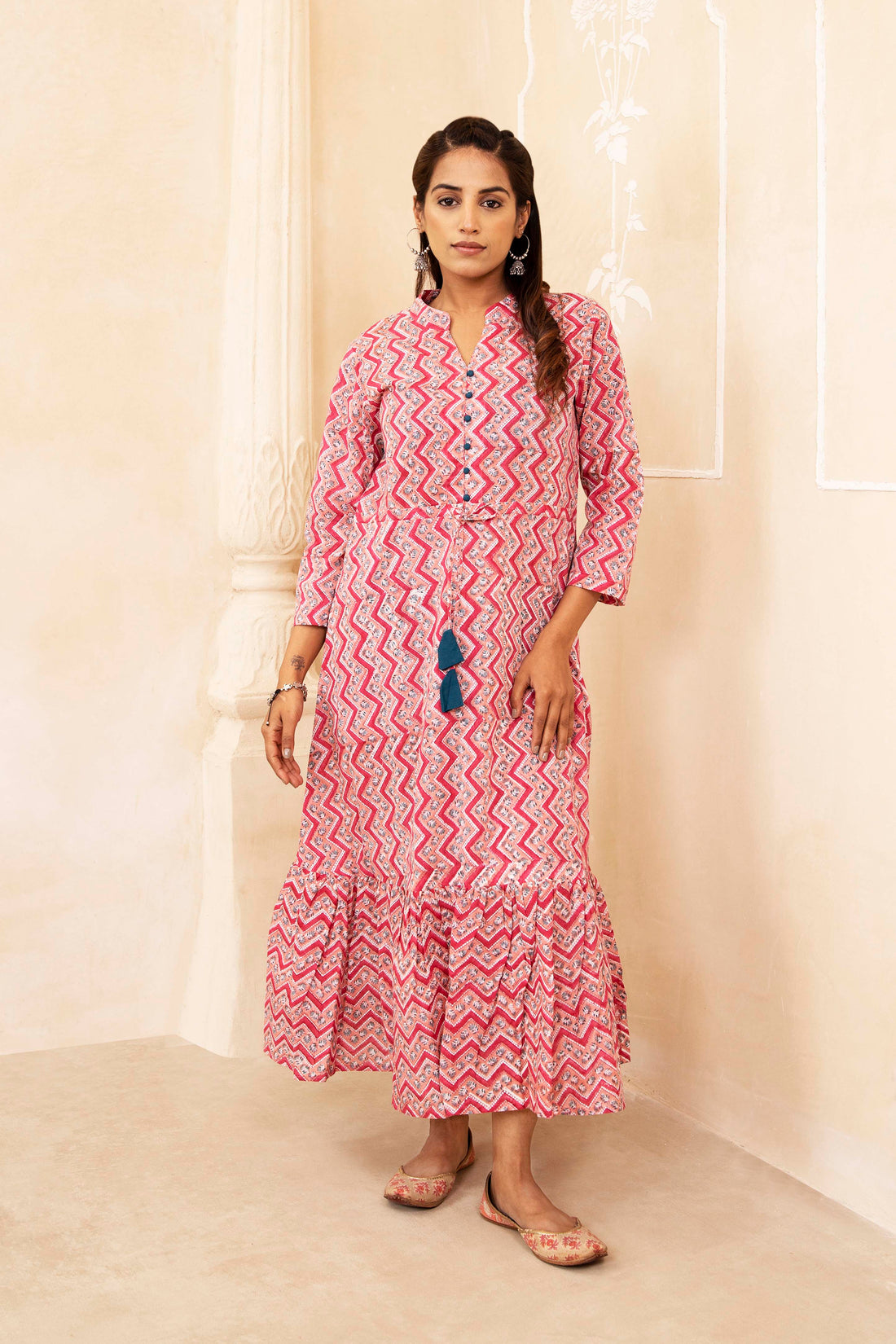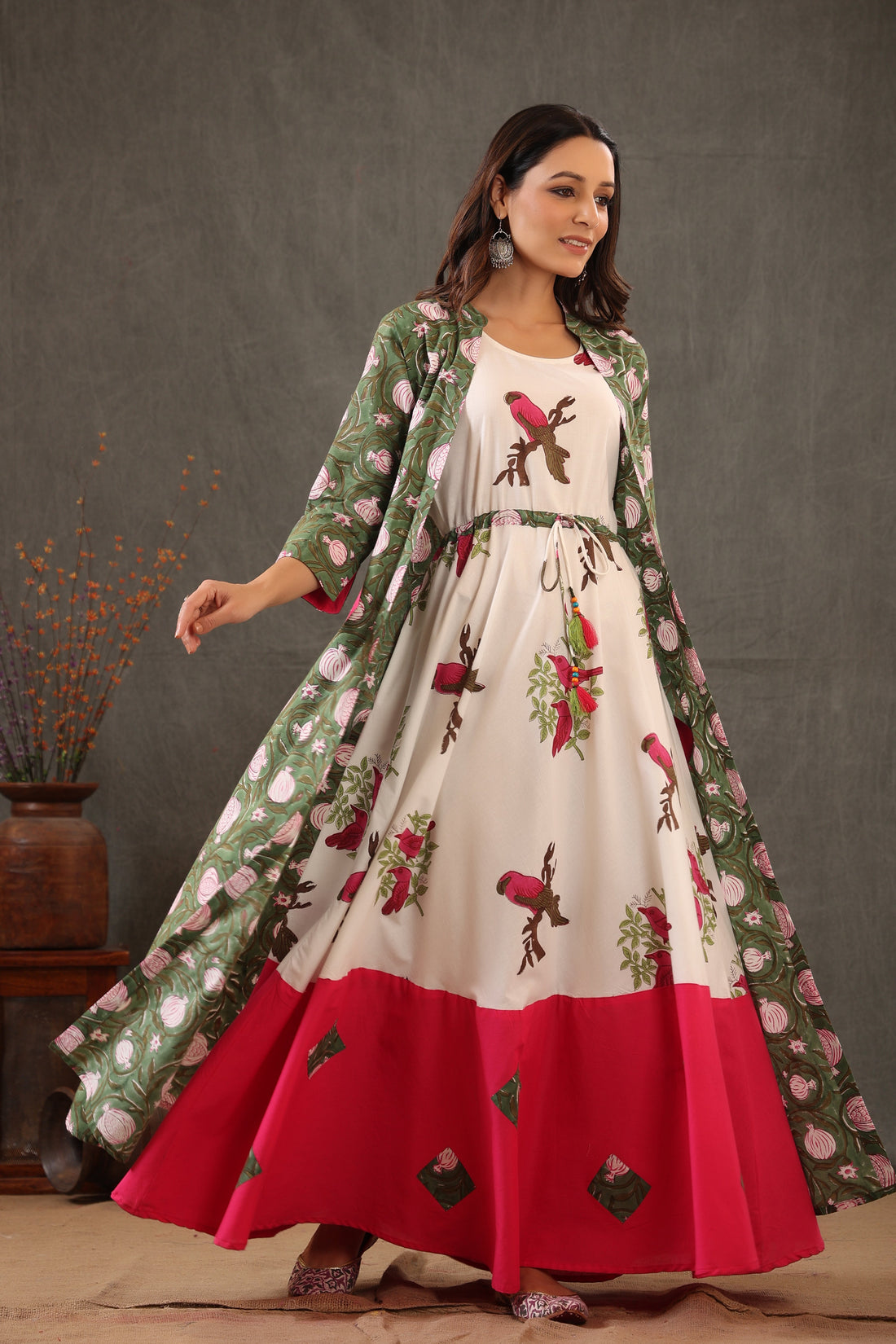 Parmisan beige with a combination of garnet red handblock printed a line kurta