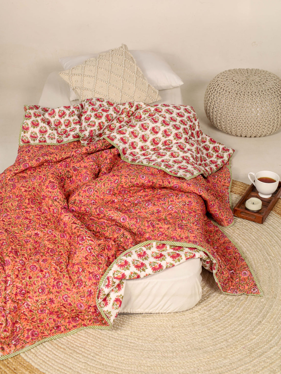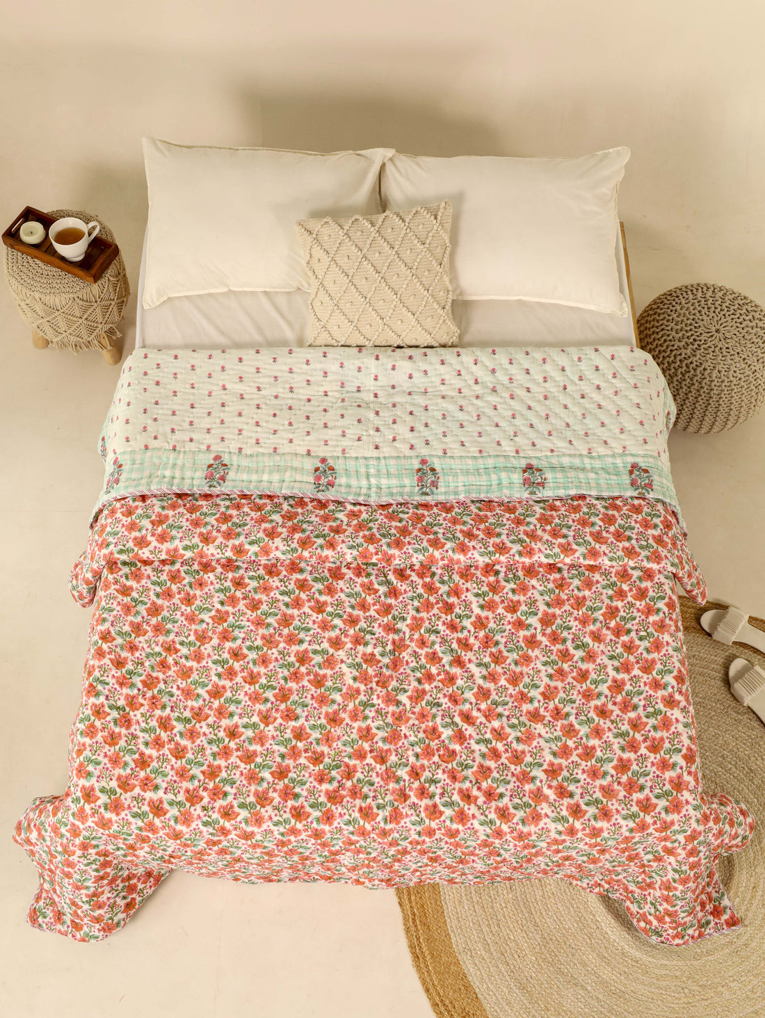 Peach, Pink and BlueReversible Quilted Bed Razai