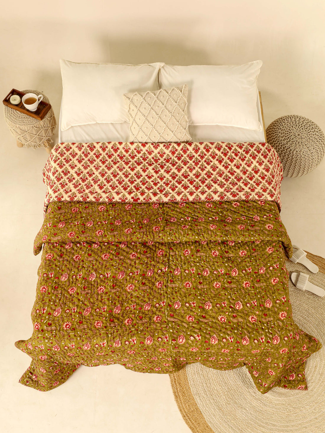 Olive Green and Red Single Bed Reversible Quilted Razai