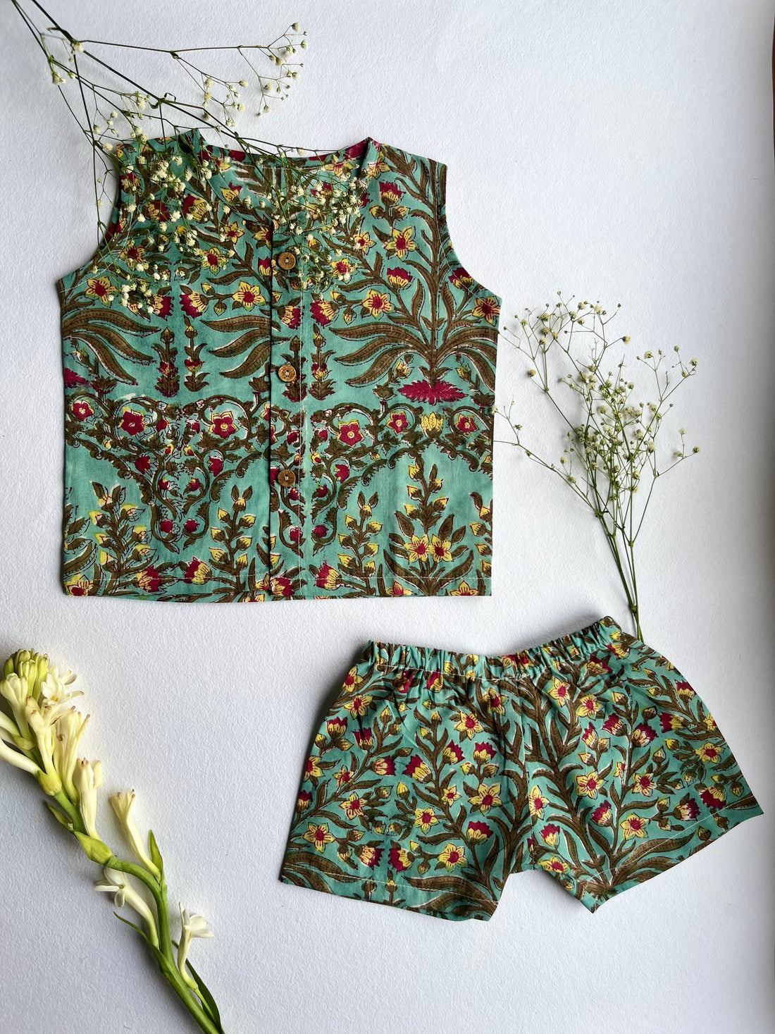 Sea Green and red handblock printed skirt, kurta and Duppatta set