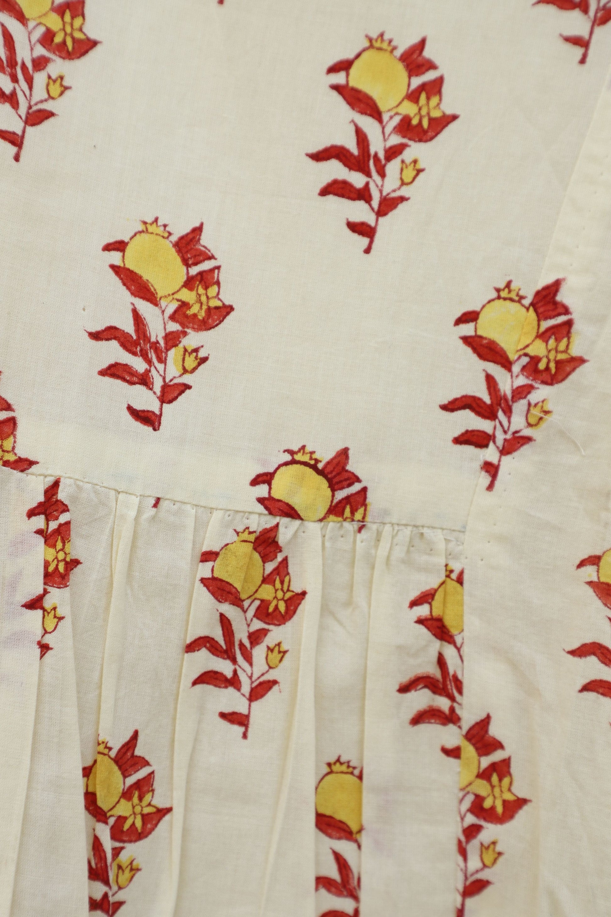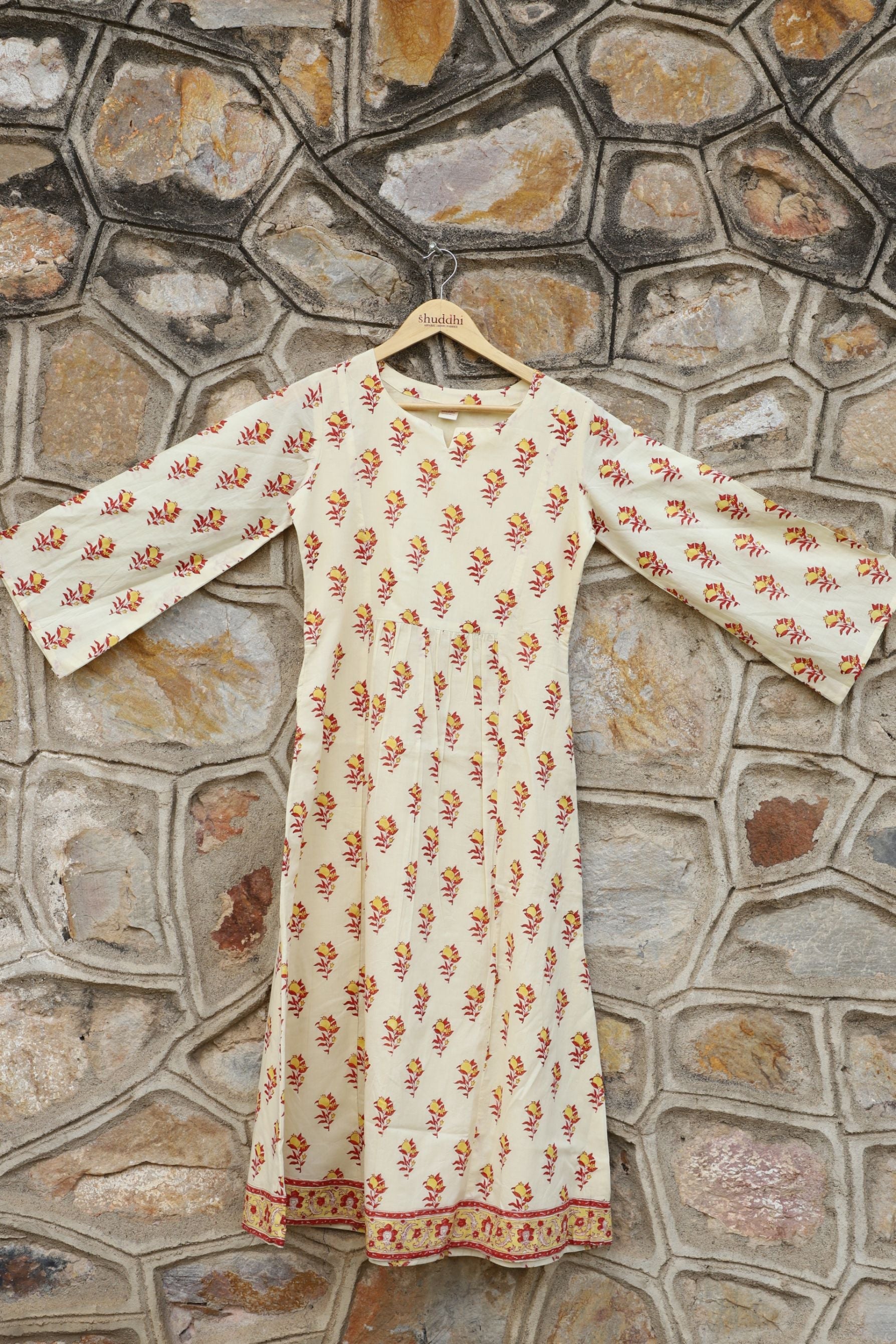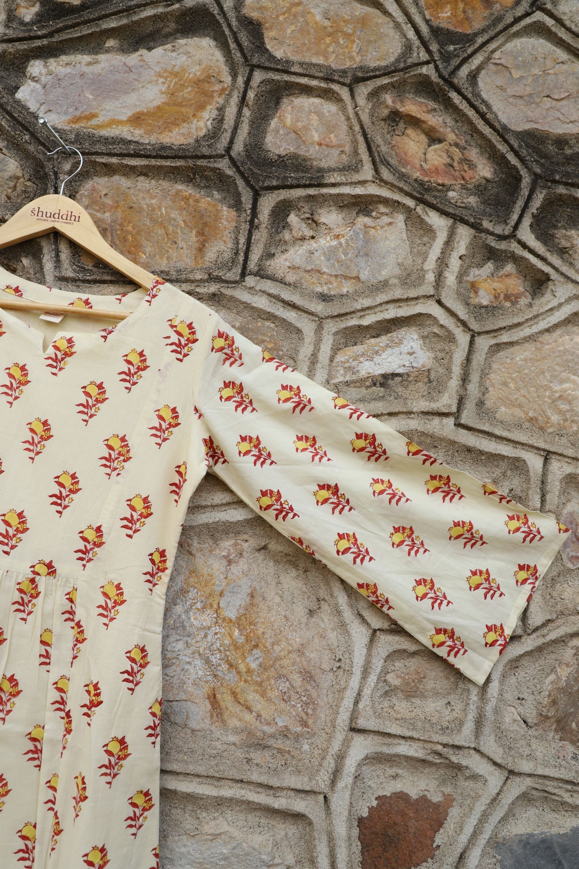Beige with the combination of red A line Dress comes with flaired slvees.