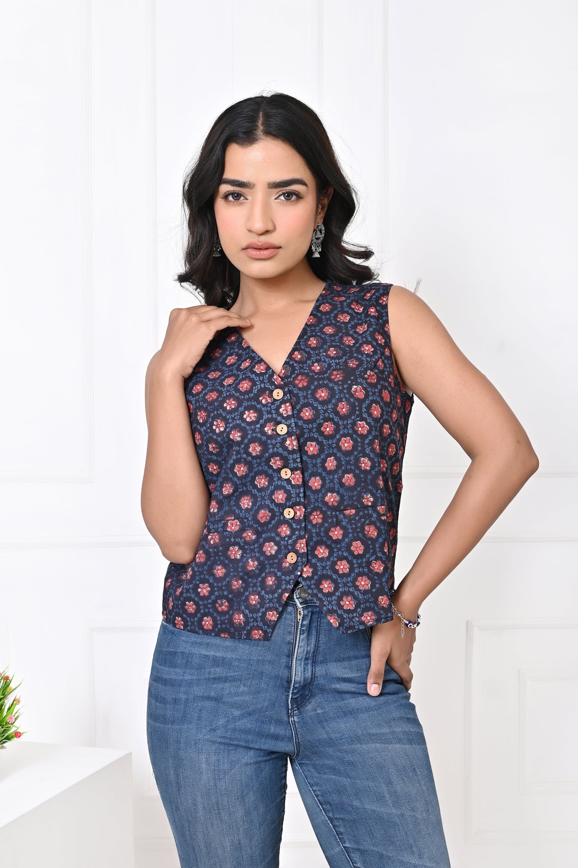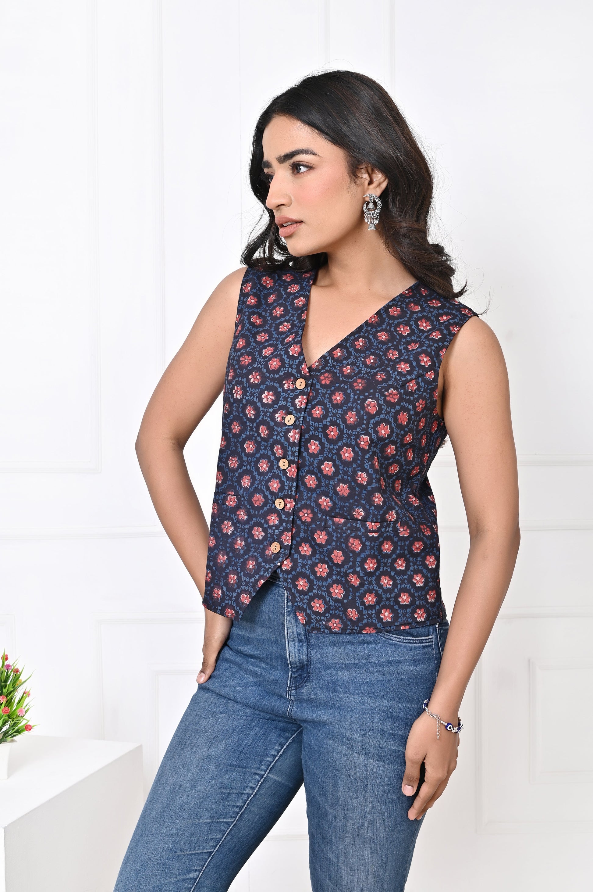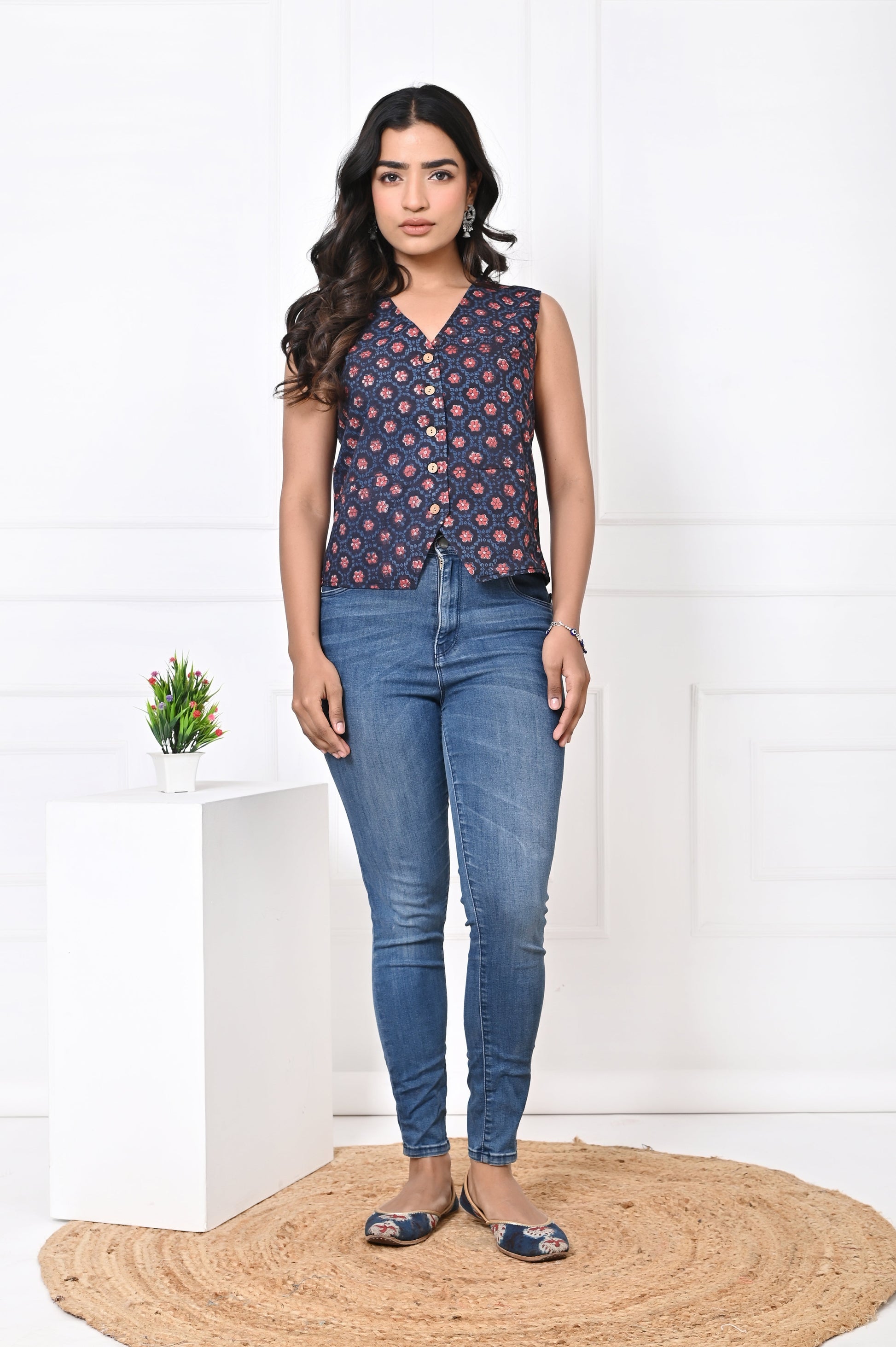 The beauty of the block-printed Koti lies in its adaptability. During the day, it can be paired with casual jeans or lightweight pants, creating a relaxed yet chic look perfect for lunch outings, casual gatherings, or workdays. For a more laid-back vibe, it can also be styled with shorts, adding an element of effortless cool while still maintaining elegance.