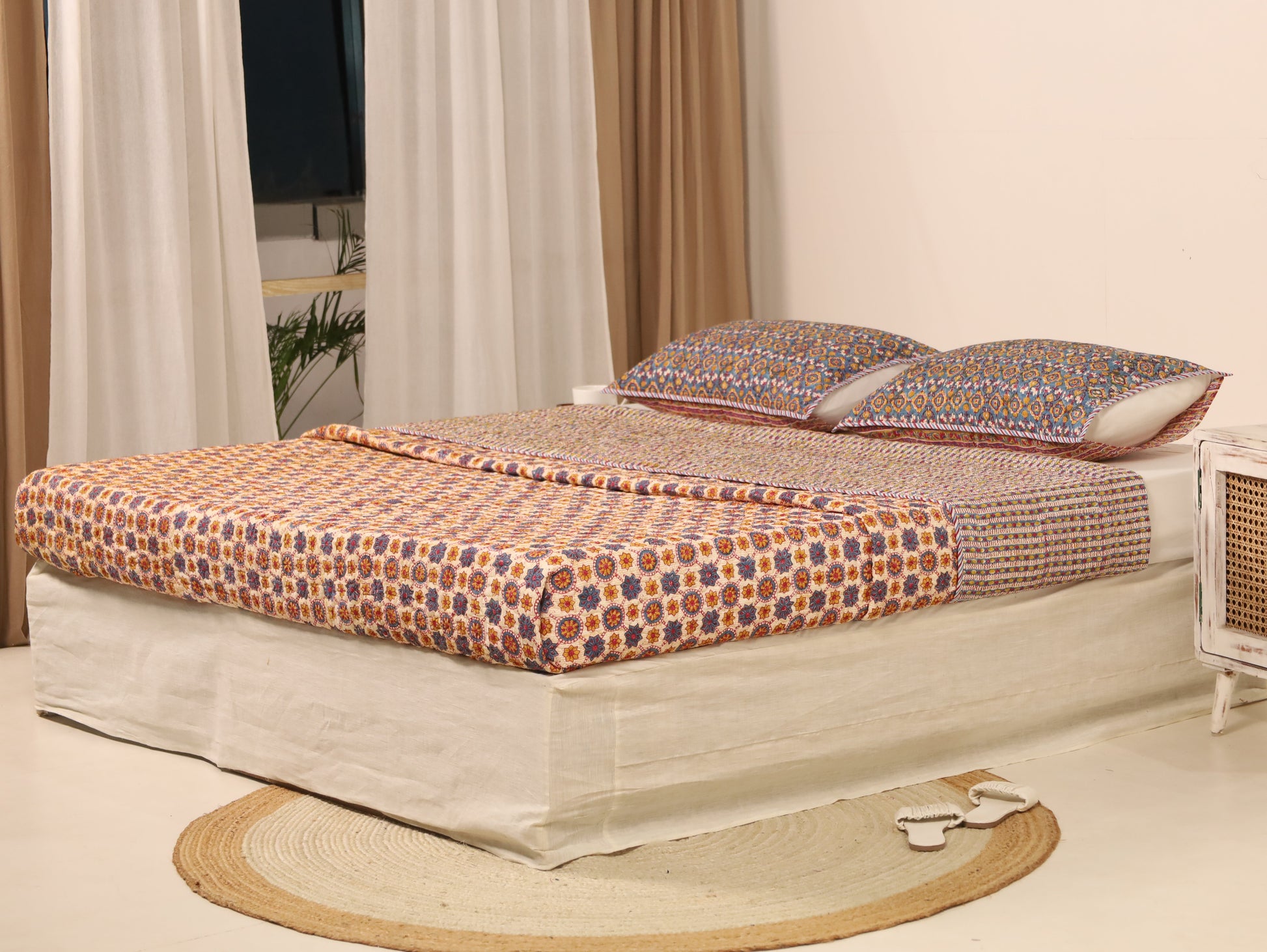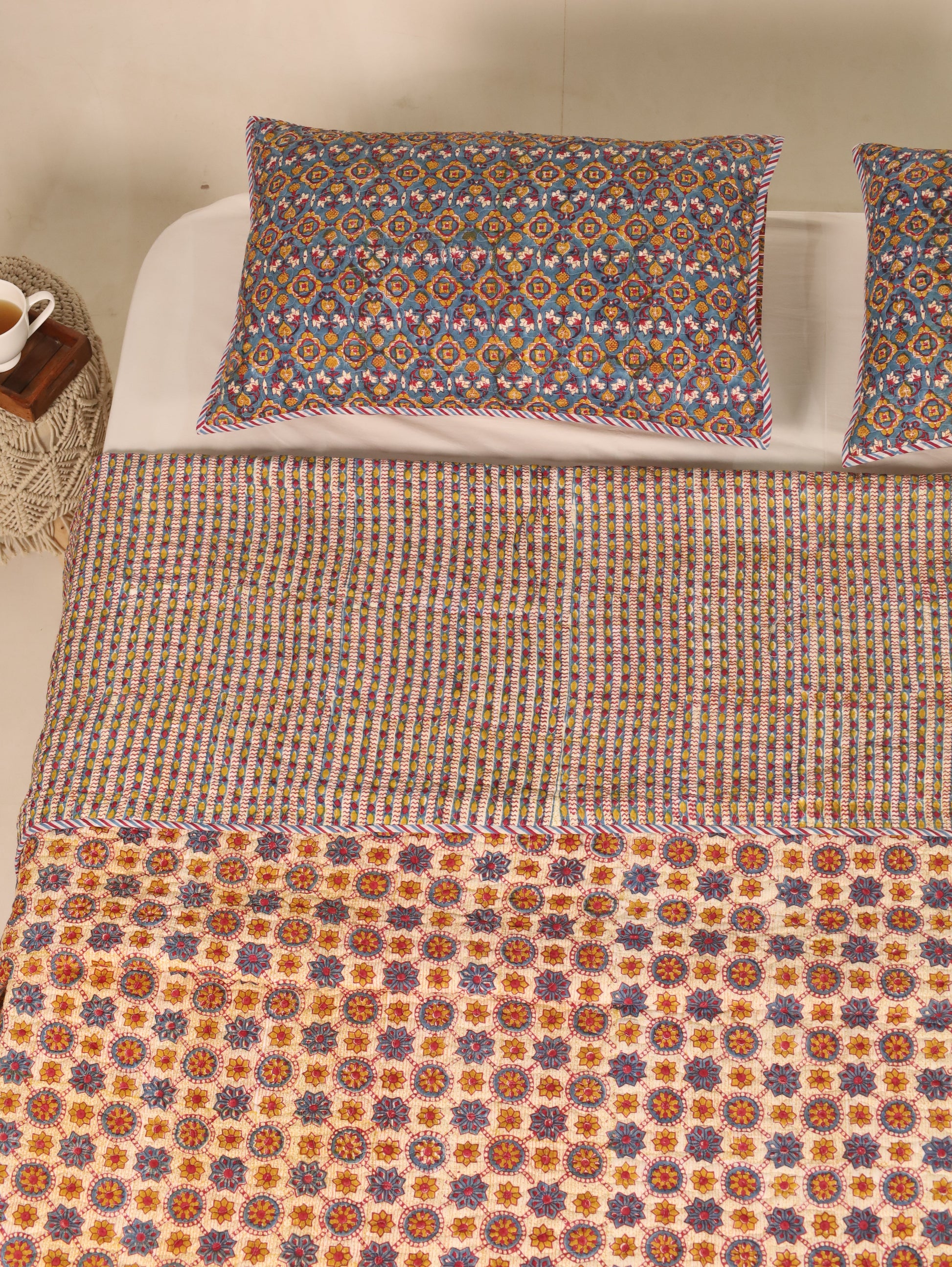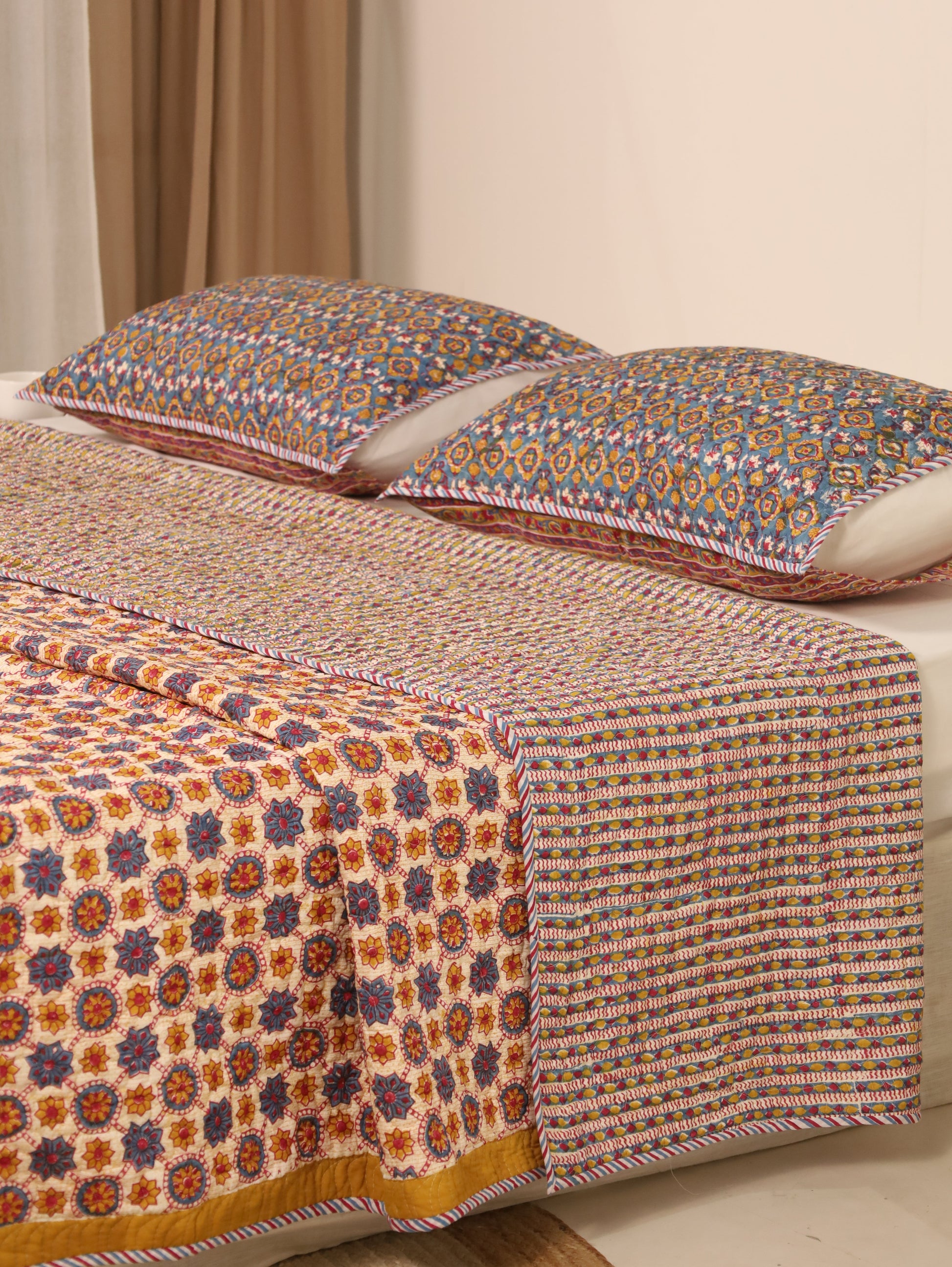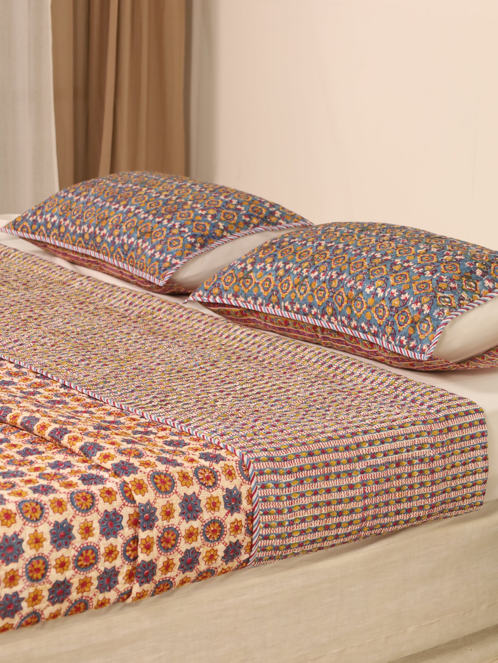 Shuddhi is introducing Reversable Quilted Bedcover that can be easily used on both sides and are typically made by stitching together layers of fabric with a layer of cotton sheet in between, creating a quilted pattern. They add both warmth and visual appeal to a bed. Comes with pair of quited pillow covers. |