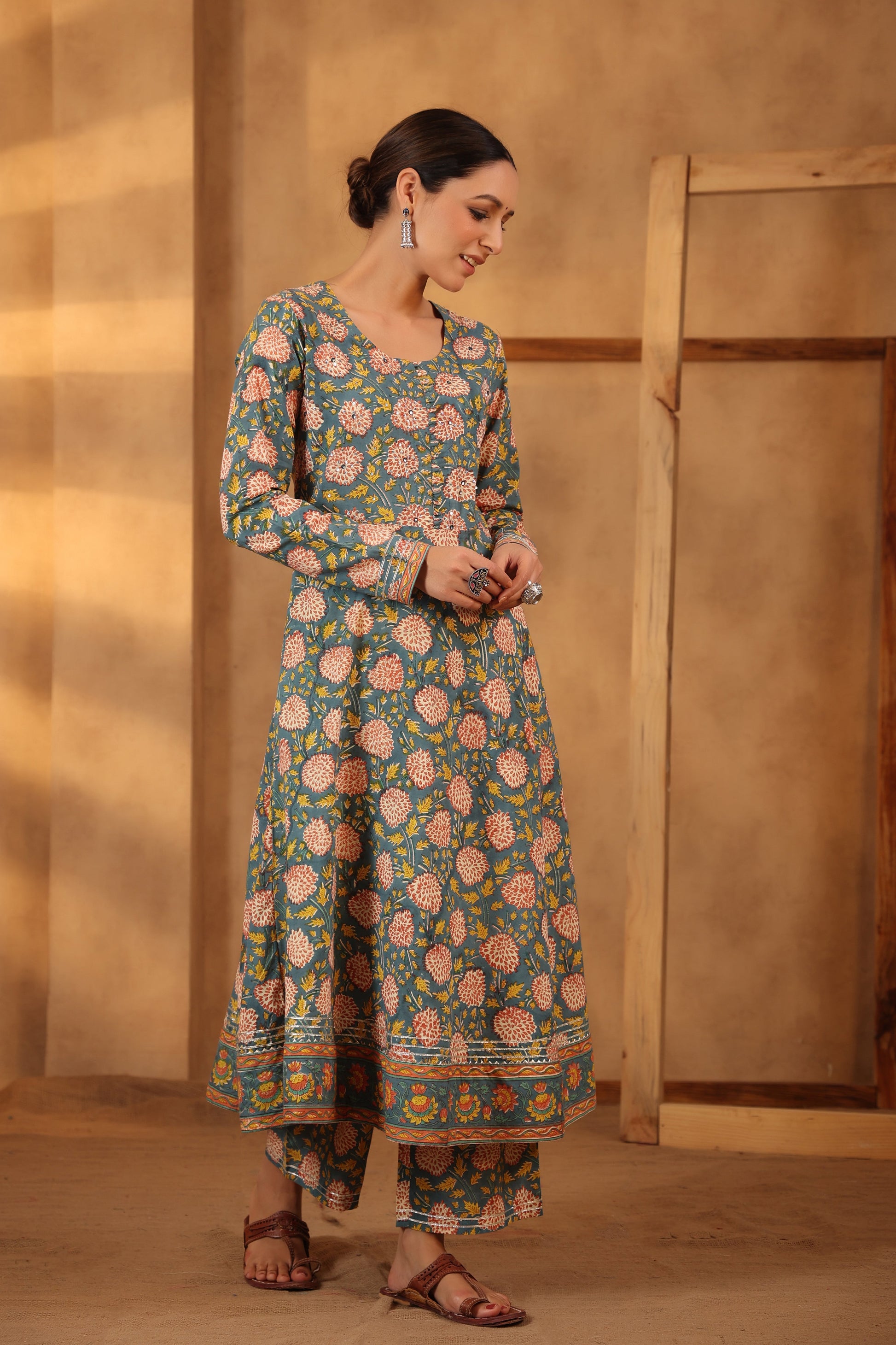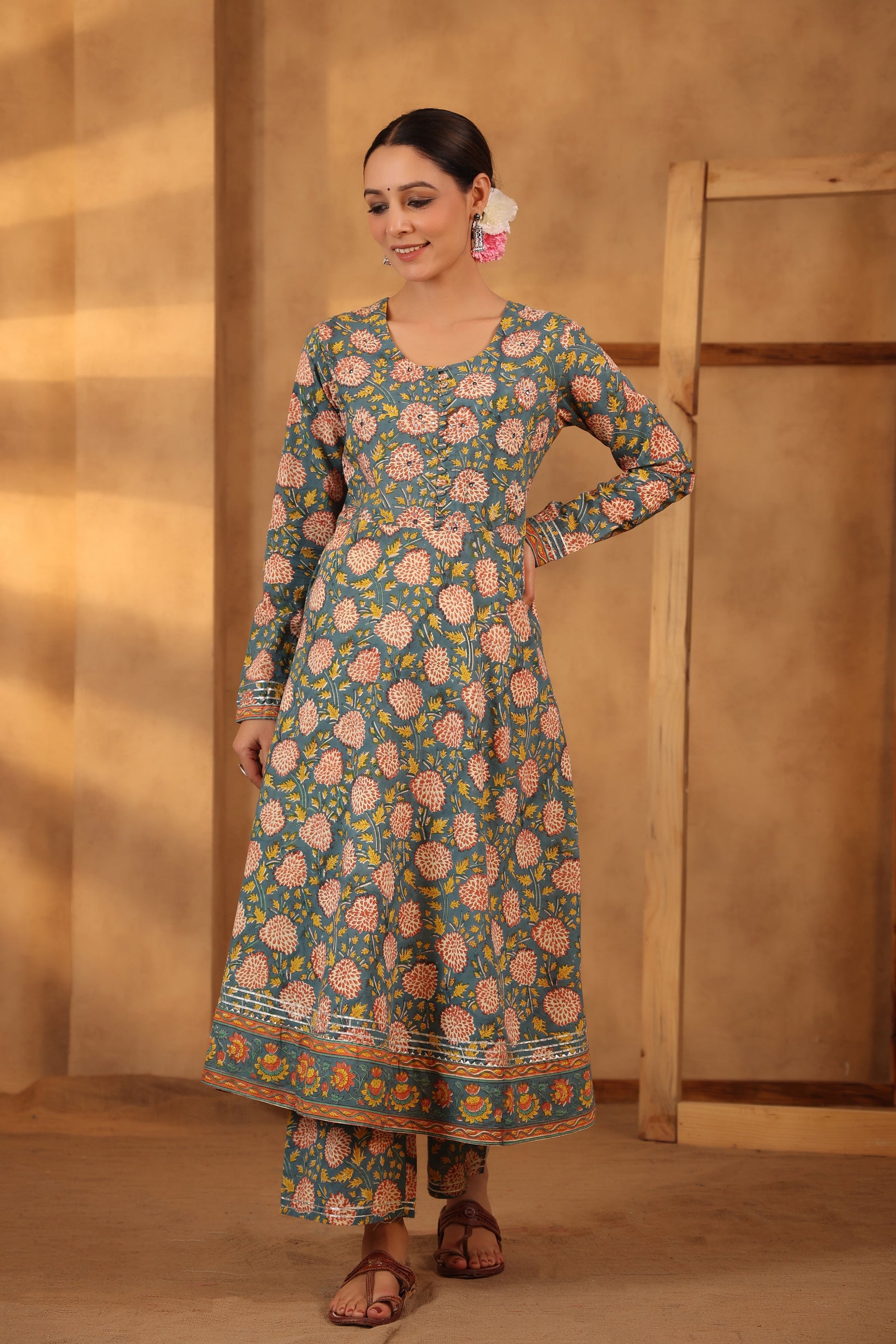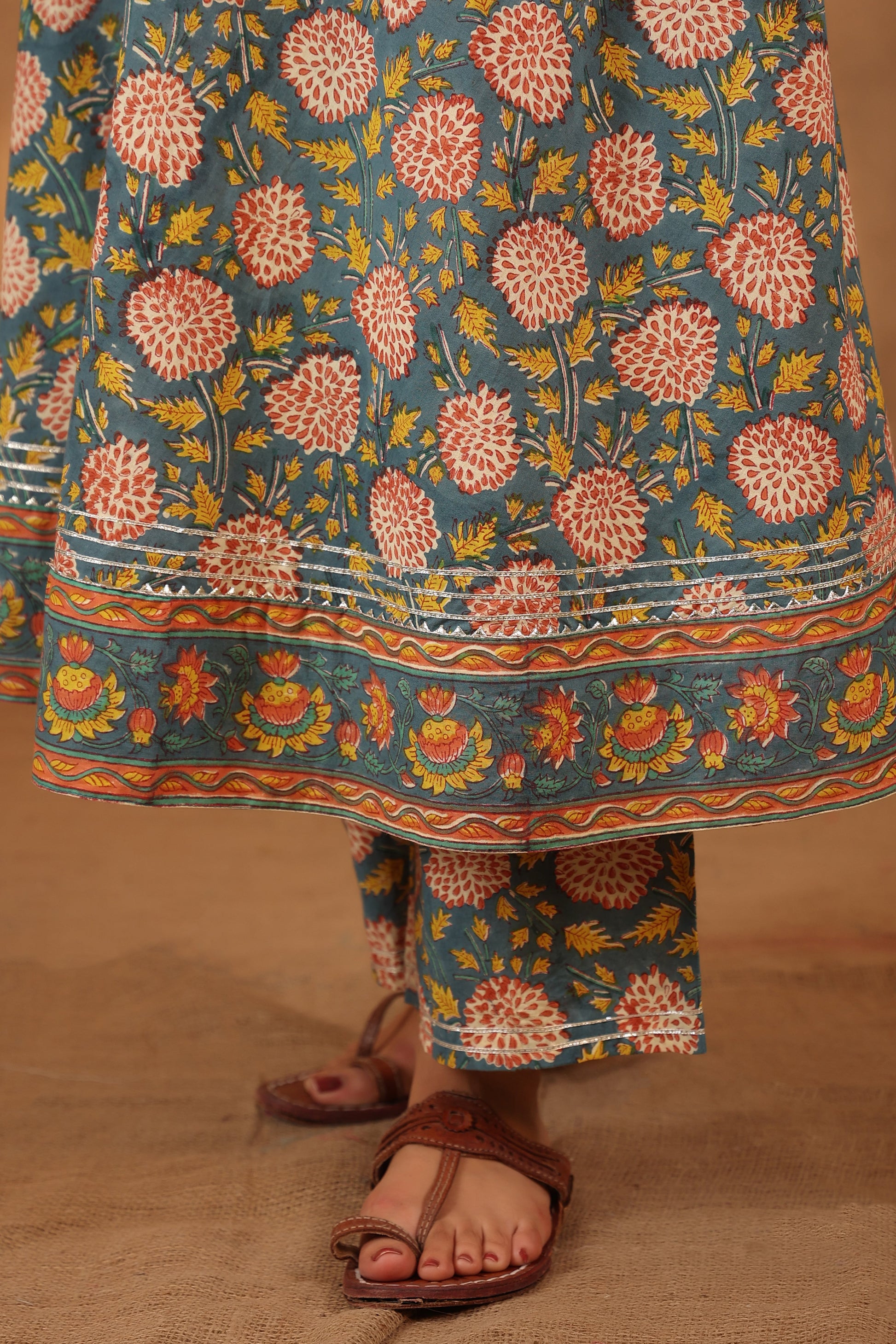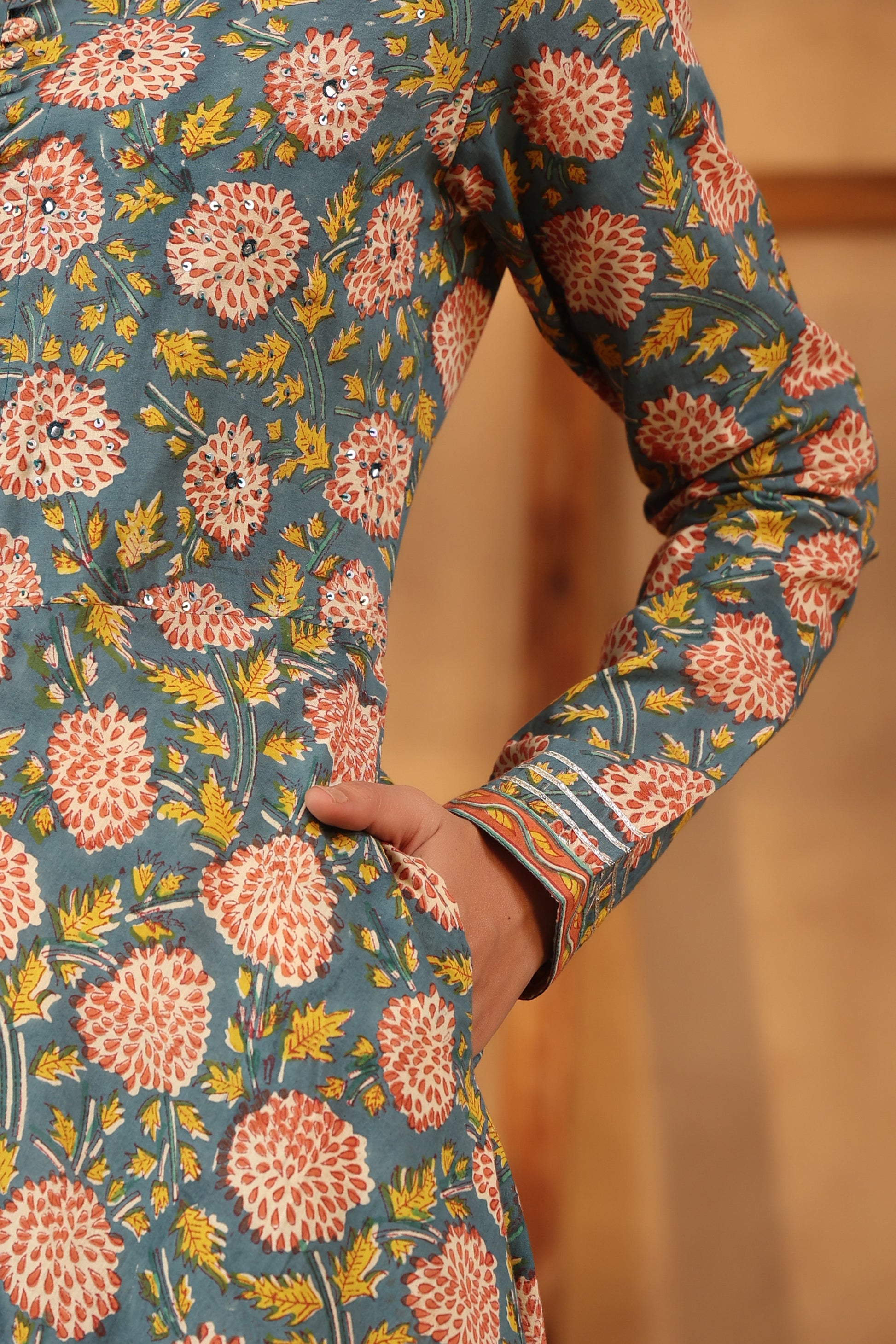 Hand block printed floral Kurta pant set comes with button down look. It embellished with intricate sequence and gota work on sleeves and neck.