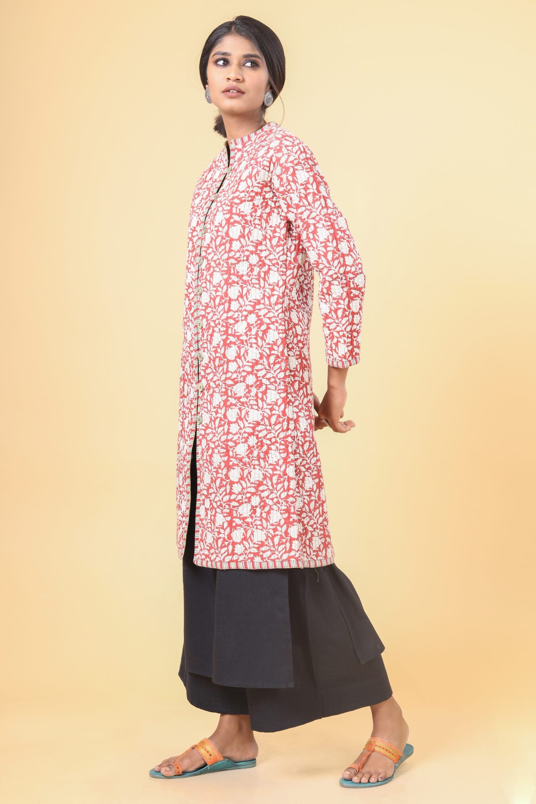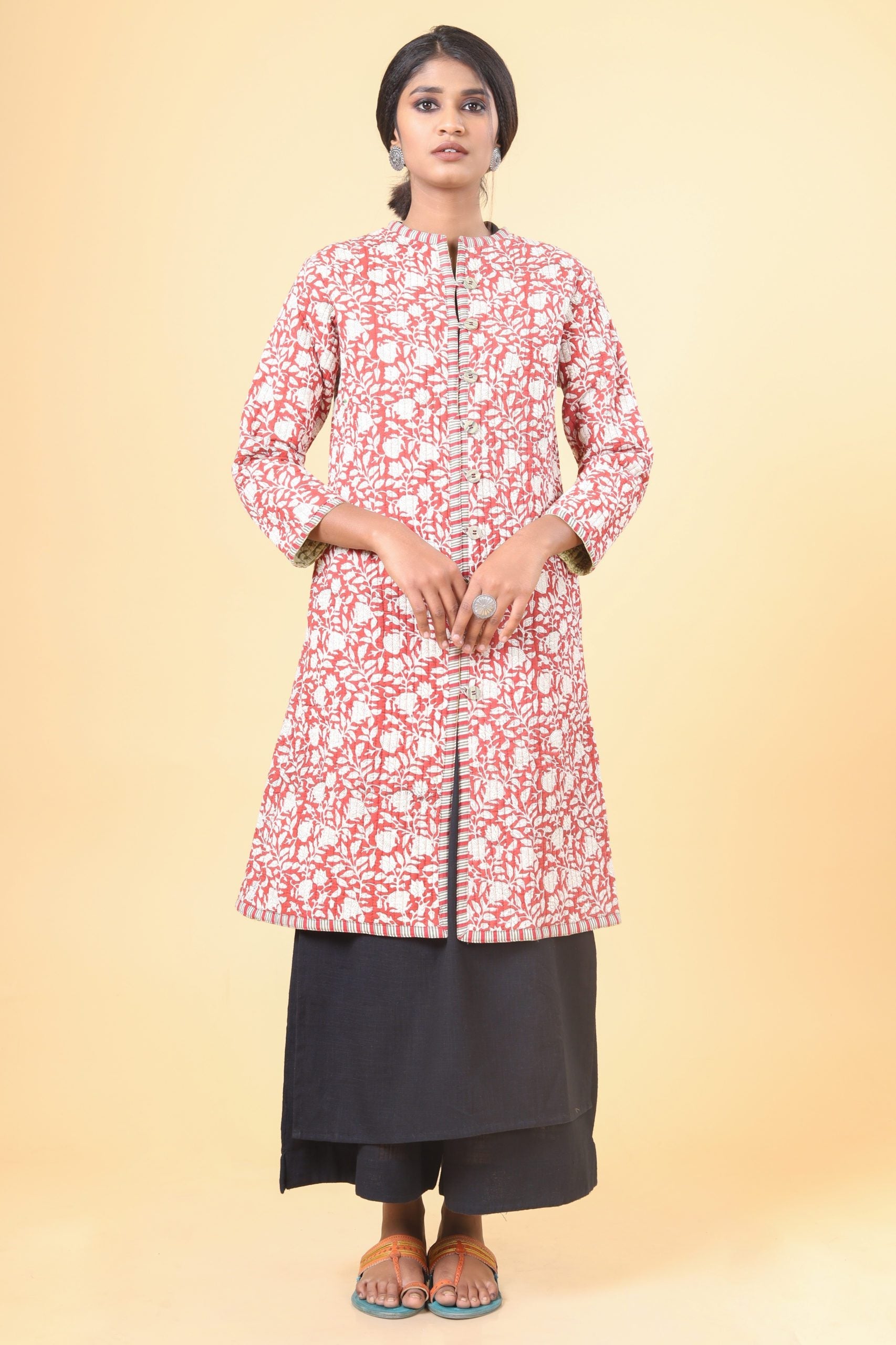 Cobalt blue with a combination of monarch orange floral parrot printed Nehru style cotton quilted half jacket with a wooden button-down, a Chinese collared jacket. All season wear.