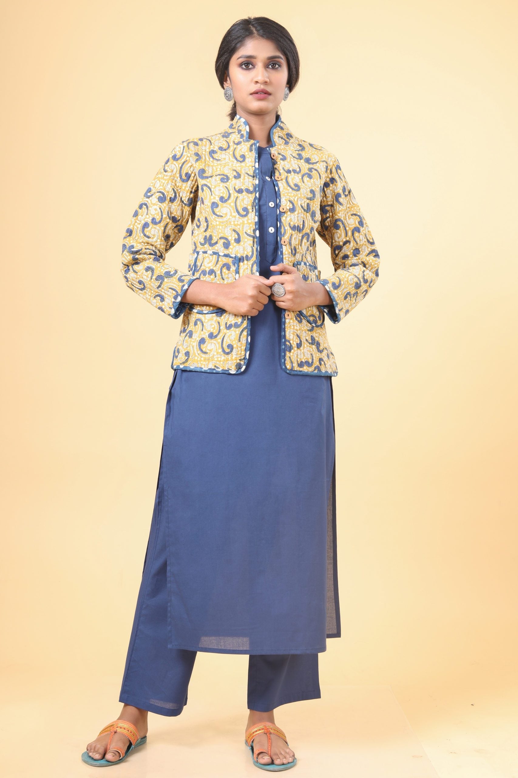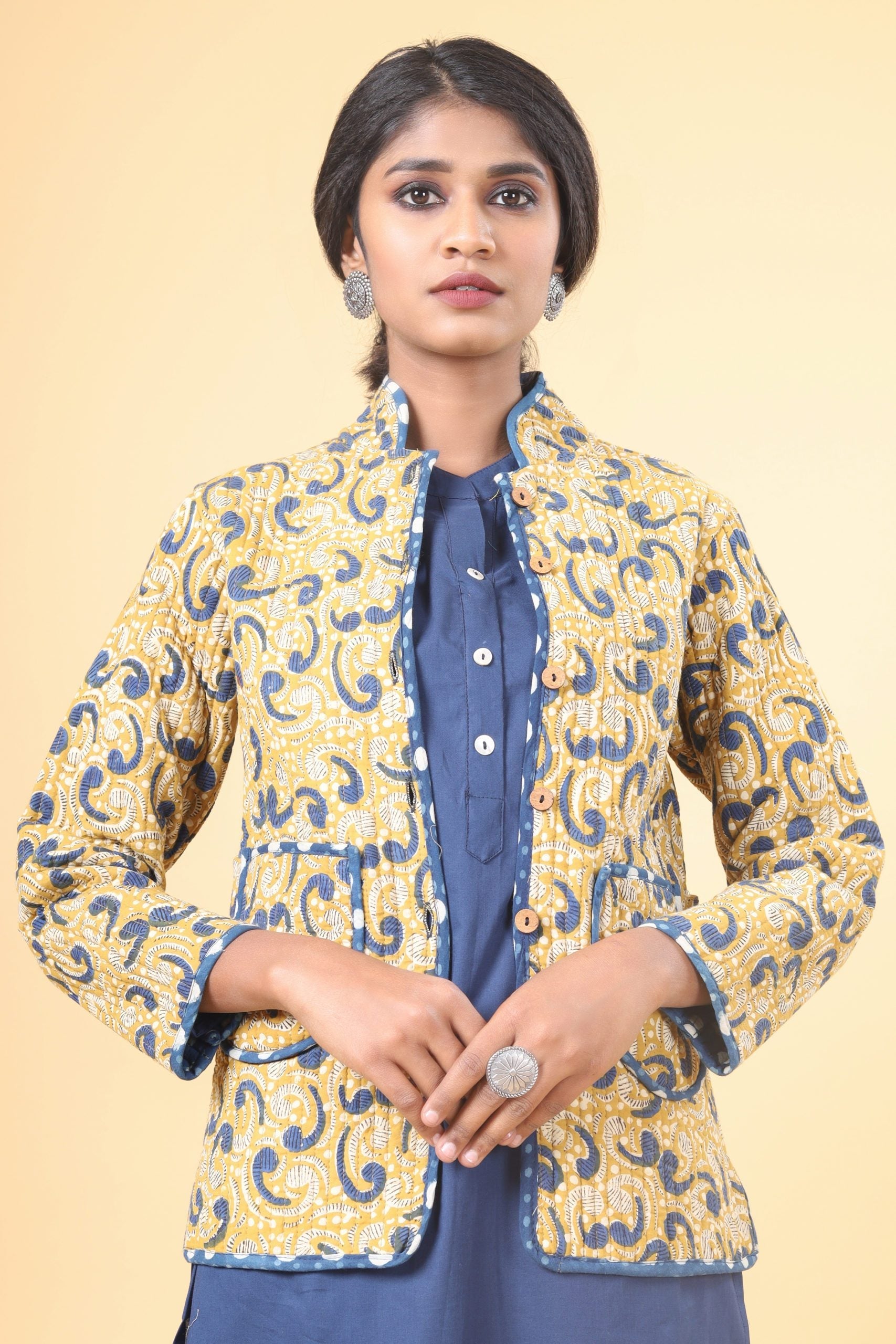 Canary Yellow With Indigo Short Cotton Quilted Jacket