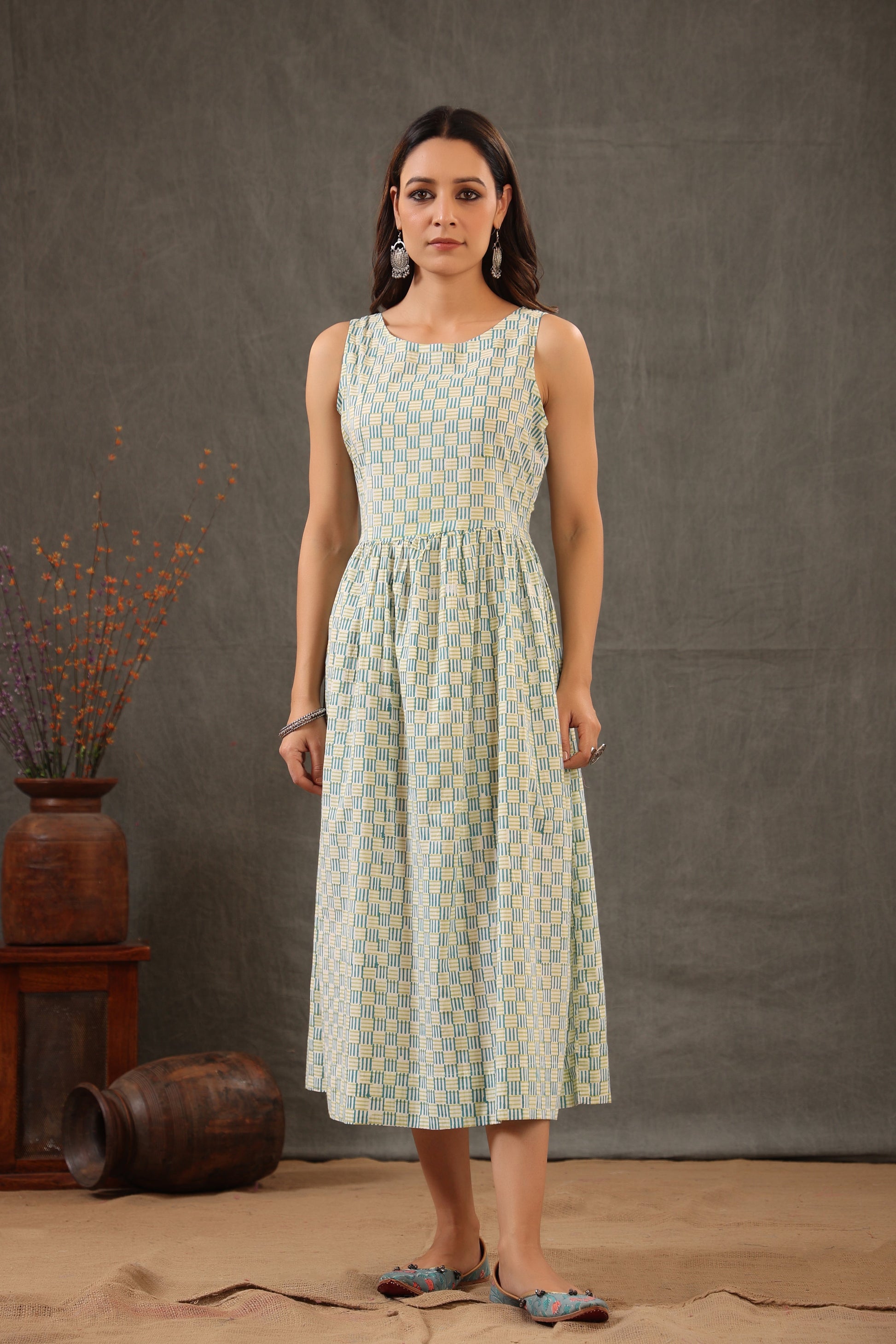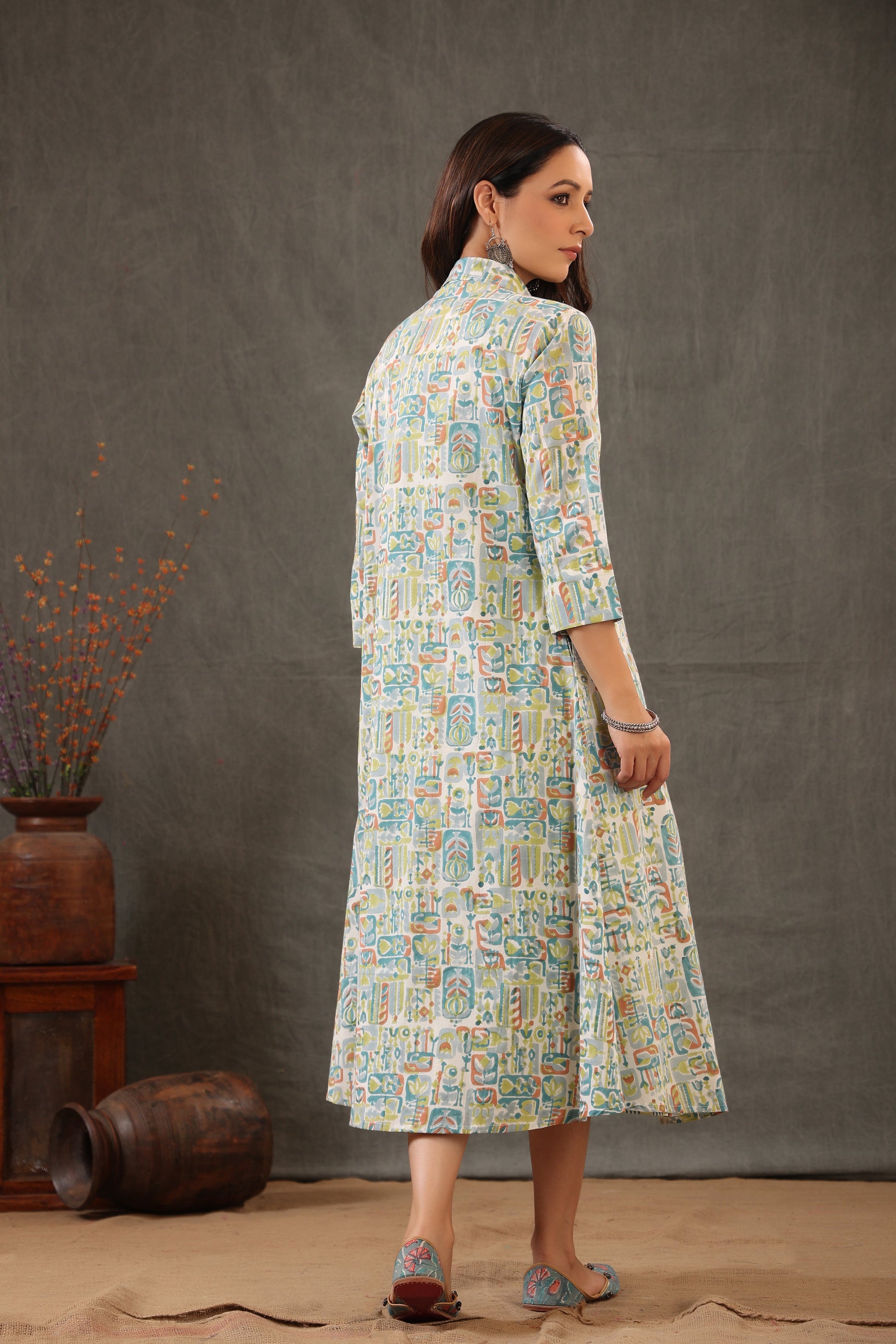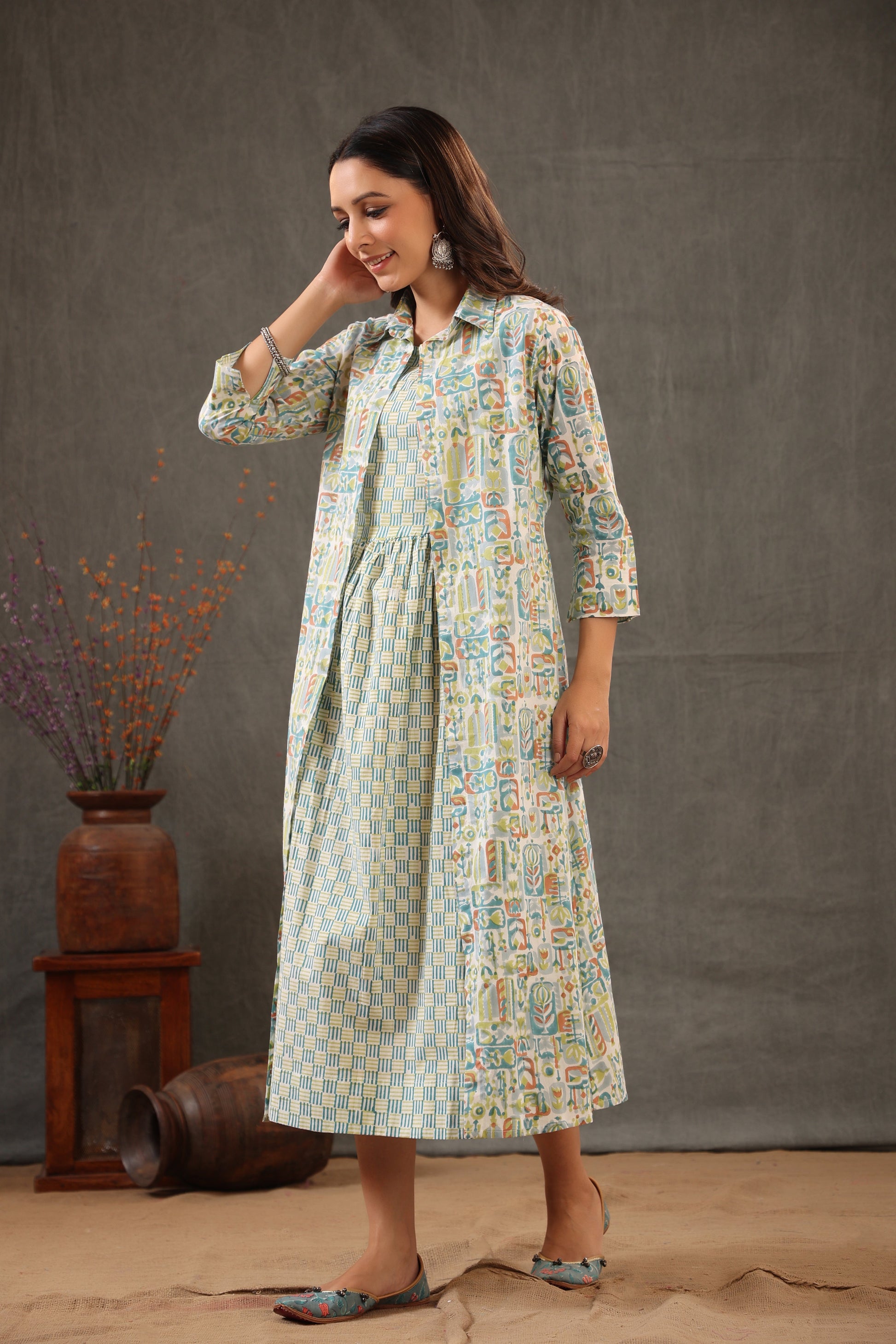 A cotton cape double layered dress. This garment is handcrafted design to flaunt the Indian Aesthetic blend with the new era of fashion. Crafted in supreme quality cotton fabric. It features 3/4th sleeves , round neck with side pockets. A comfortable design that blends in subtle charm and comfort. By wearing this stunner of a look from shuddhi. Pair it with juti or Kolhapuri for perfect look.