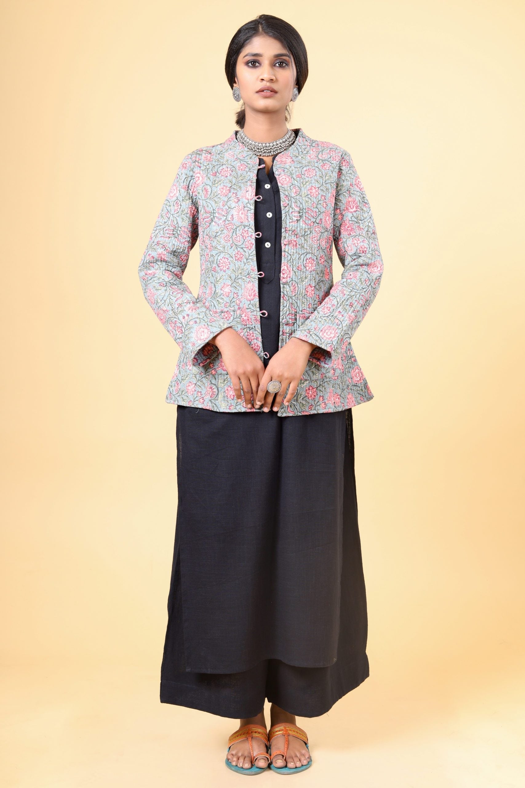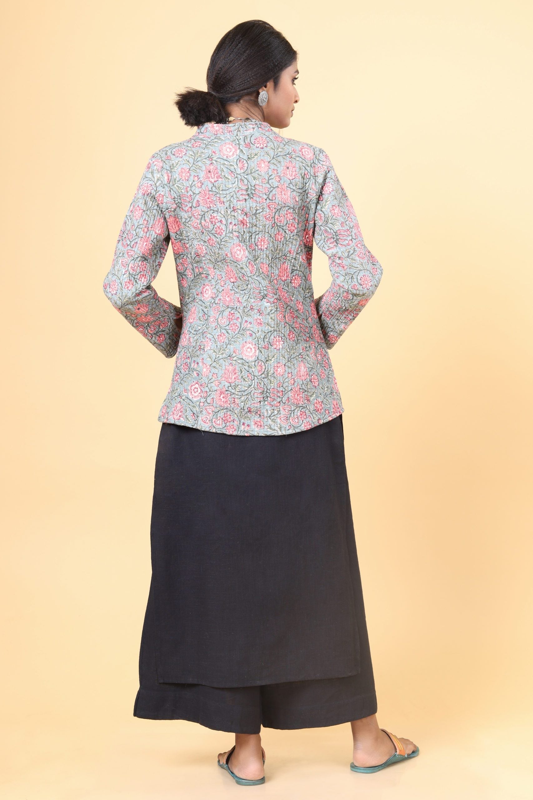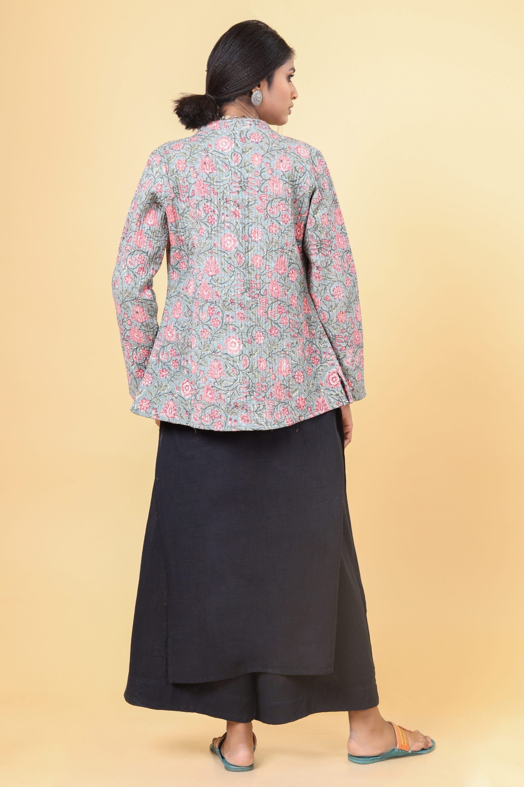 Cloud Grey with the combination of salmon pink and ruby pink floral hand-block printed with Chinese collar and button down cotton quilted reversible short jacket.