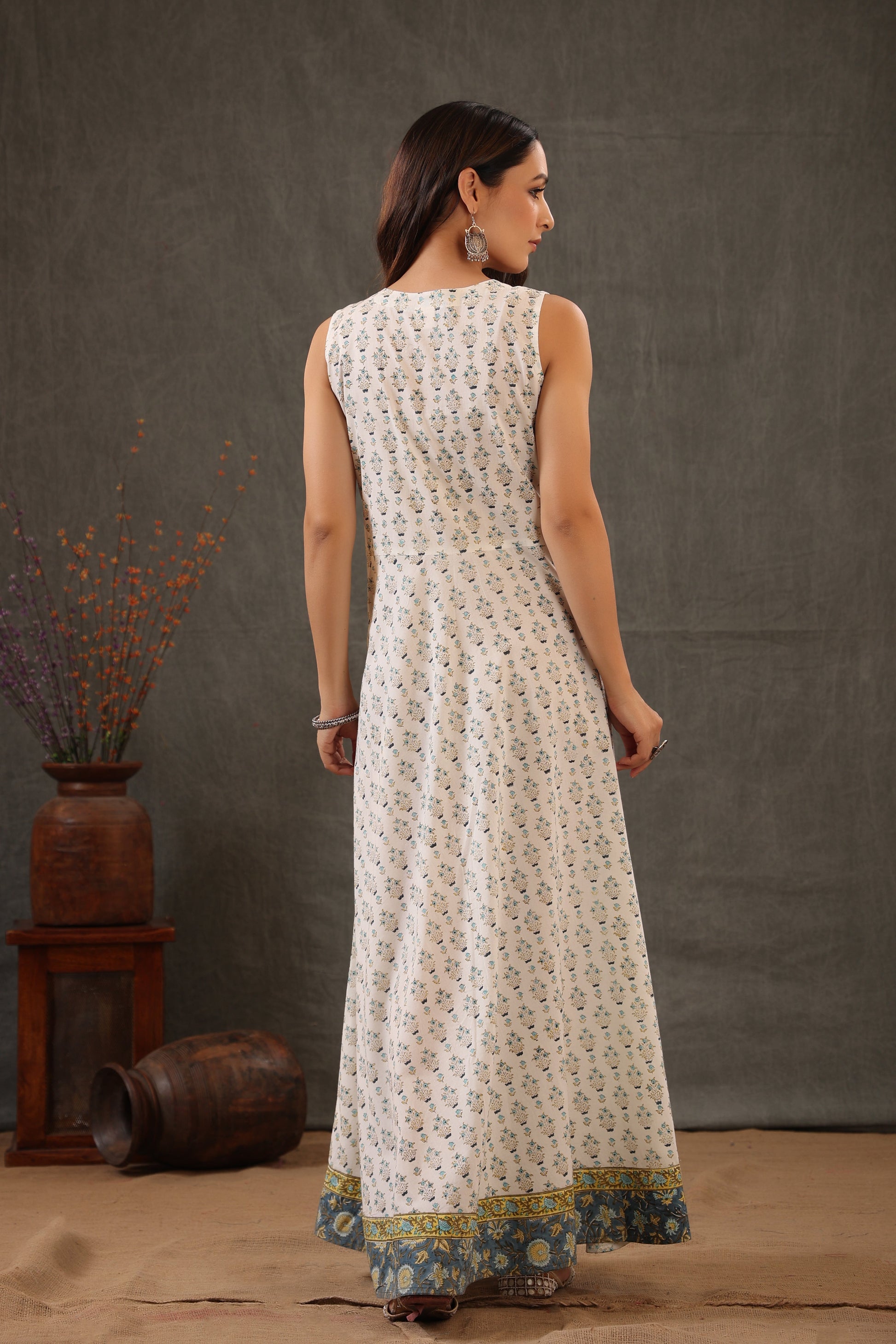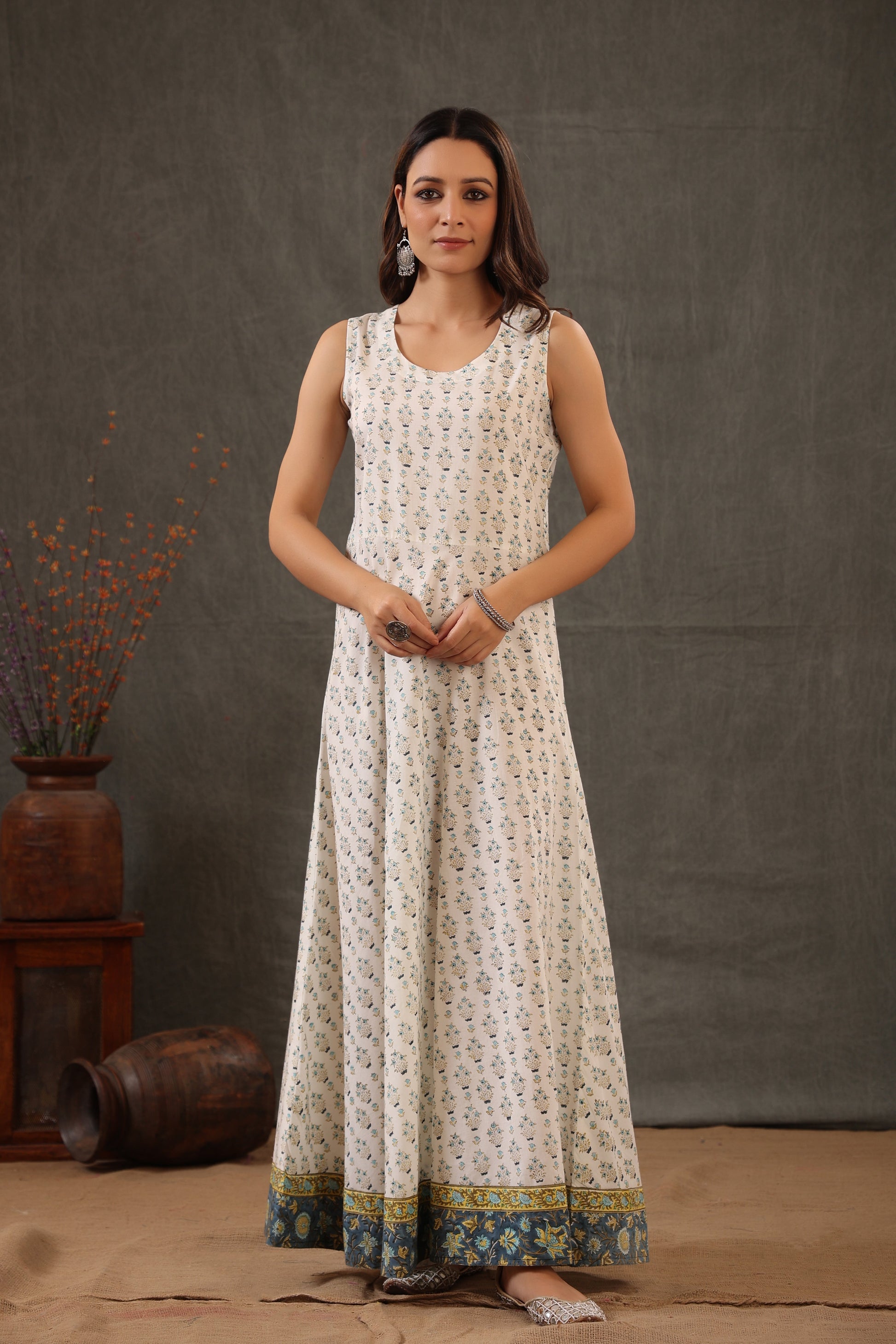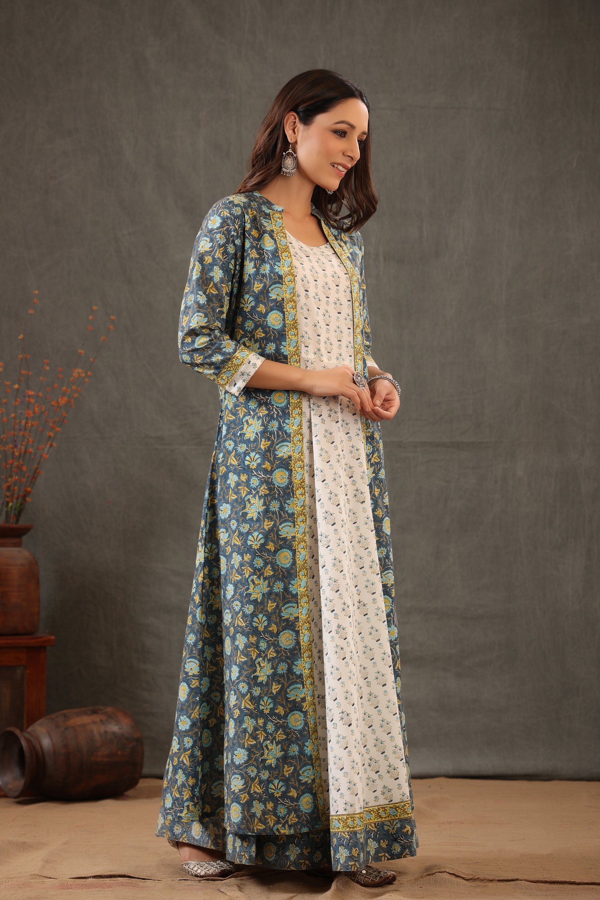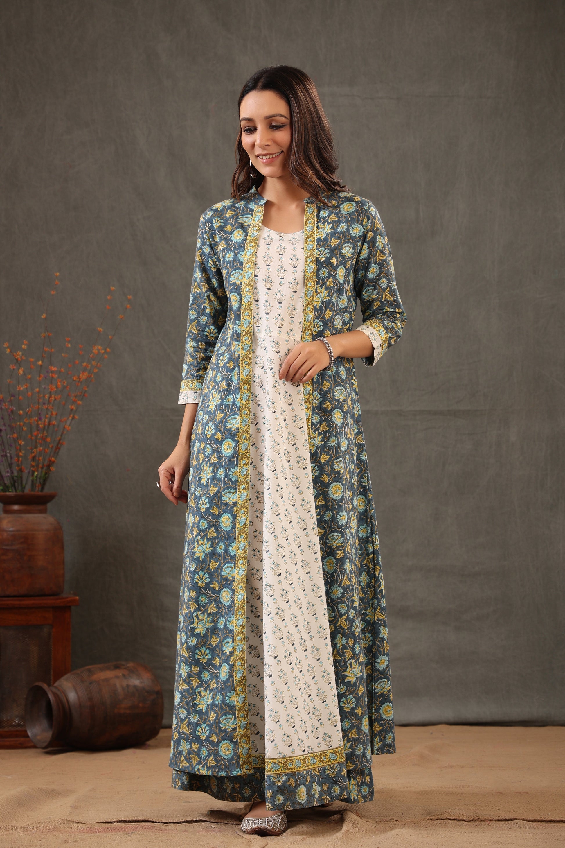 A cotton cape double layered dress. This garment is handcrafted design to flaunt the Indian Aesthetic blend with the new era of fashion. Crafted in supreme quality cotton fabric. It features 3/4th sleeves , round neck with side pockets. A comfortable design that blends in subtle charm and comfort. By wearing this stunner of a look from shuddhi. Pair it with juti or Kolhapuri for perfect look.
