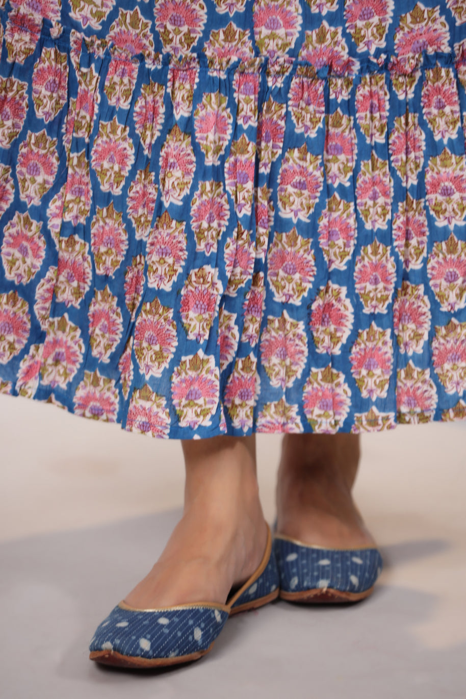 Our Classic Cobalt Blue Coord Set Comes With A Single Tier Skirt And A Blouse With Puffed Sleeves With Floral Motifs And Combination Of Purple, Pink And Green Hues Adding To Its Ellegance
