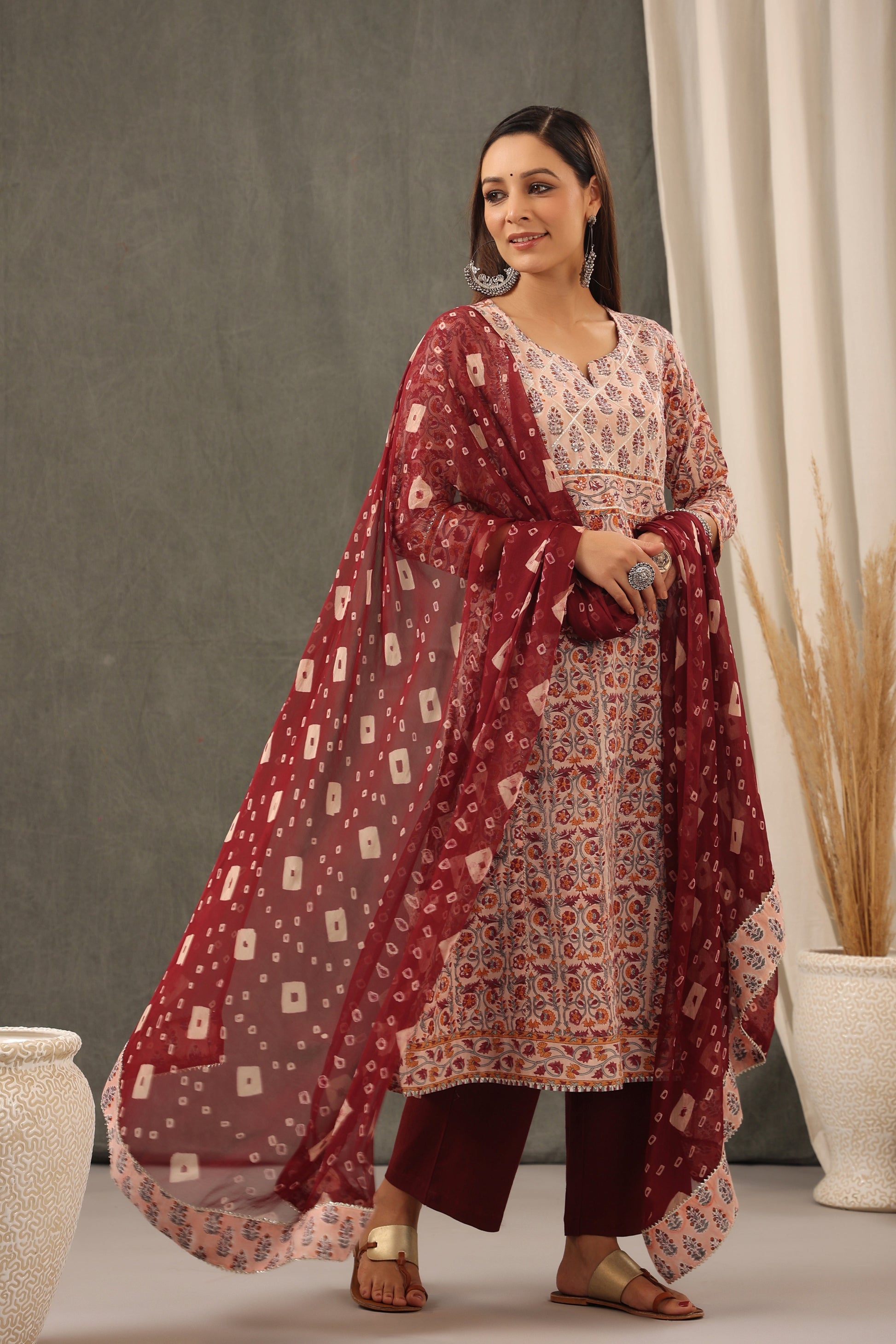 Our classic coral red handblock printed floral kurta, comes with the combination of garnet red and tangerine. Handcrafted in soft cotton fabric. This gorgeous pieces comes adorn with careful hand-embroidered sequence detailing with gota work. Add to the allure.