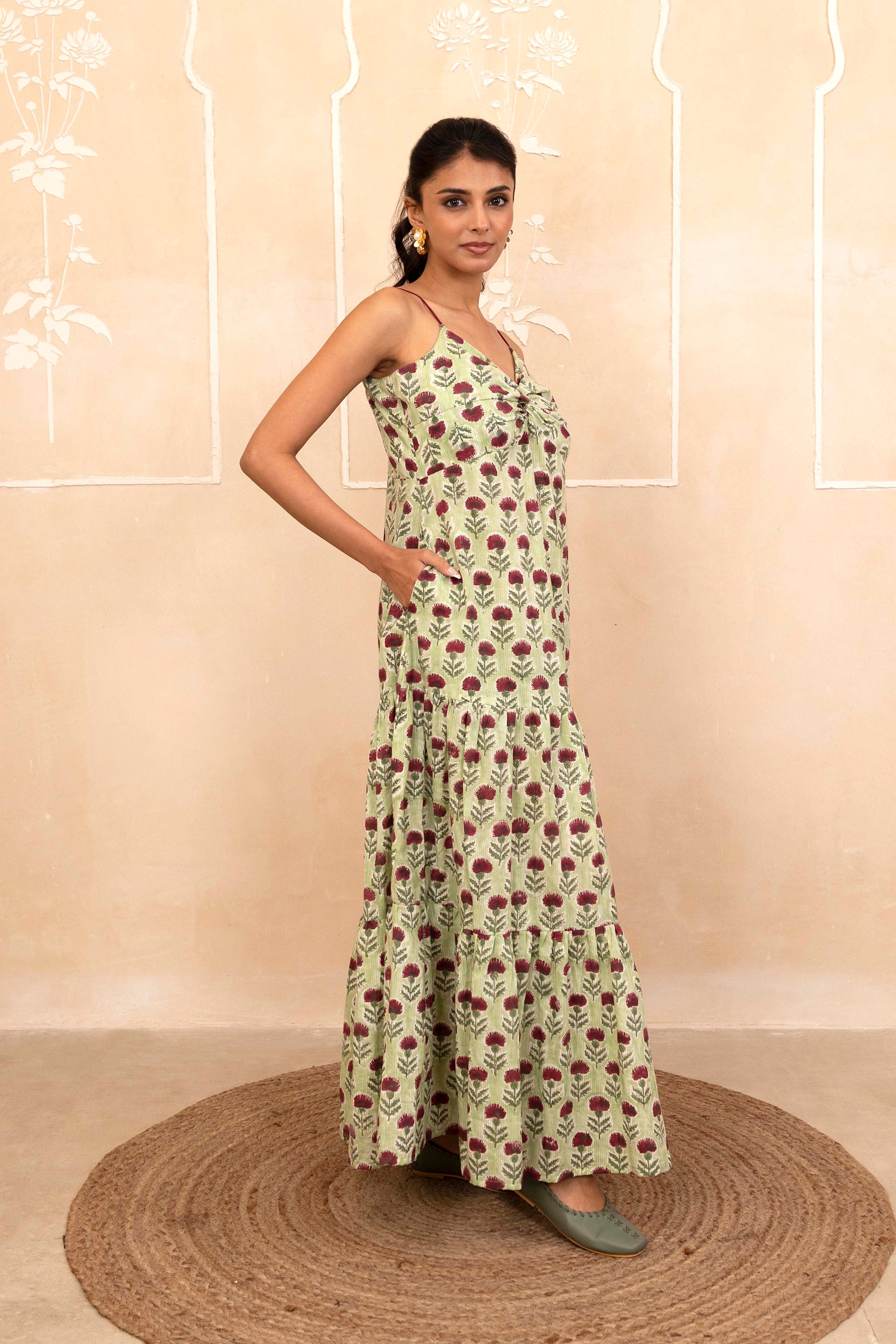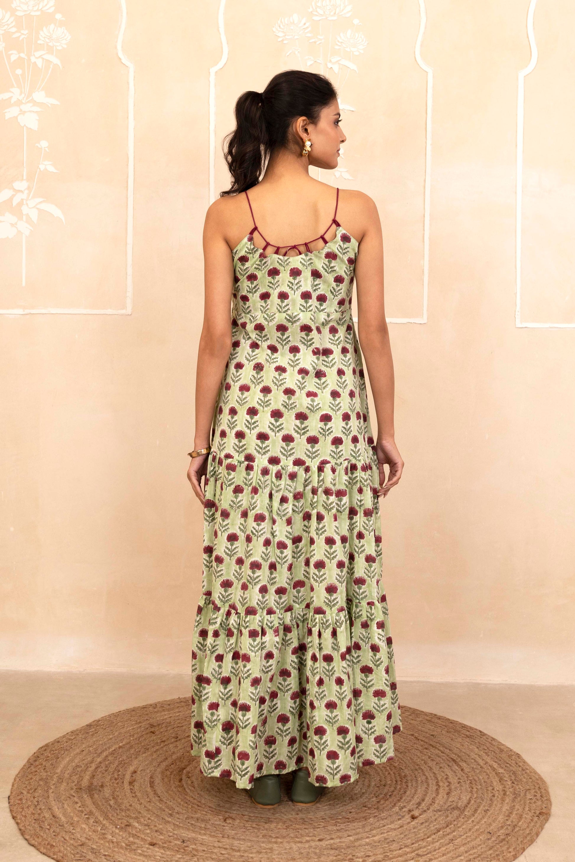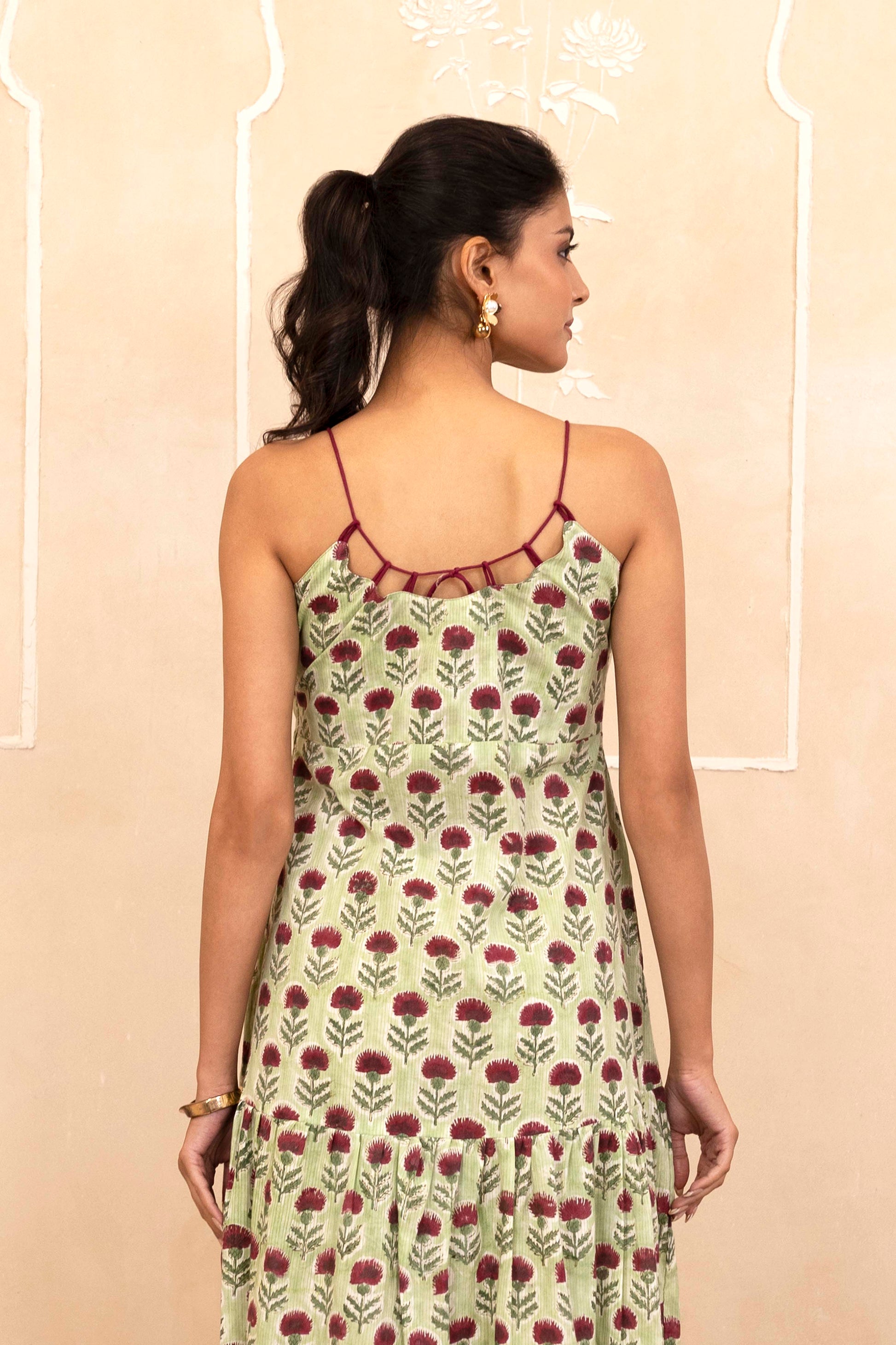Fresh and flowy, this mint green handblock-printed spaghetti dress features maroon floral motifs that lend a touch of earthy elegance. Designed with a gathered bust detail and adjustable string-back for a flattering fit, the tiered silhouette adds effortless movement. Lightweight and breathable, it’s a perfect pick for sunny days, vacations, or casual gatherings with a hint of tradition.