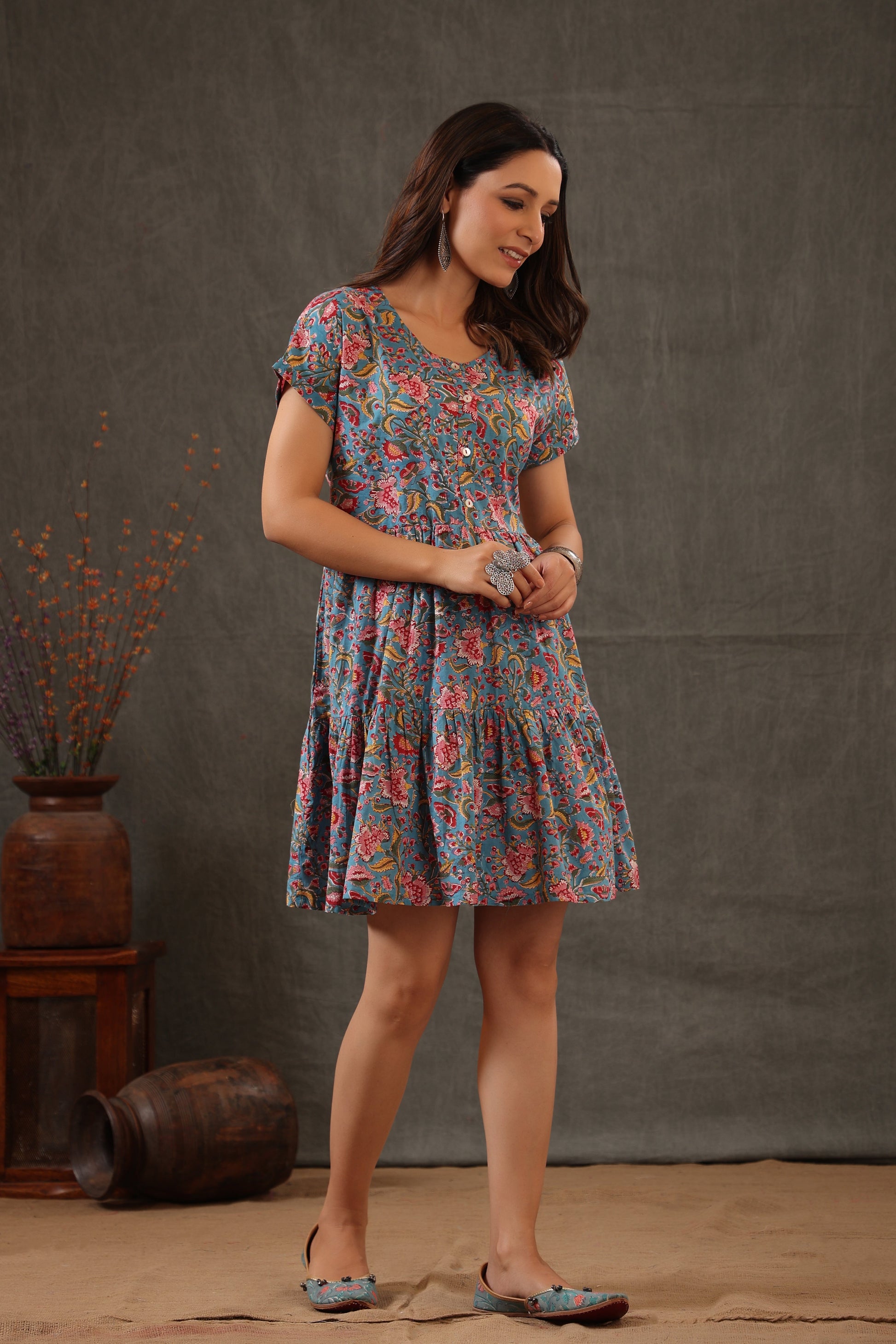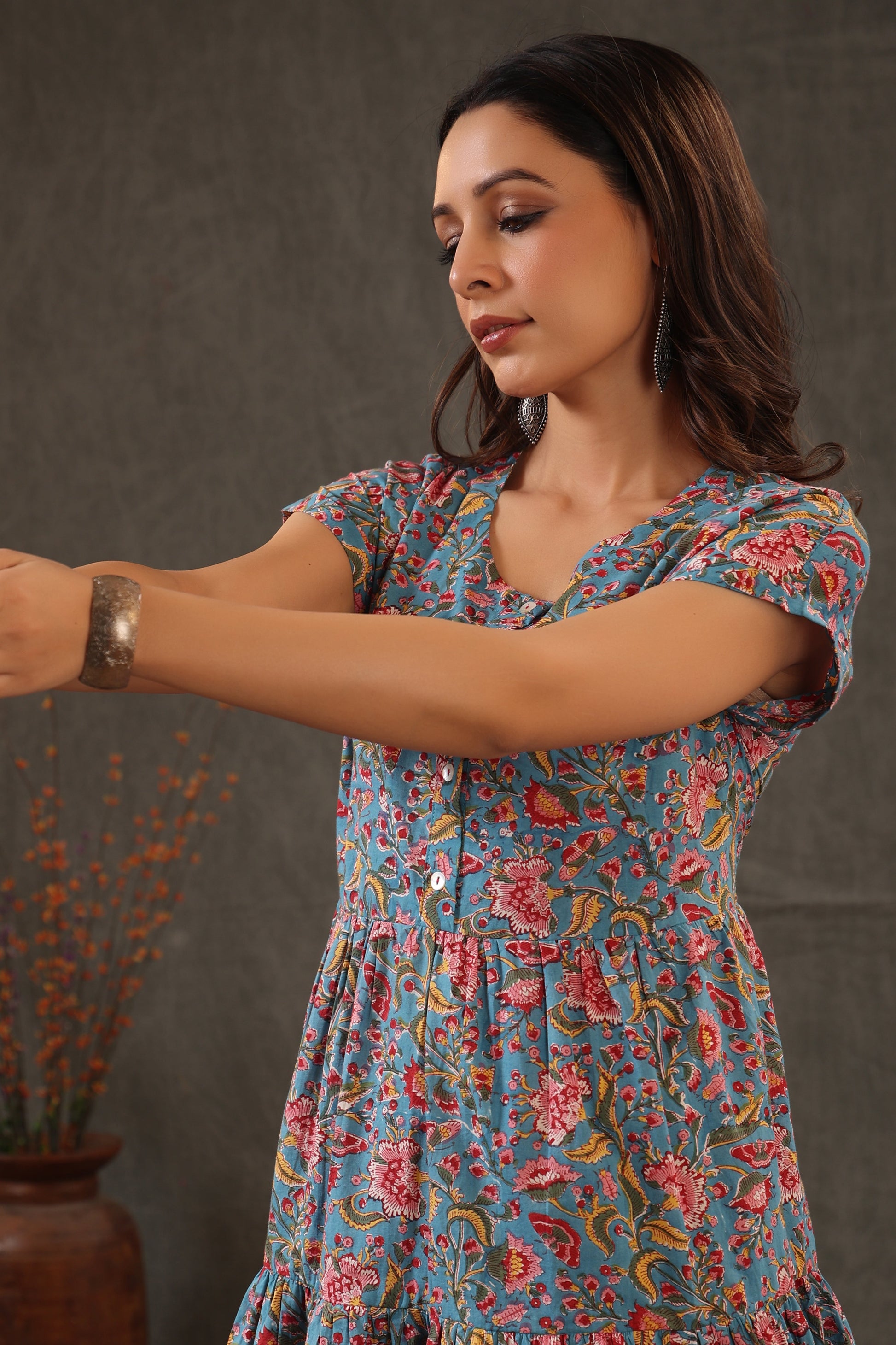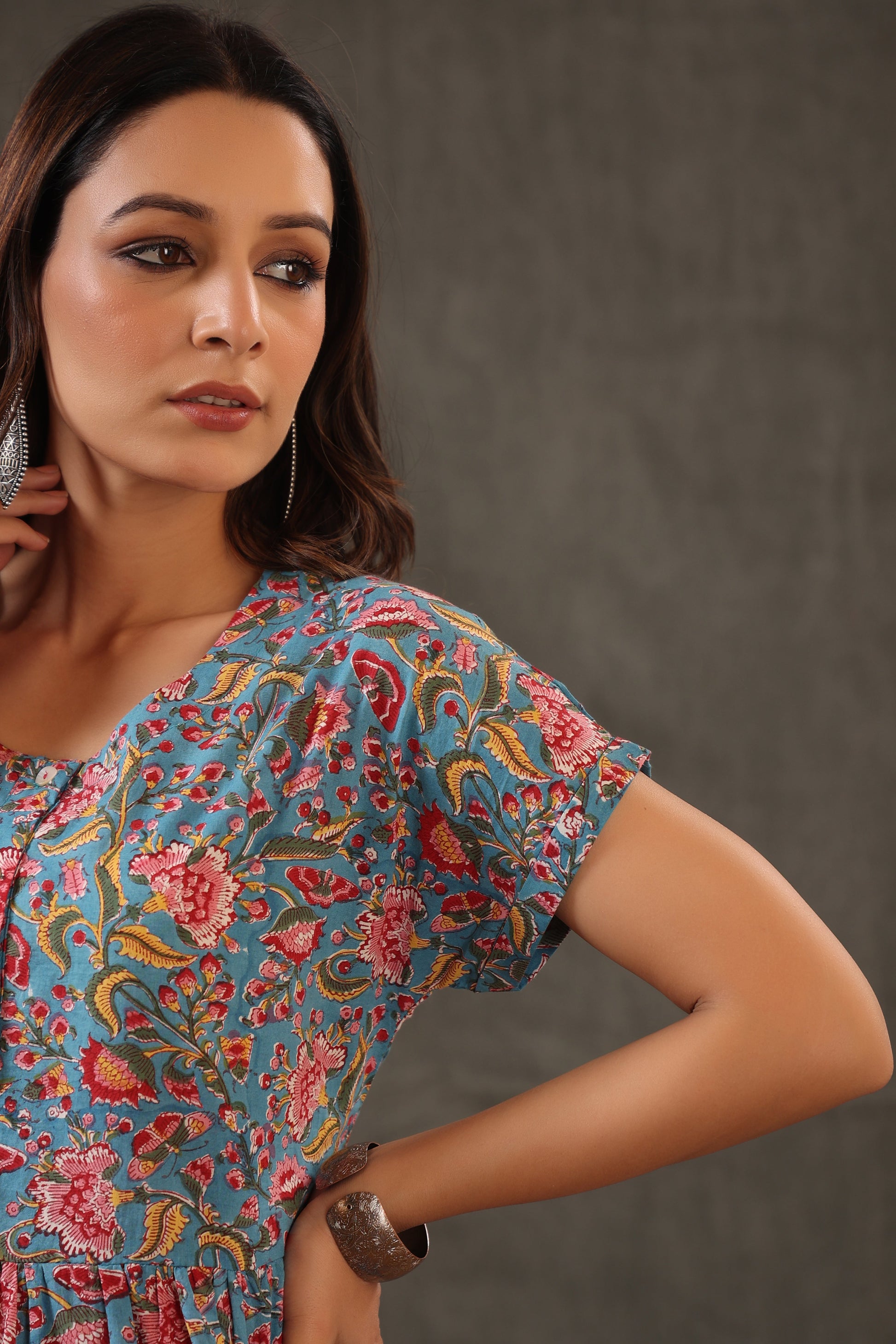 Our classics floral cyan blue with combination of scarlet red and yellow tone, comes with a button down look in soft cotton fabric.