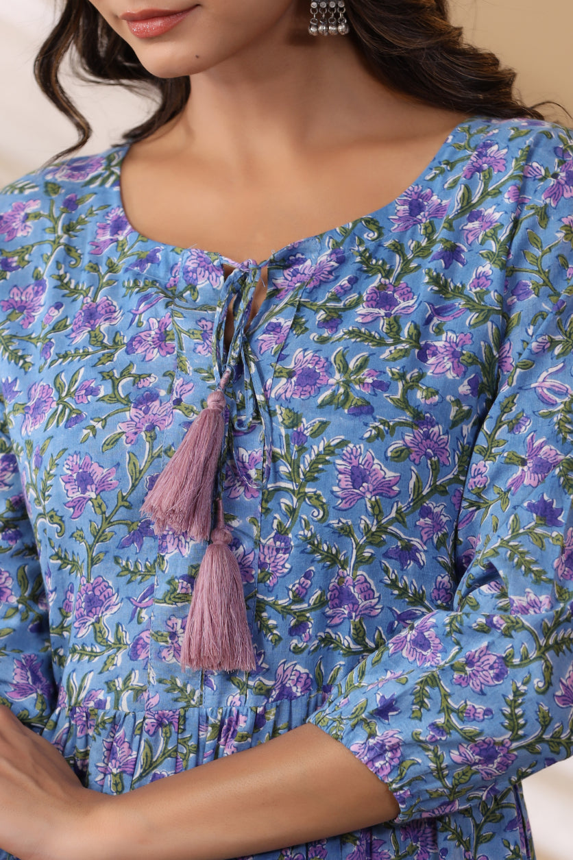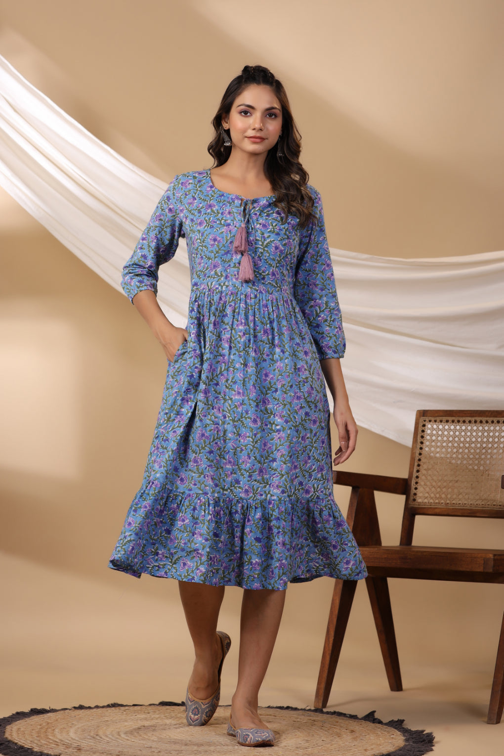 Our Timeless FLORAL CYAN BLUE TIER DRESS Comes with a Combination of Cyan with Green, Made With Soft Cotton Fabric for Chic Look