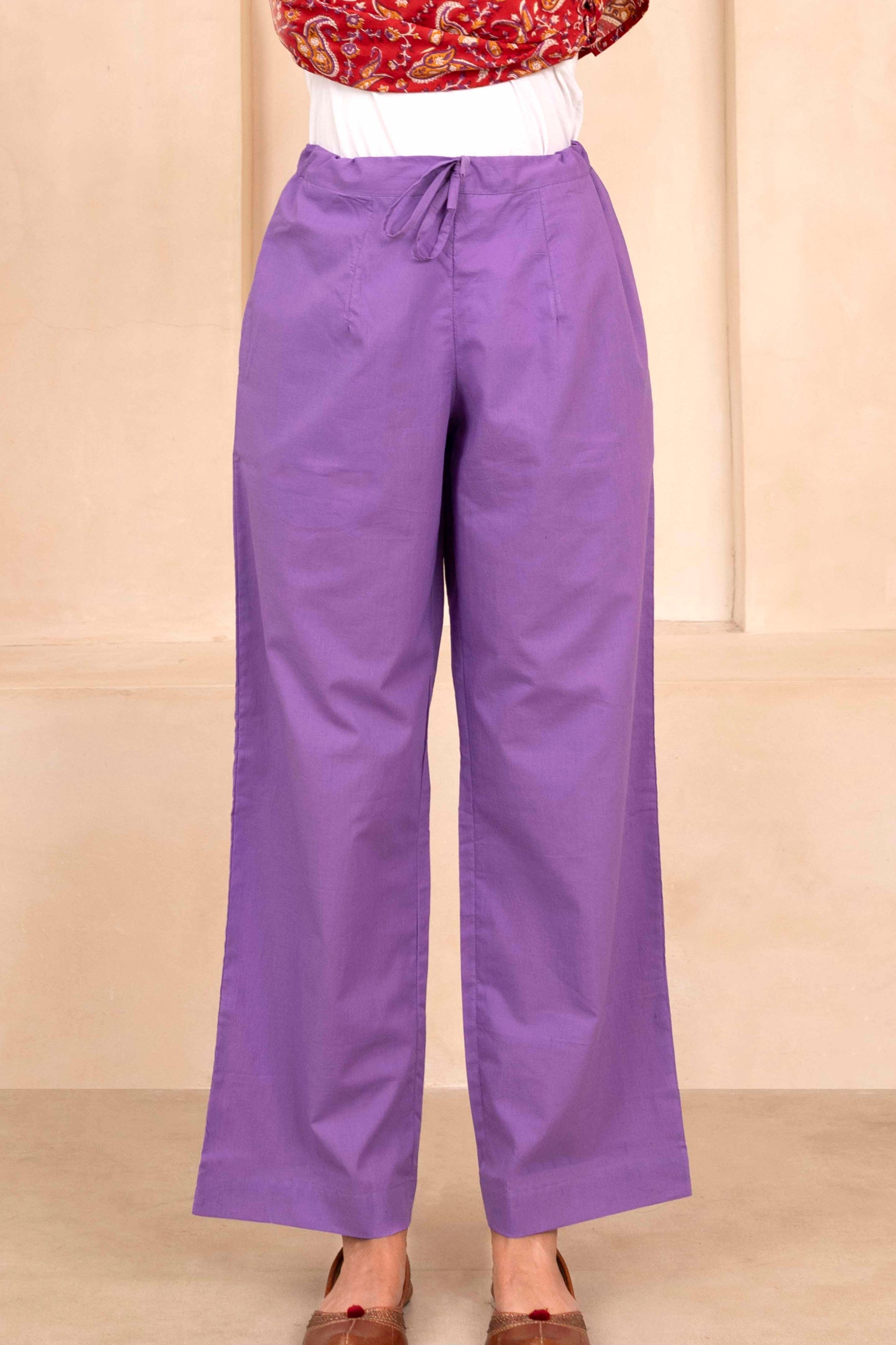 These lavender cotton palazzo pants bring a soft pop of color to your wardrobe with their airy, relaxed silhouette. Designed with a front tie and elasticated waistband, they offer all-day comfort and easy movement—perfect for casual elegance.