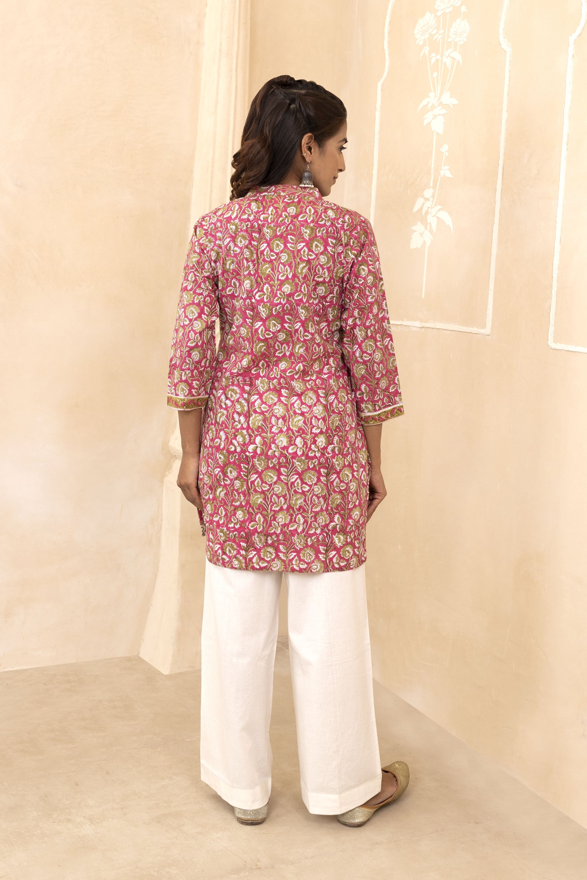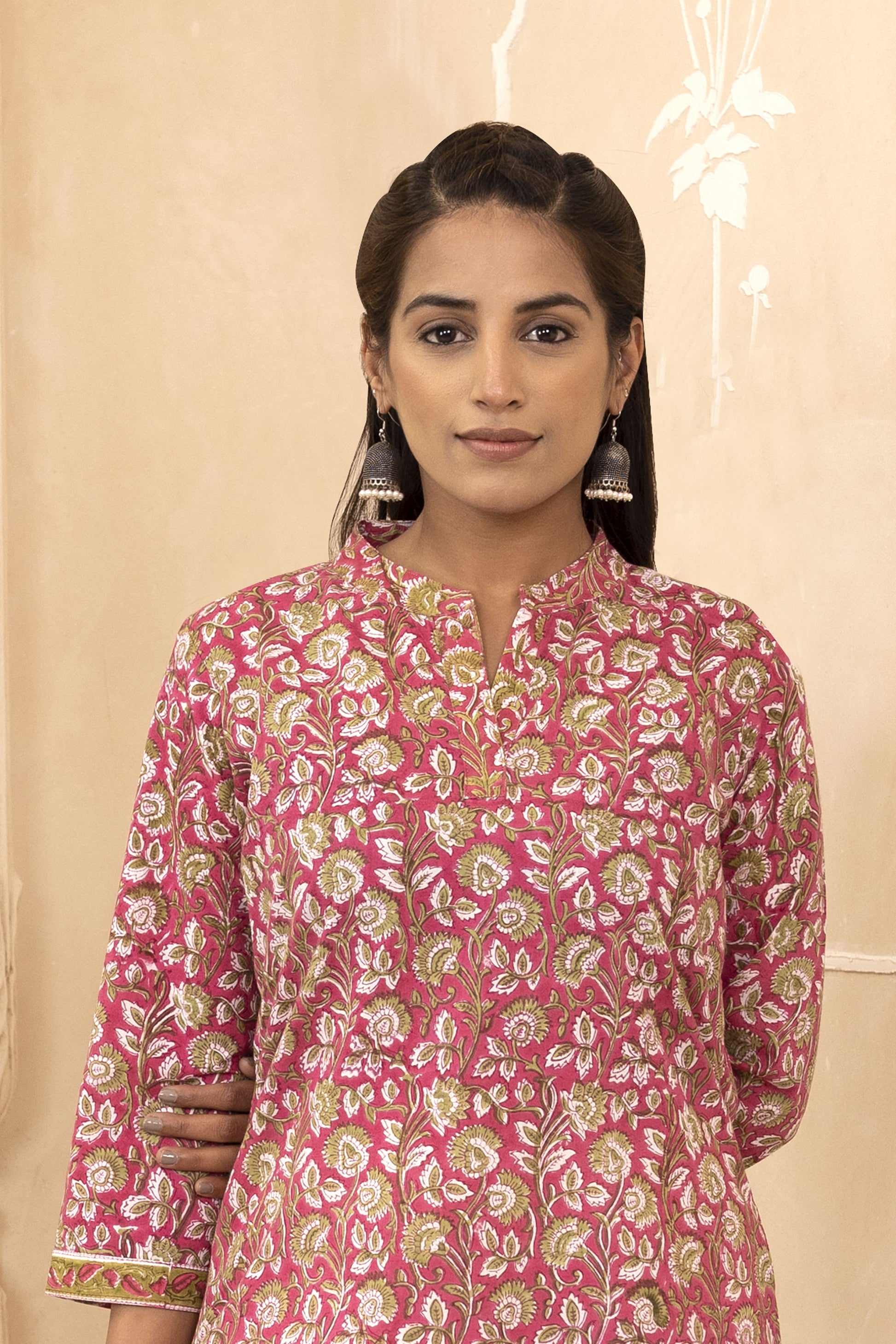 This vibrant handblock-printed Short Kurti features a bold raspberry pink base with intricate floral motifs in olive and white tones. Made from soft, breathable cotton, it has a relaxed silhouette with a slit neckline and 3/4th sleeves, blending tradition with everyday elegance. Perfect for effortless ethnic styling.