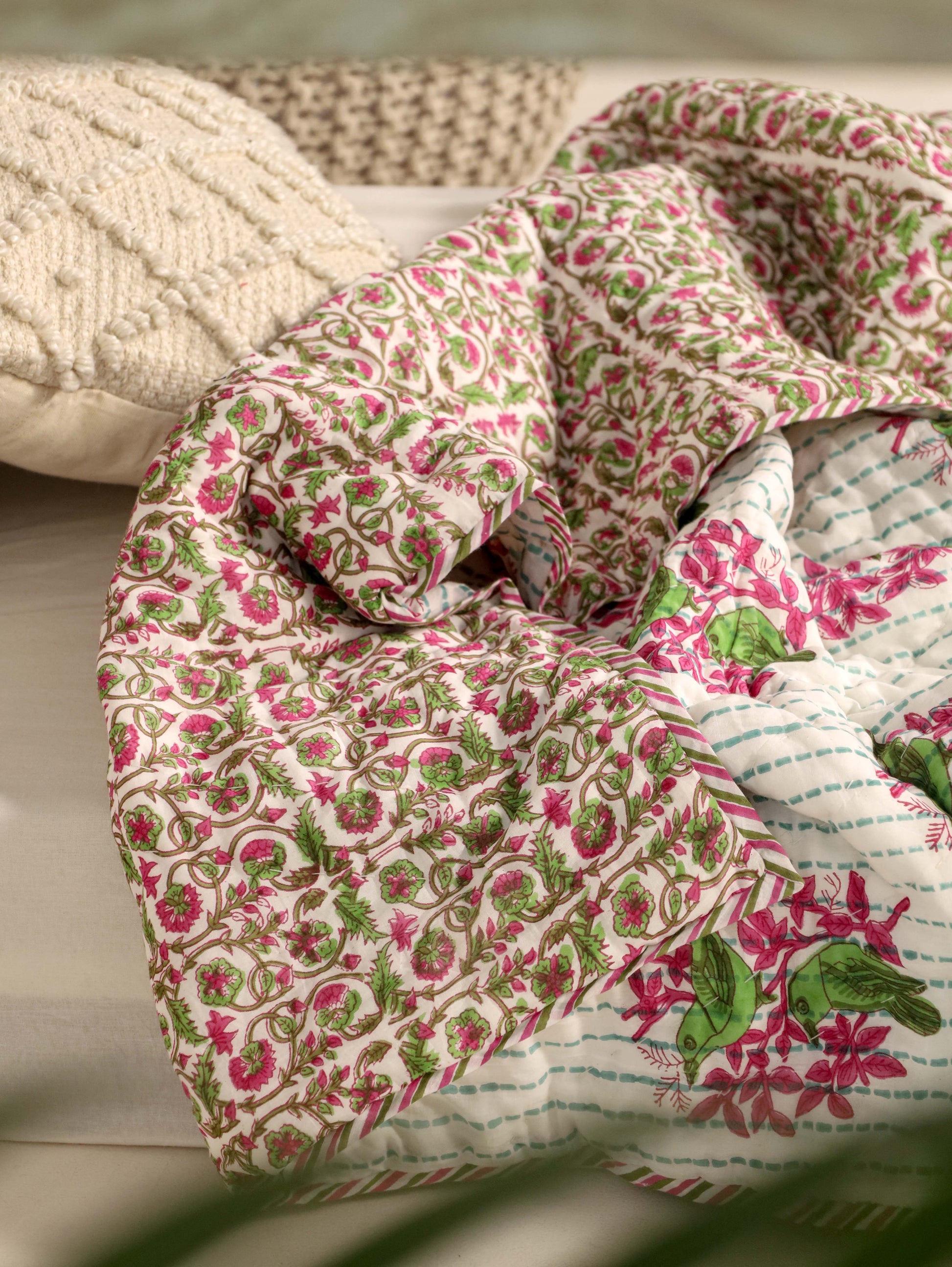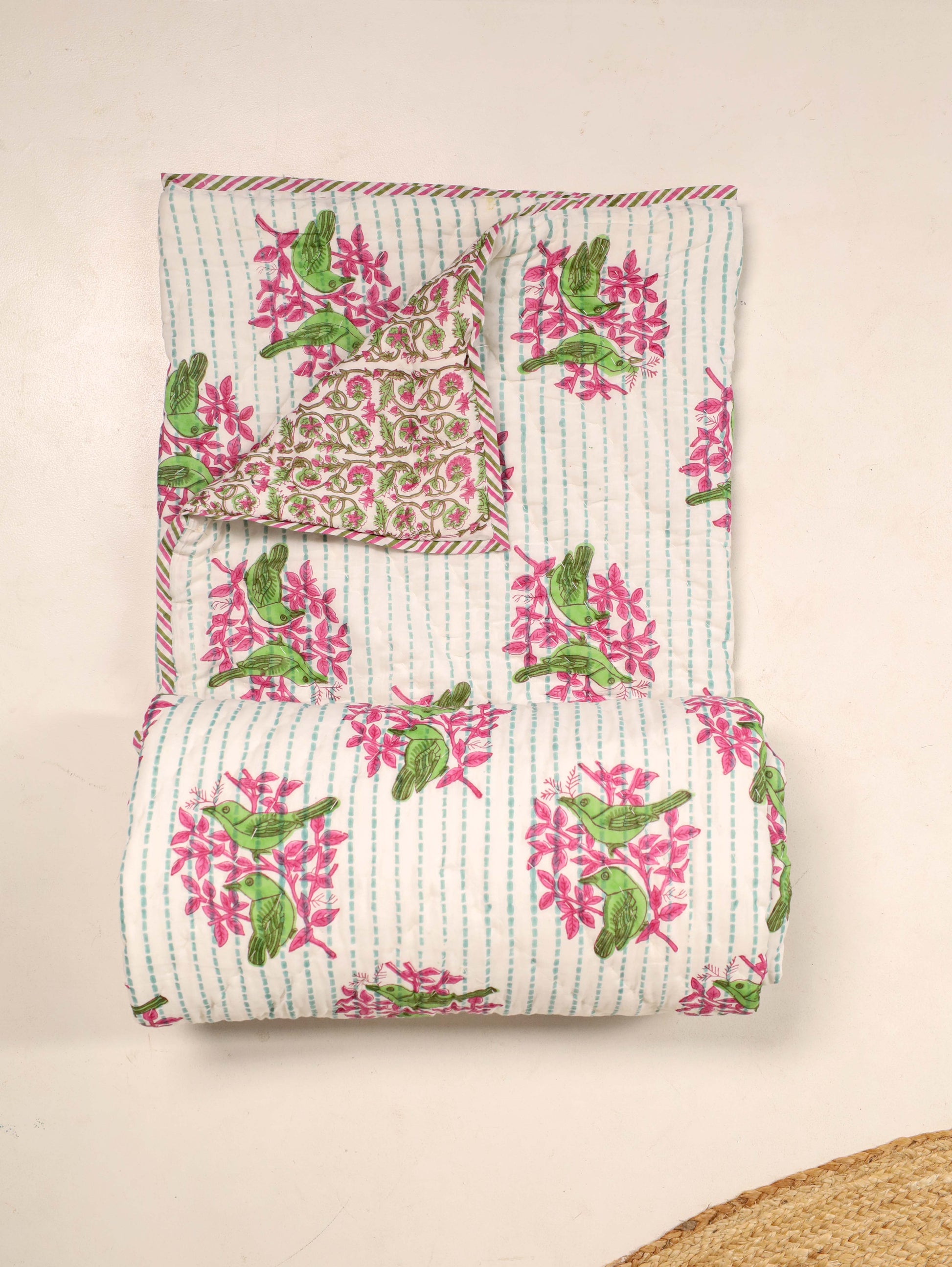 Green and Pink Single Bed Reversible Quilted Razai