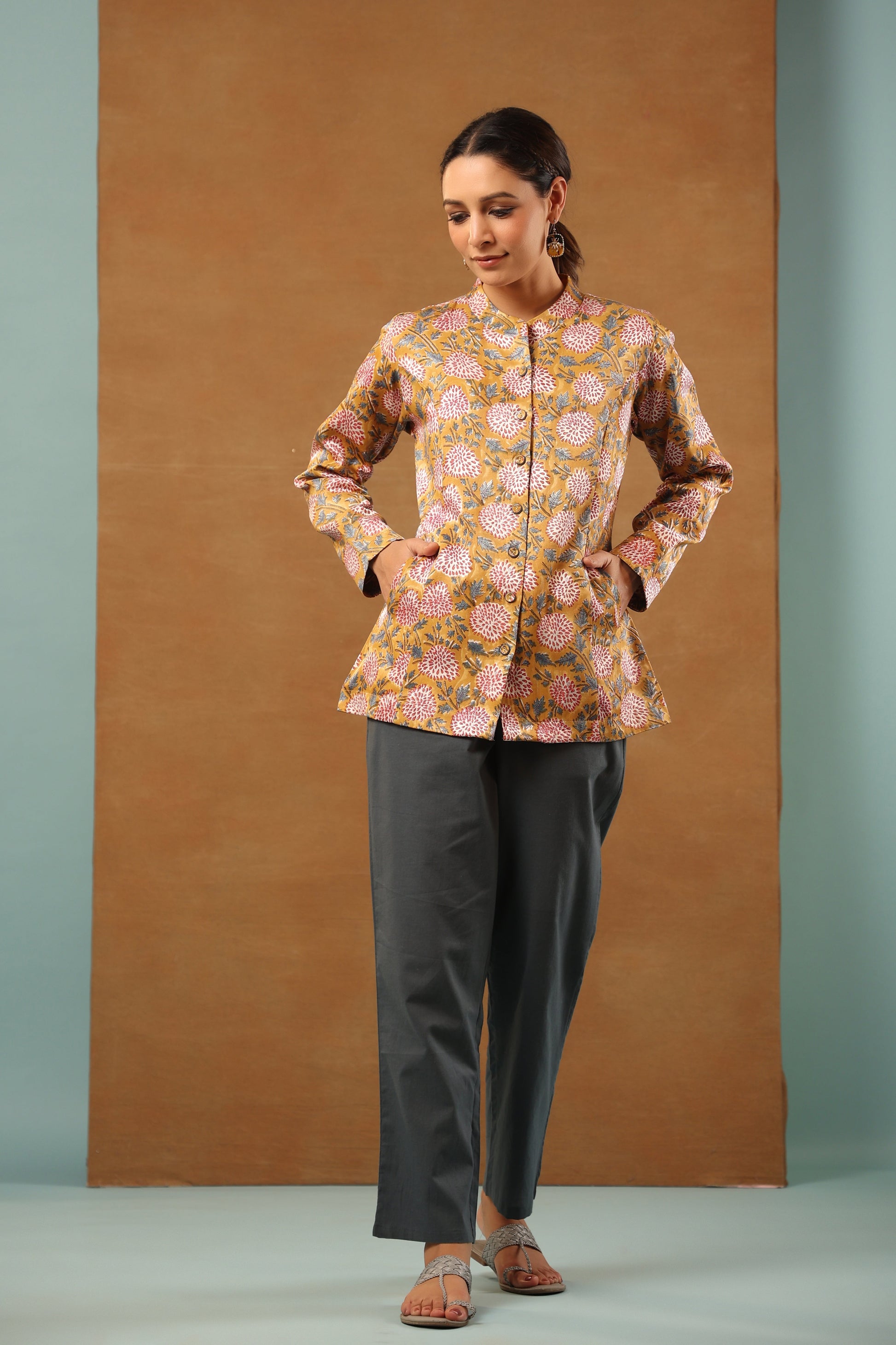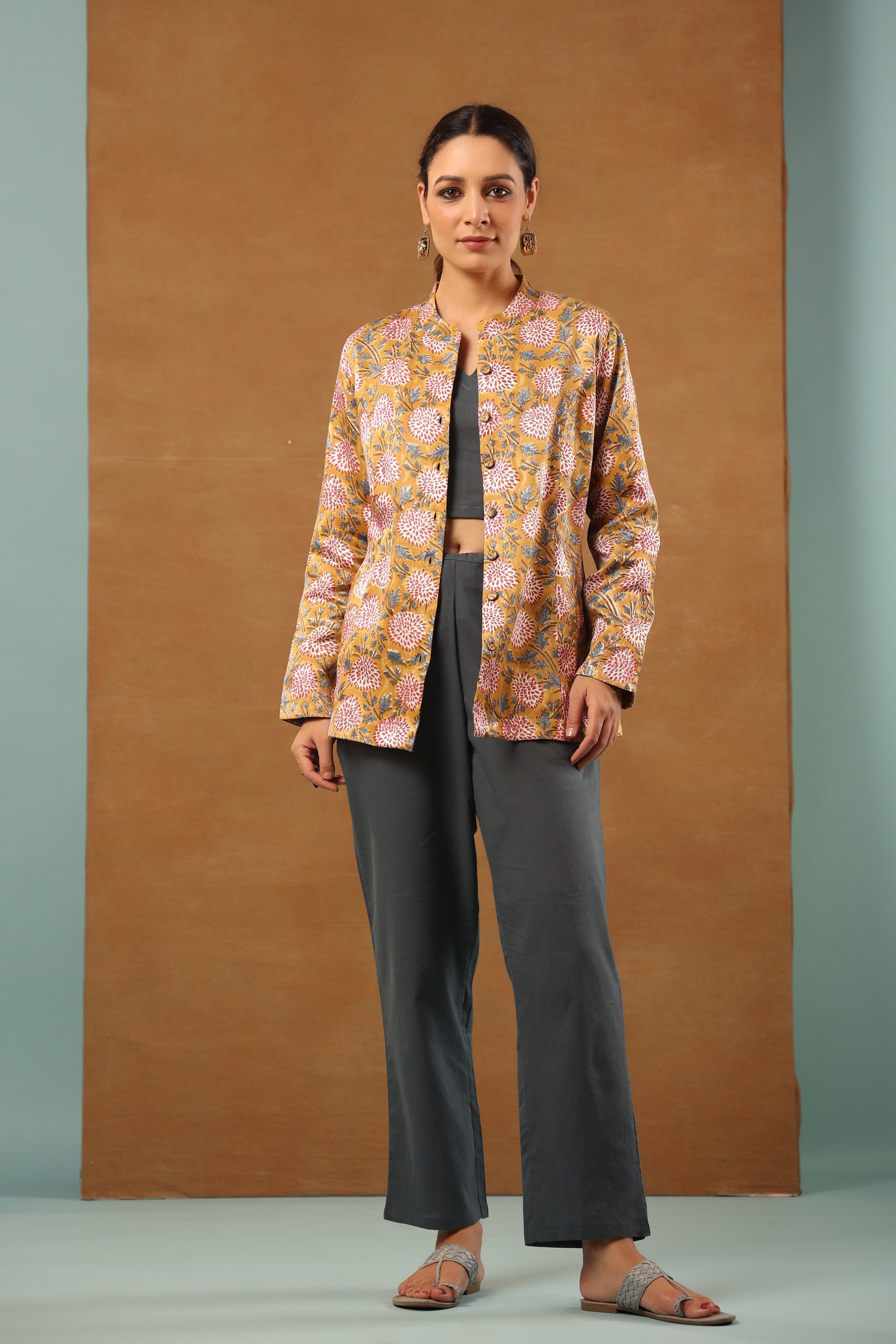 Our classic honey yellow mashru silk short jacket comes with a combination of apricot orange and white floral handblock printed. Mashru is a woven cloth that is blend of silk and cotton to keep it light and warm. Pair it with silk saree or pants, perfect for any occasion.