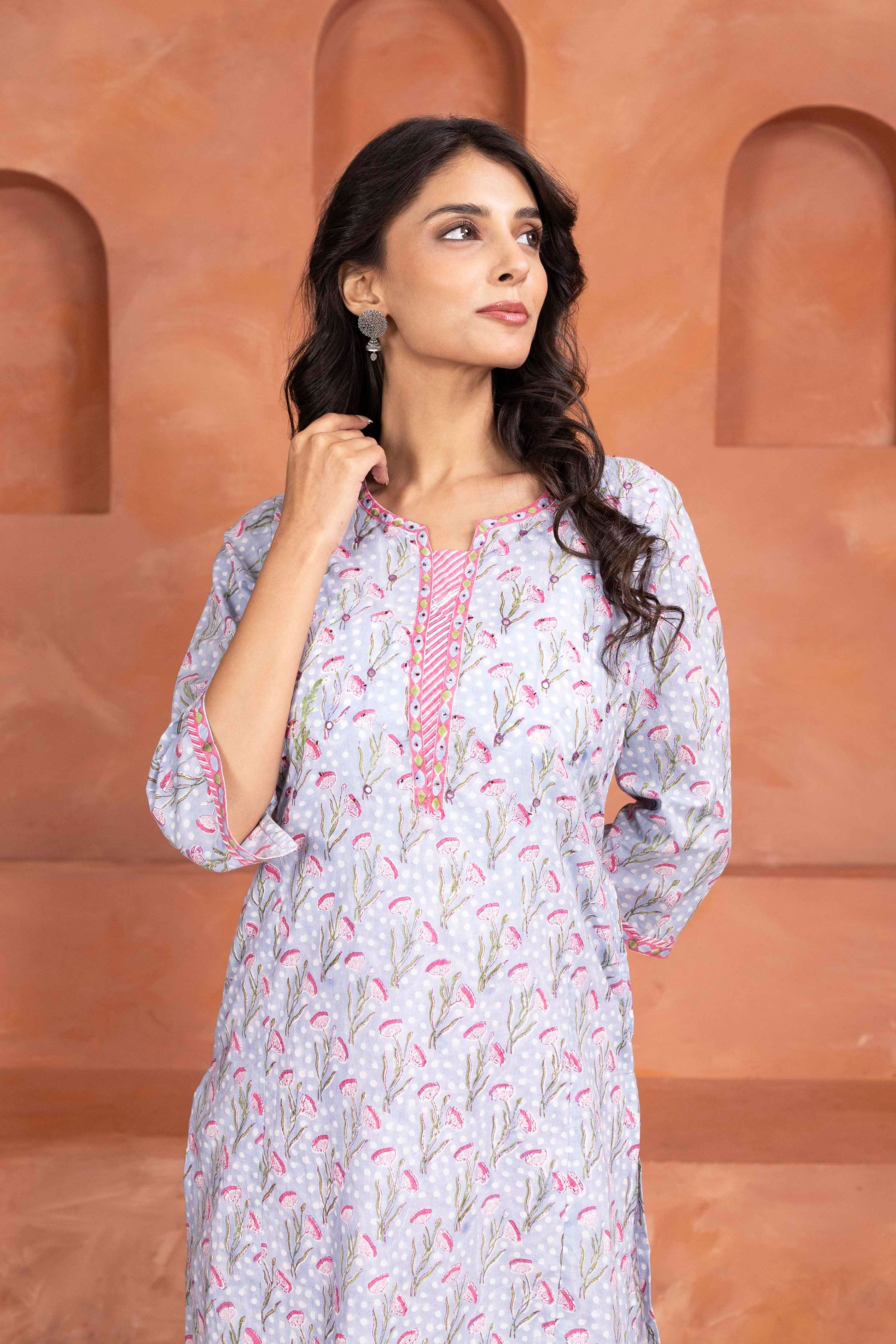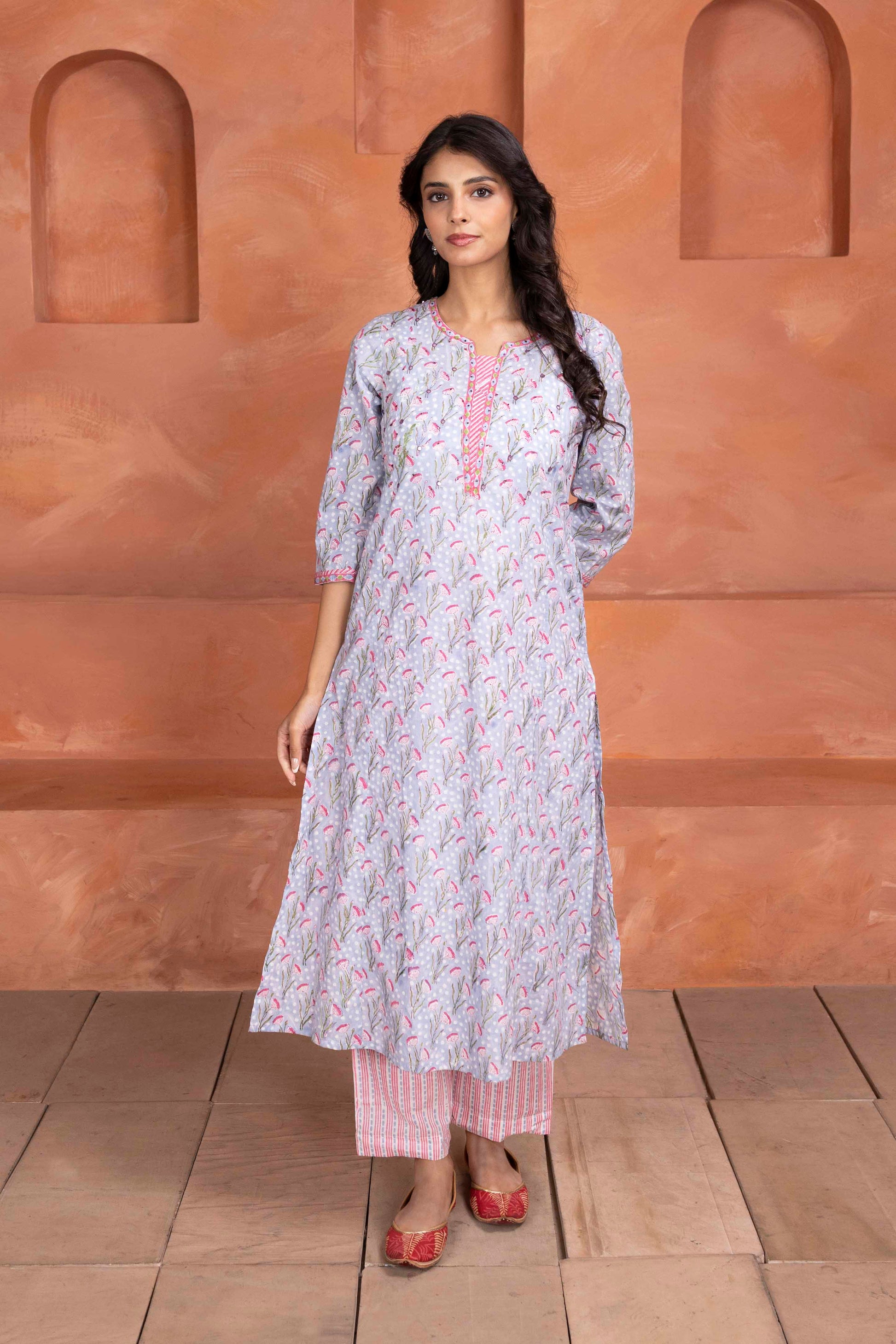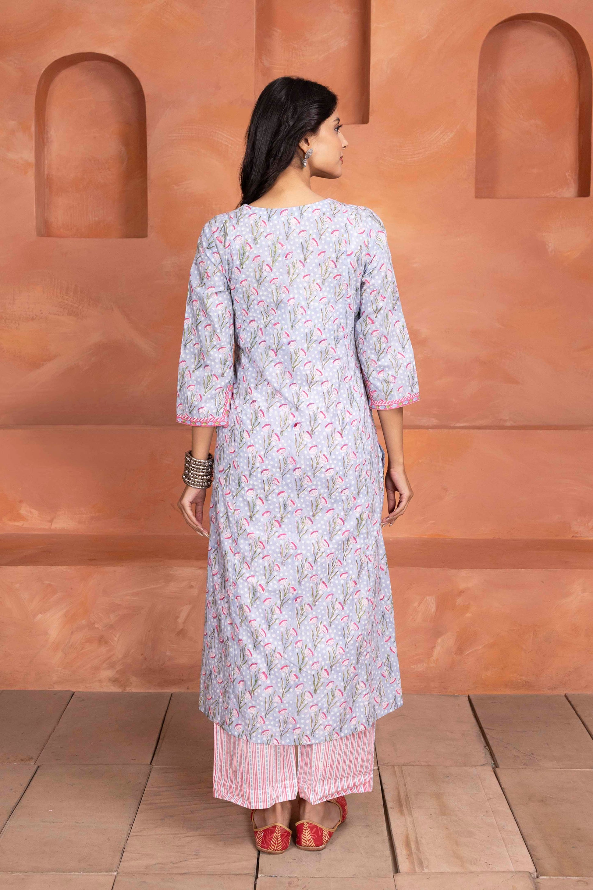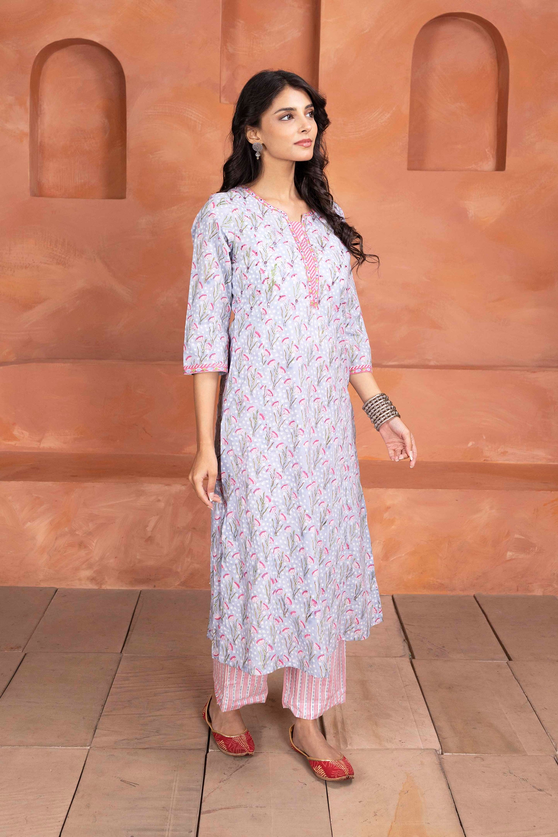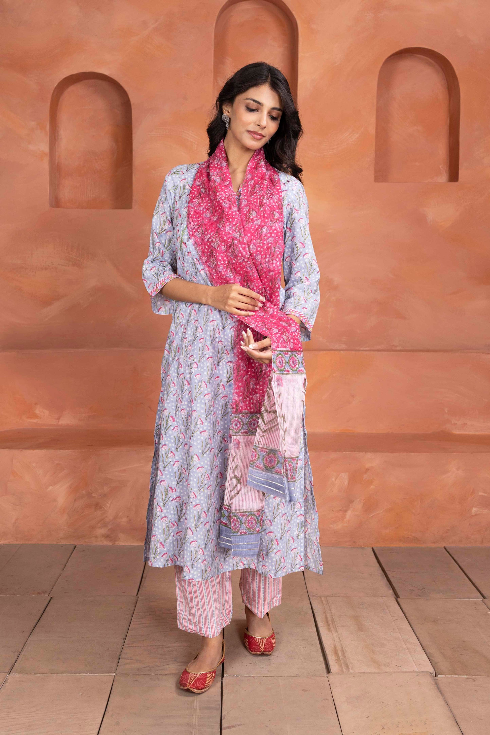 This graceful handblock-printed 3-piece set features a soft sky blue kurta adorned with delicate pink and green floral motifs, enhanced with zigzag piping and printed sleeve cuffs. It is paired with striped straight pants that offer a playful contrast, and a vibrant kota doriya dupatta in shades of pink with intricate borders—bringing a pop of color and traditional charm to this breezy, everyday ensemble.