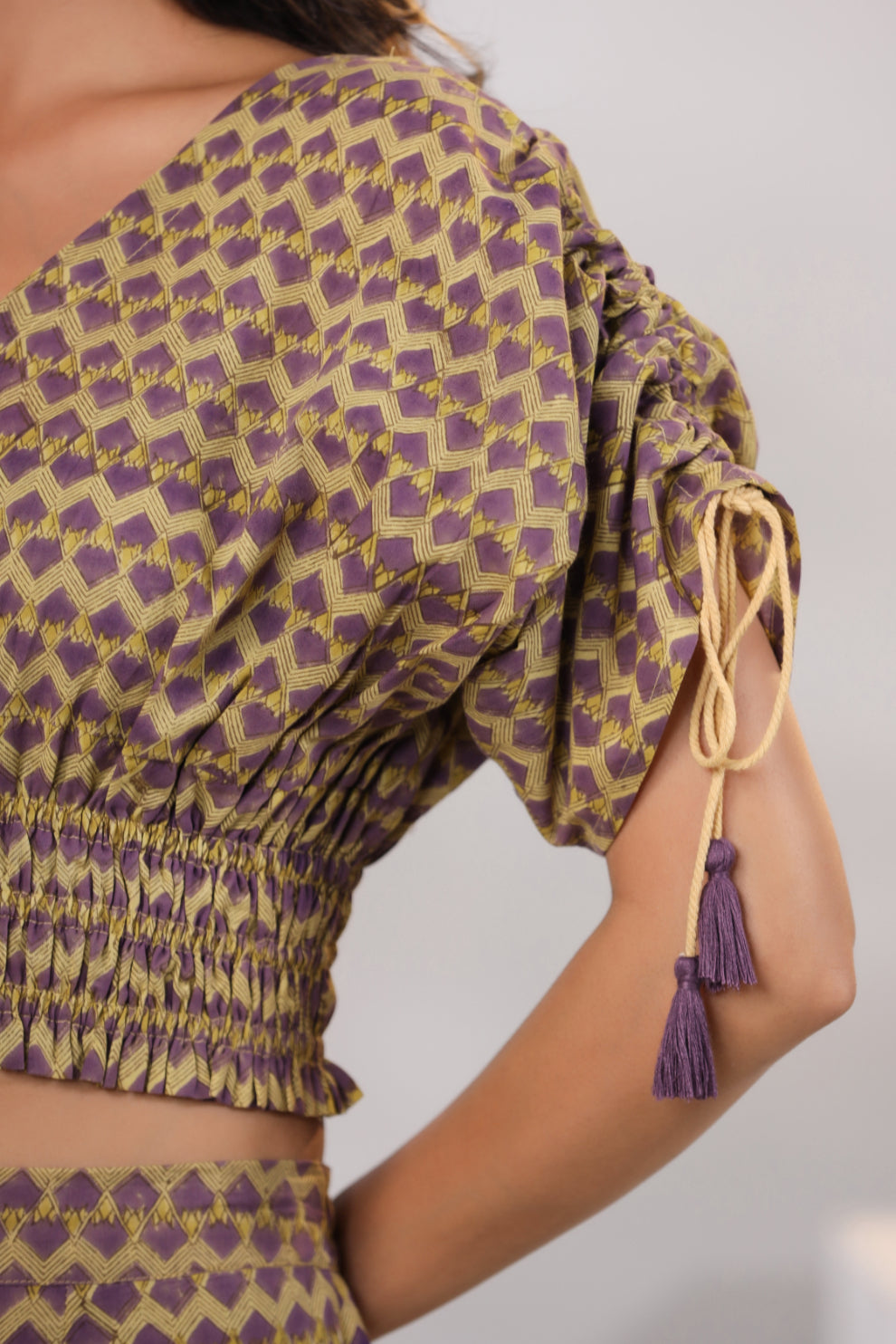 Our Fascinating Lemon Yellow 2-Piece Co-Ord Set Comes With A Plazzo And Blouse And Combination Of Violet Hues With Gathered Shoulder Sleeves, Carefully Assembled For Perfect Look.