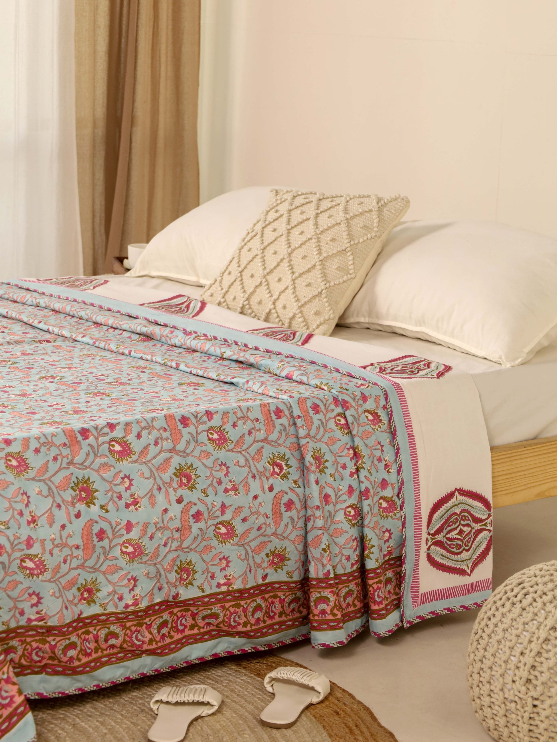 Light Blue and Maroon Dohar Reversible Bed Spreader