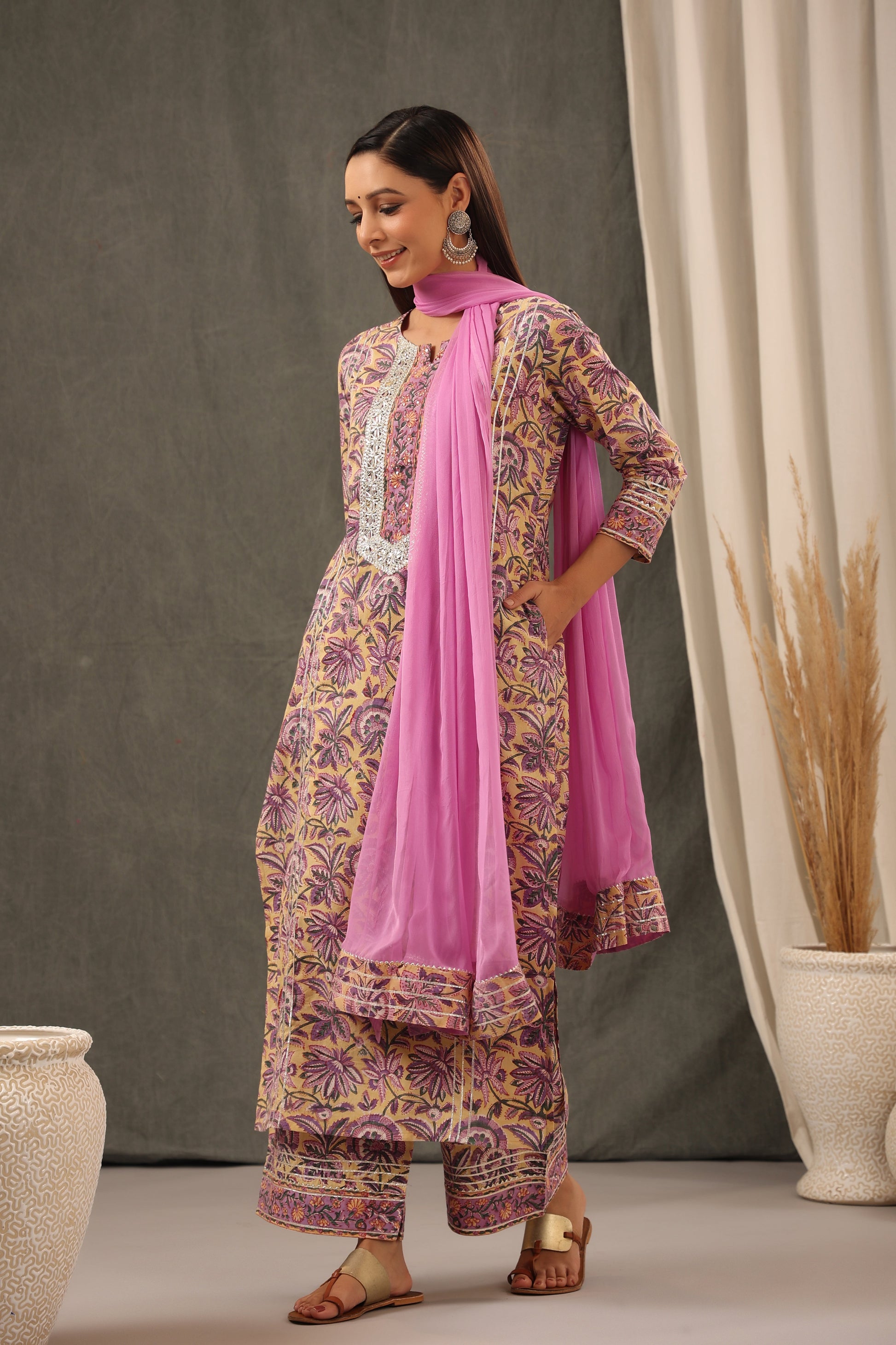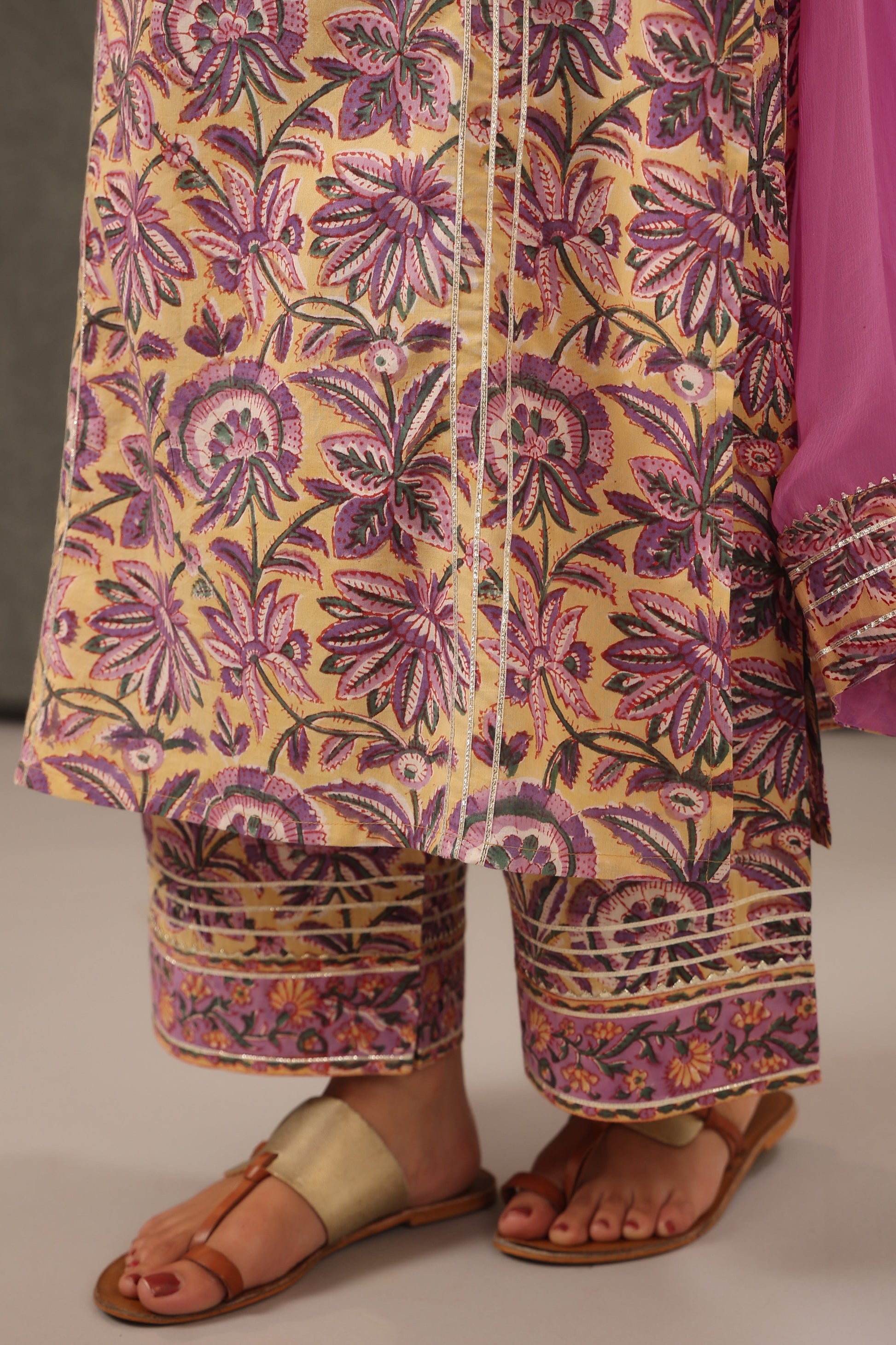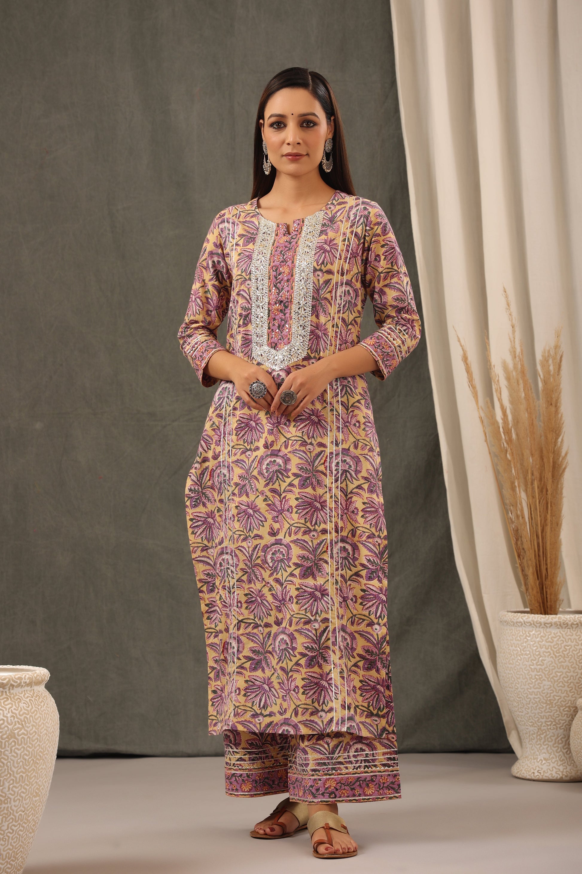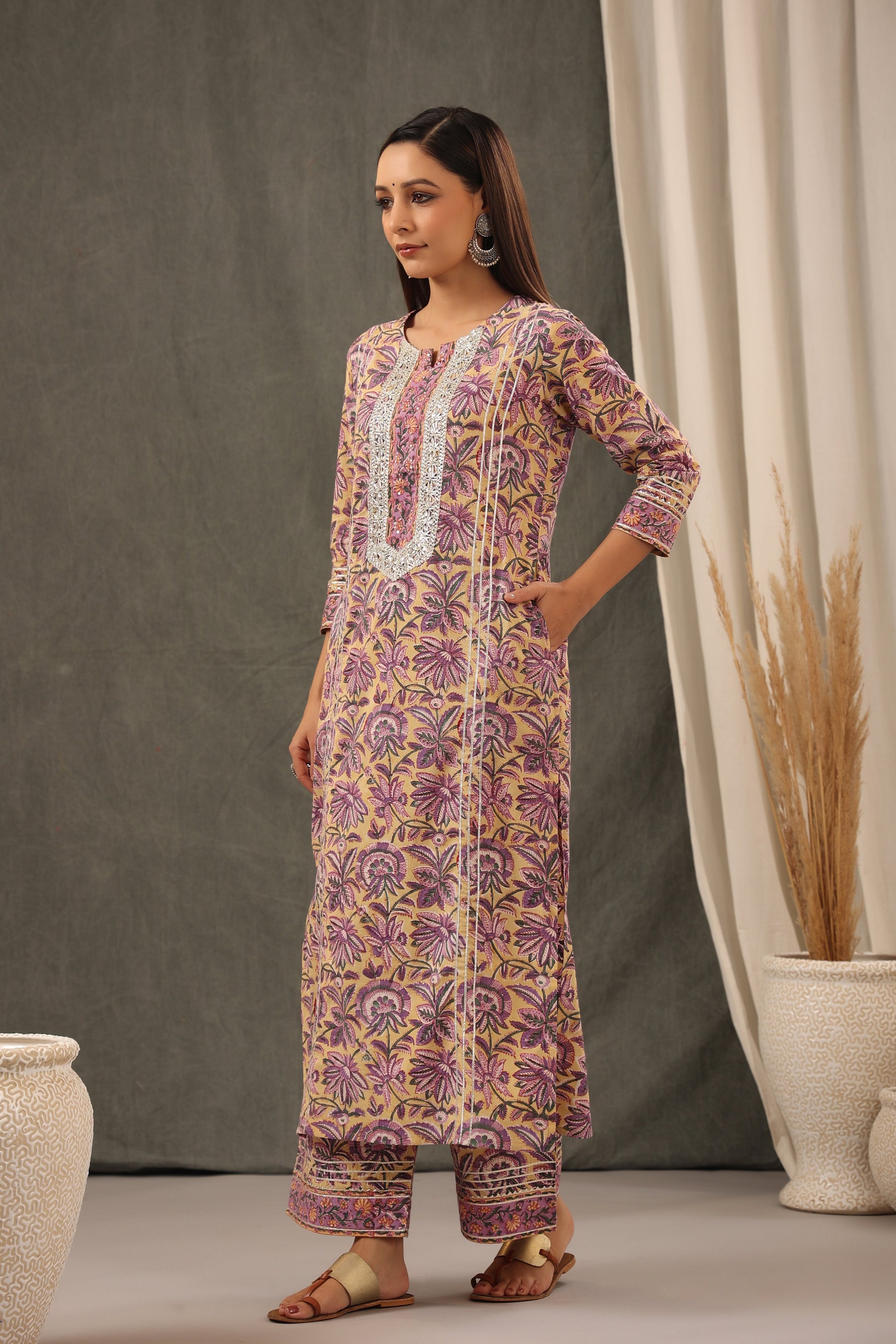 This pleasing lilac kurta with the combination of Crayola yellow handcrafted in soft cotton fabric. This elegant piece comes embellished with sequence and gota work on neckline and cuffs. Carefully assembled for a gorgeous look.