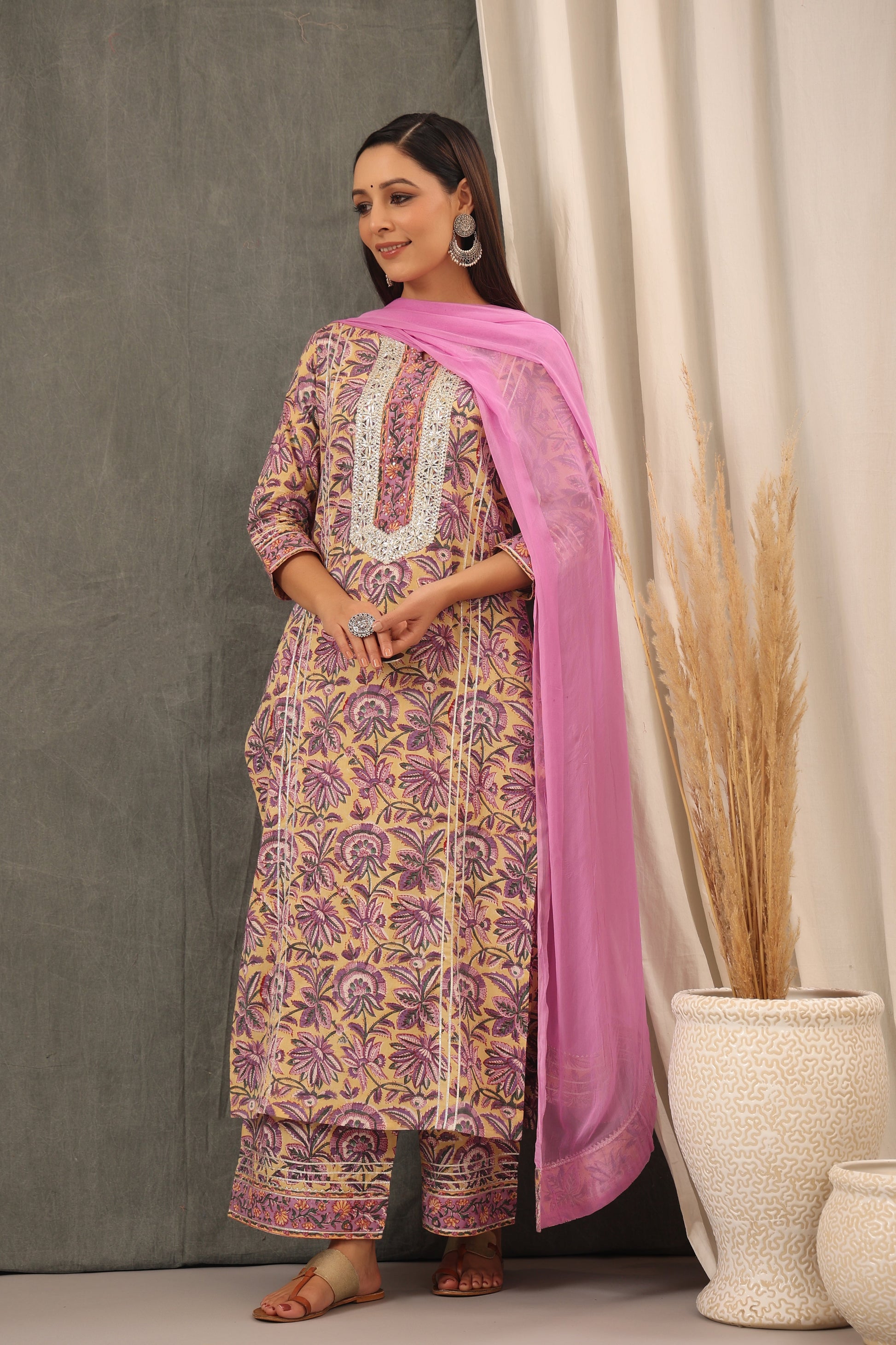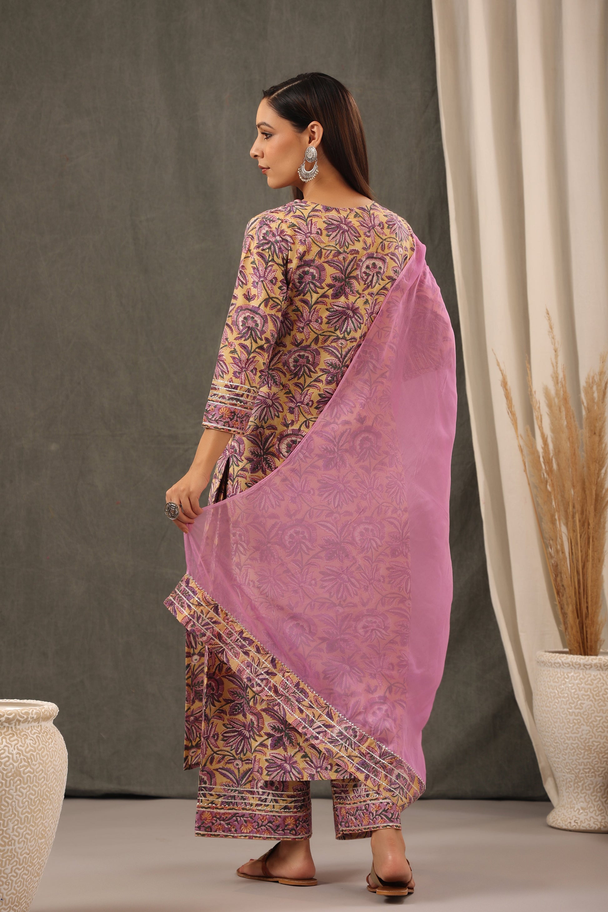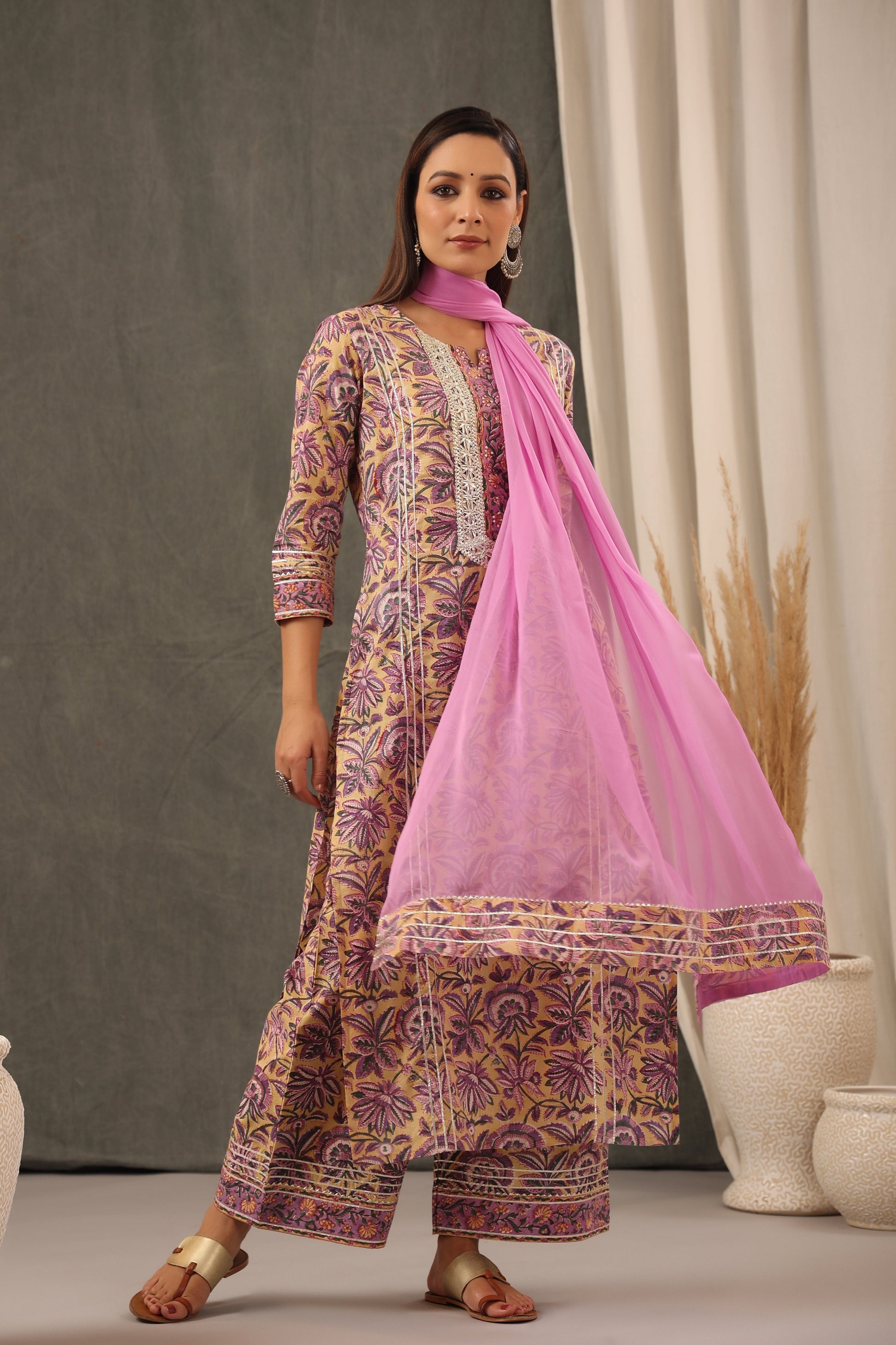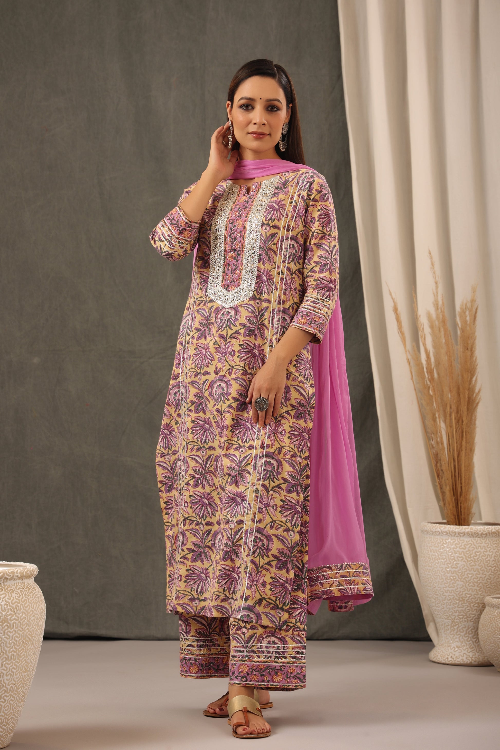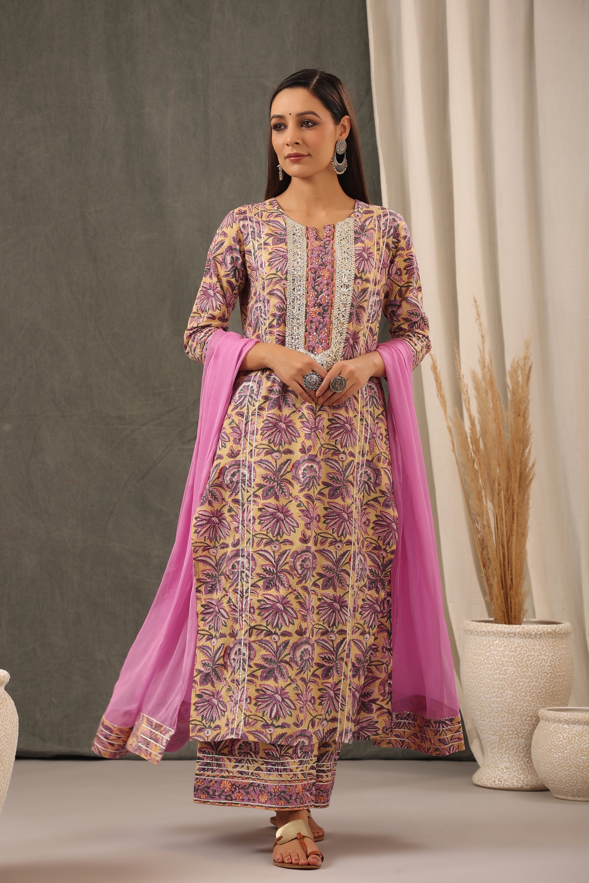 This pleasing lilac kurta with the combination of Crayola yellow handcrafted in soft cotton fabric. This elegant piece comes embellished with sequence and gota work on neckline and cuffs. Carefully assembled for a gorgeous look.