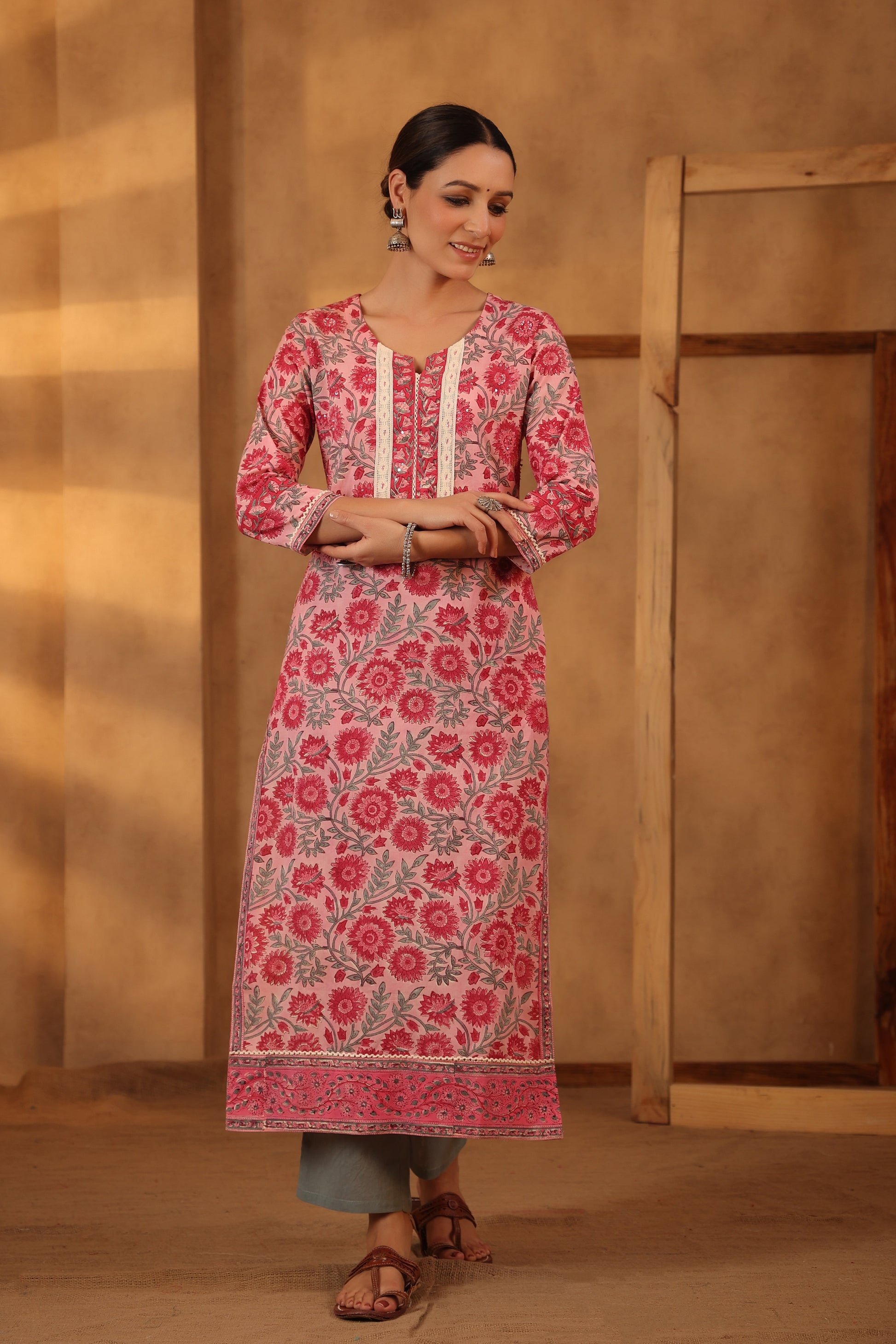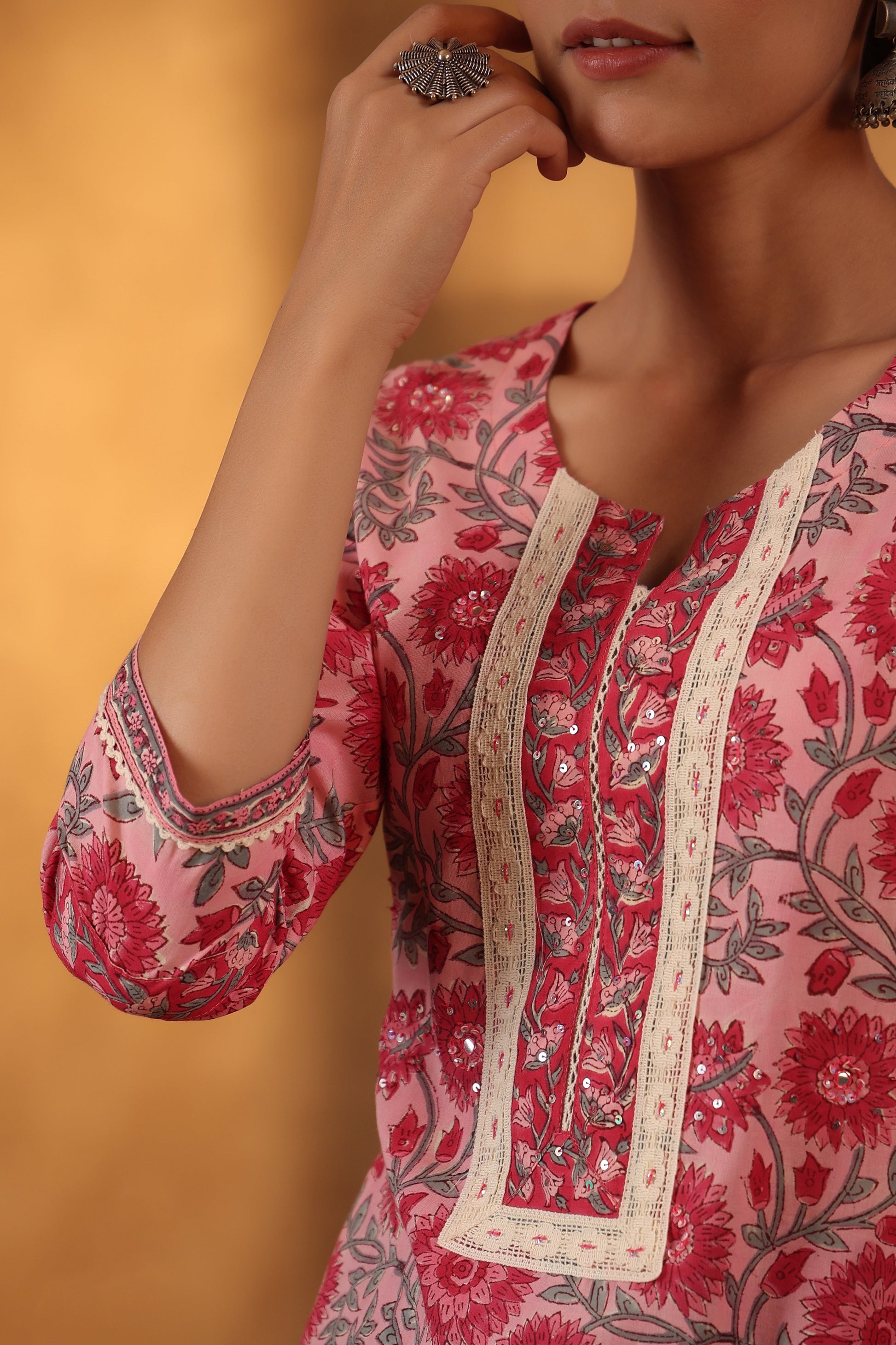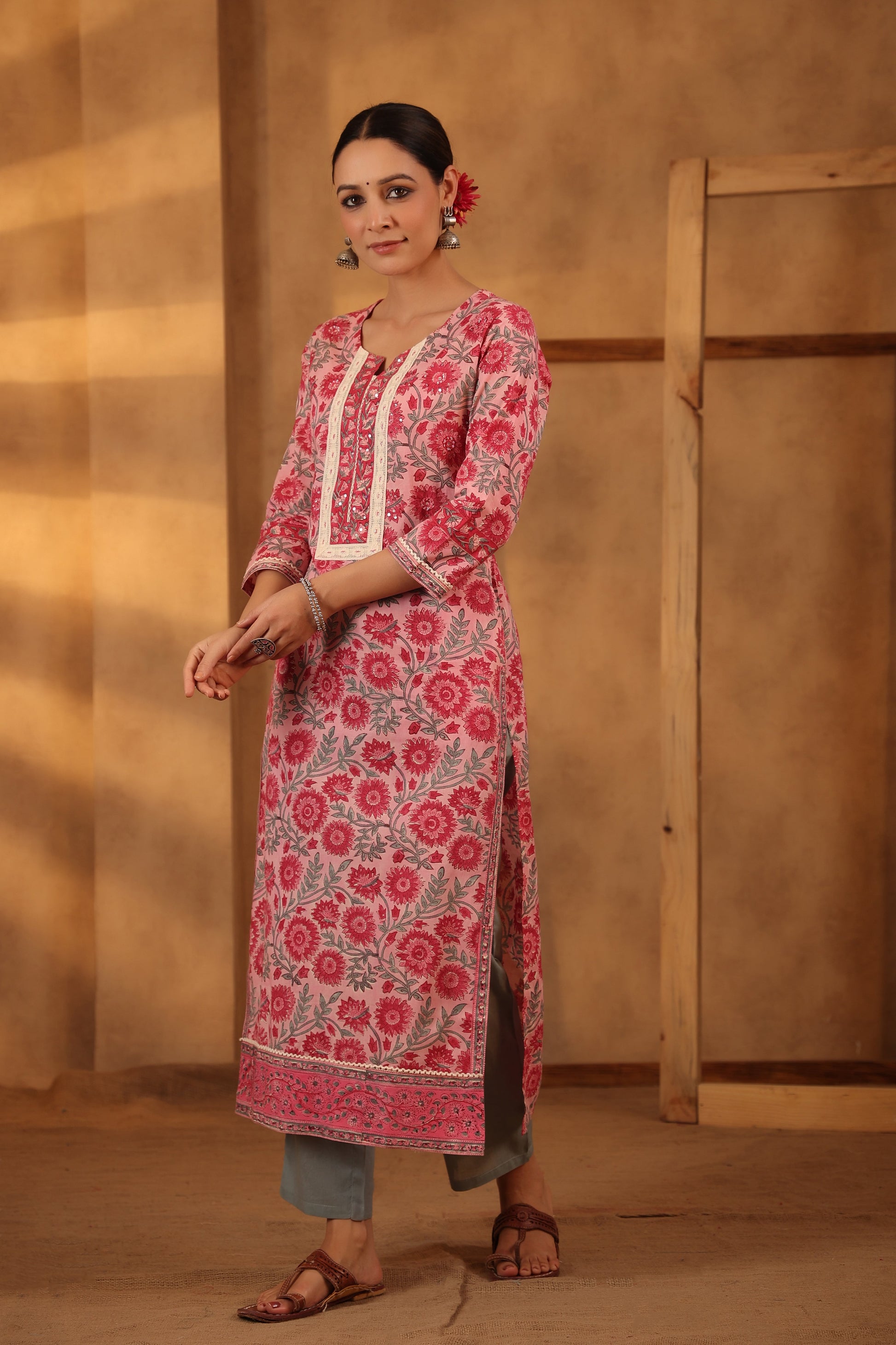Our classic magenta pink kurta comes with the combination of rose pink tone, handblock printed floral straight kurta. This comes with Crotchet lace on sleeves and yoke with intricate sequence work on neck. Add to the allure.
