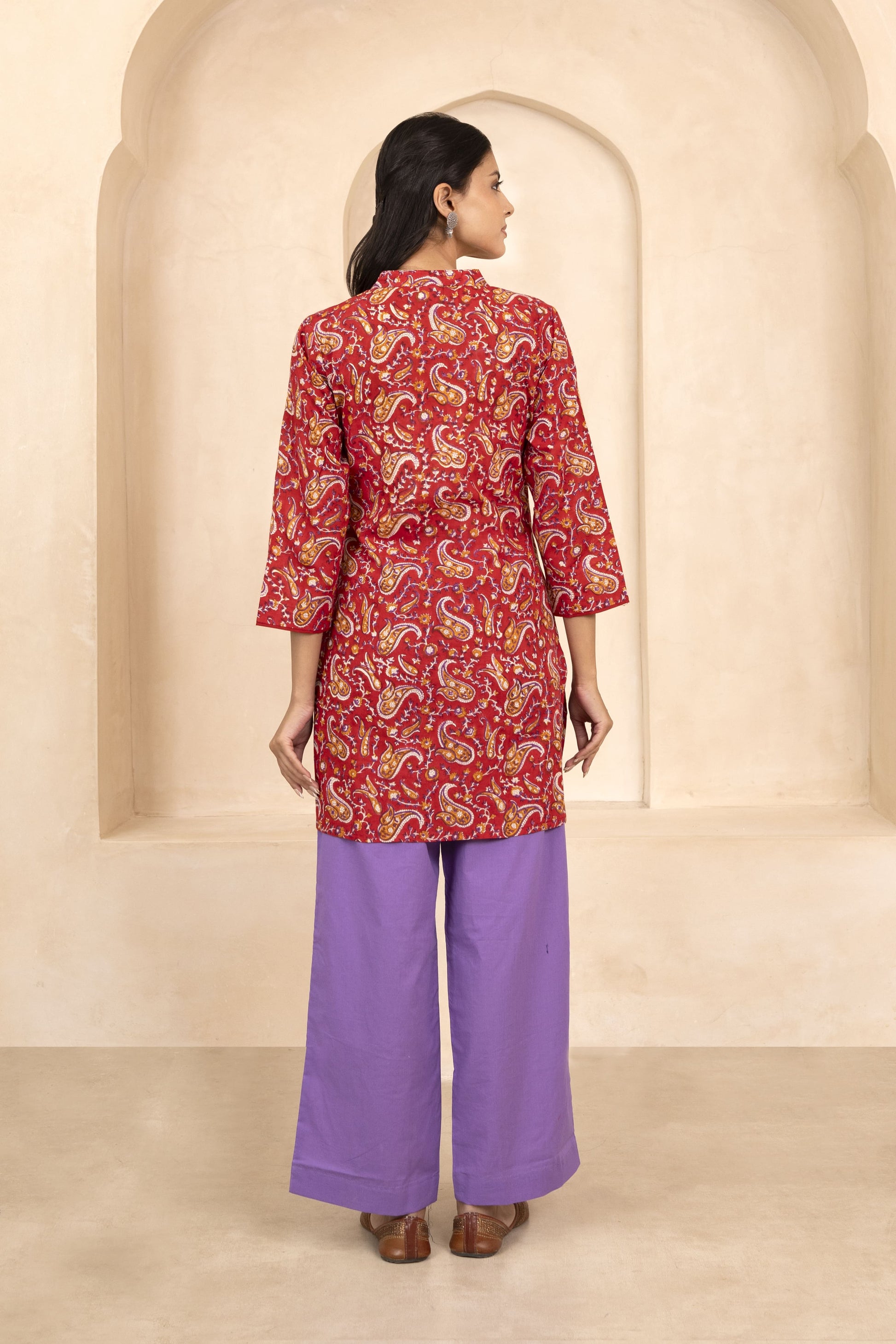 This is a handblock printed cotton Short Kurti featuring a traditional paisley motif in warm hues of mustard, white, and purple on a rich red base. The neckline is a modest slit style with a band collar, giving it a simple yet elegant appeal. The intricate paisley design, a hallmark of Indian craftsmanship, reflects timeless artistry and vibrant ethnic charm—perfect for casual wear, festive gatherings, or semi-formal occasions.