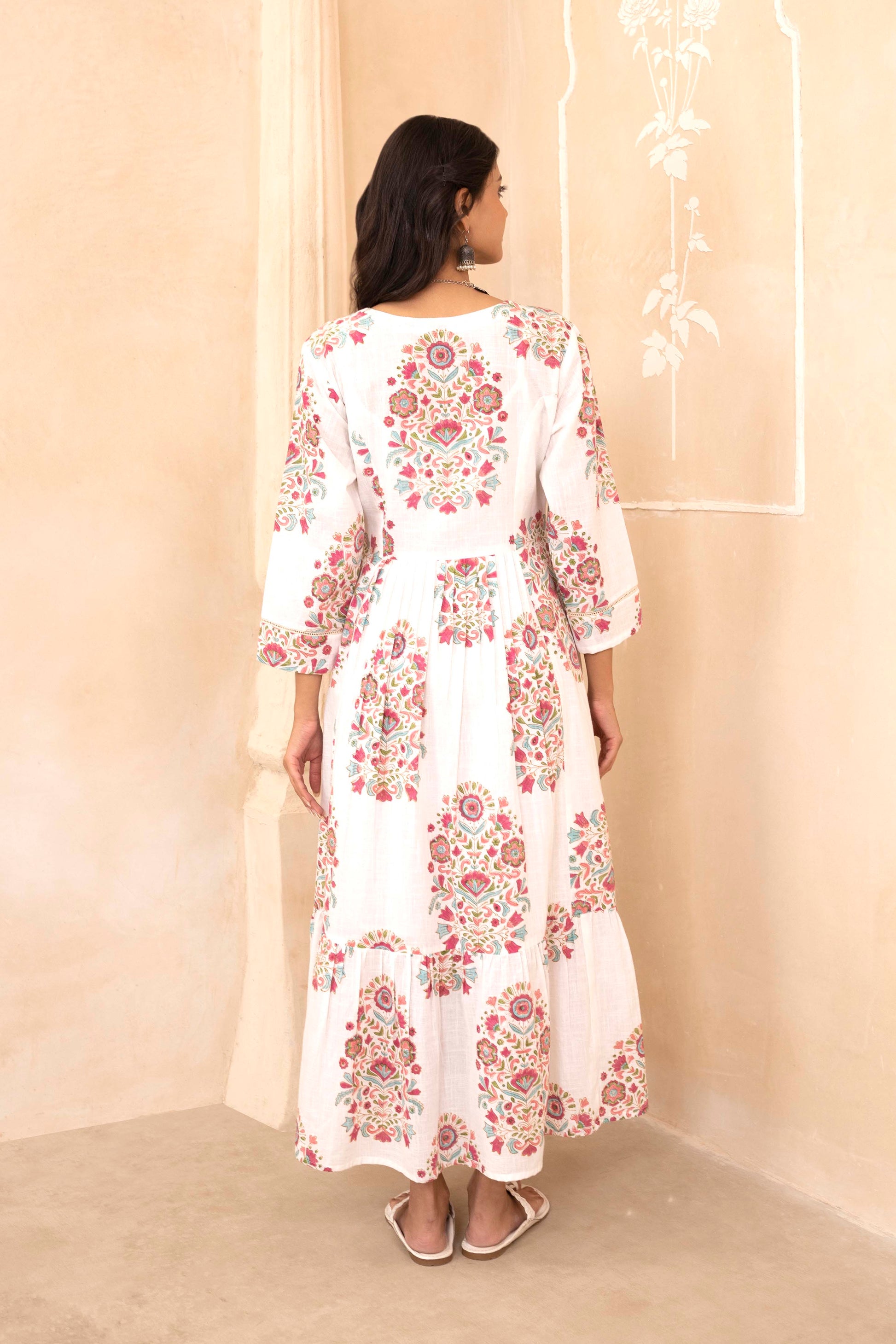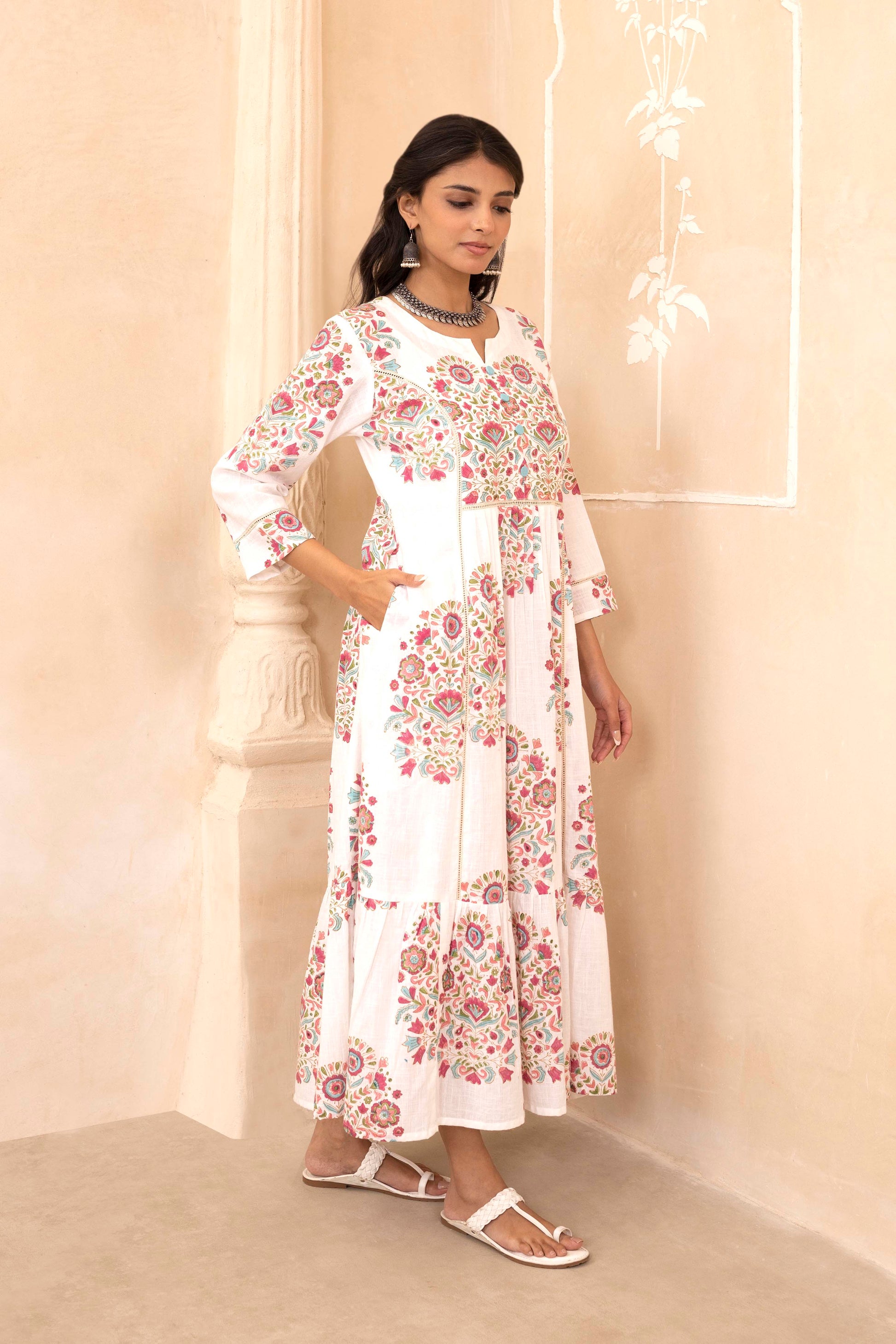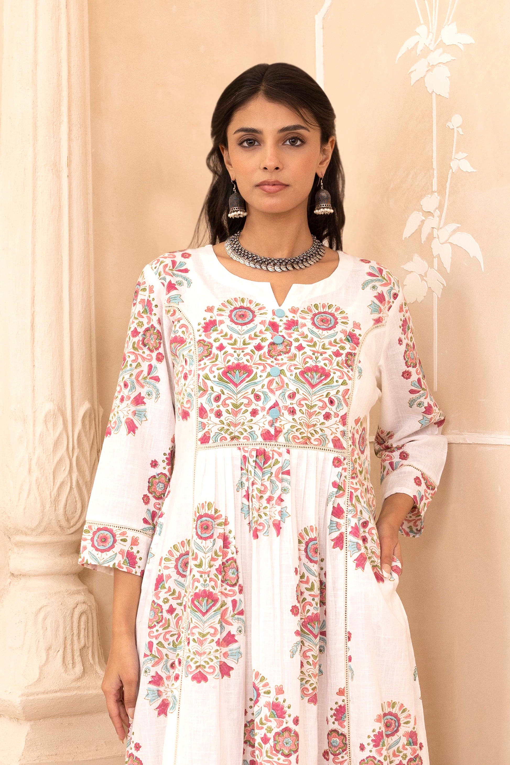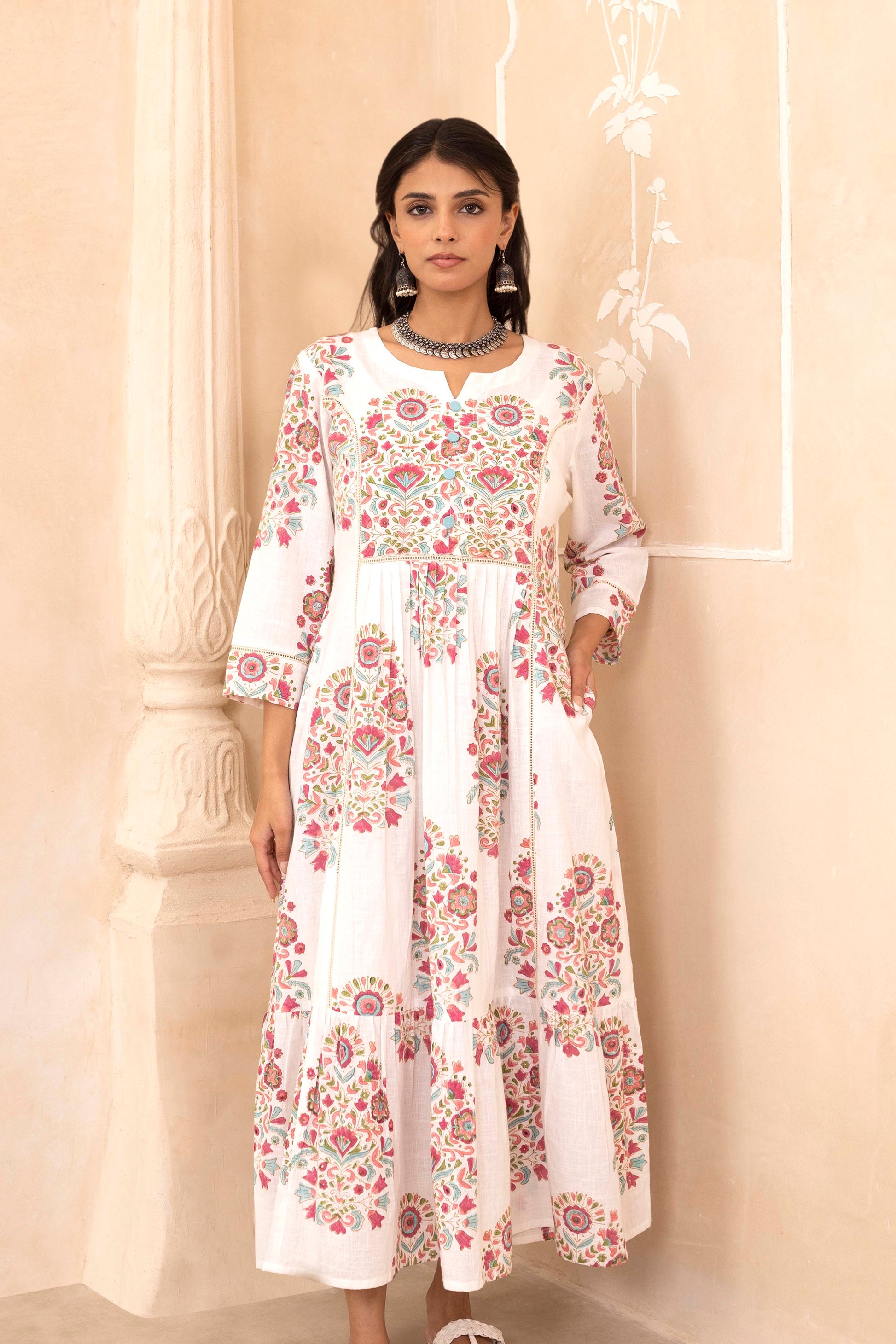 Timeless elegance meets artisanal craft in this ivory midi dress adorned with vibrant Mughal-inspired floral motifs. The gathered detailing at the waist and yoke adds structure, while the breezy cotton fabric ensures all-day comfort. With full sleeves and side pockets, it’s a perfect blend of tradition and modern utility — ideal for festive mornings or elegant evenings.