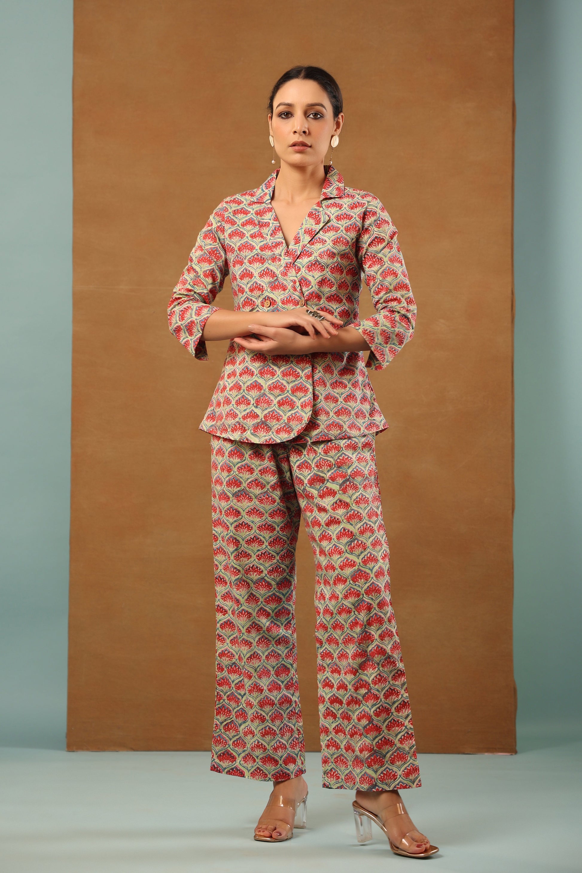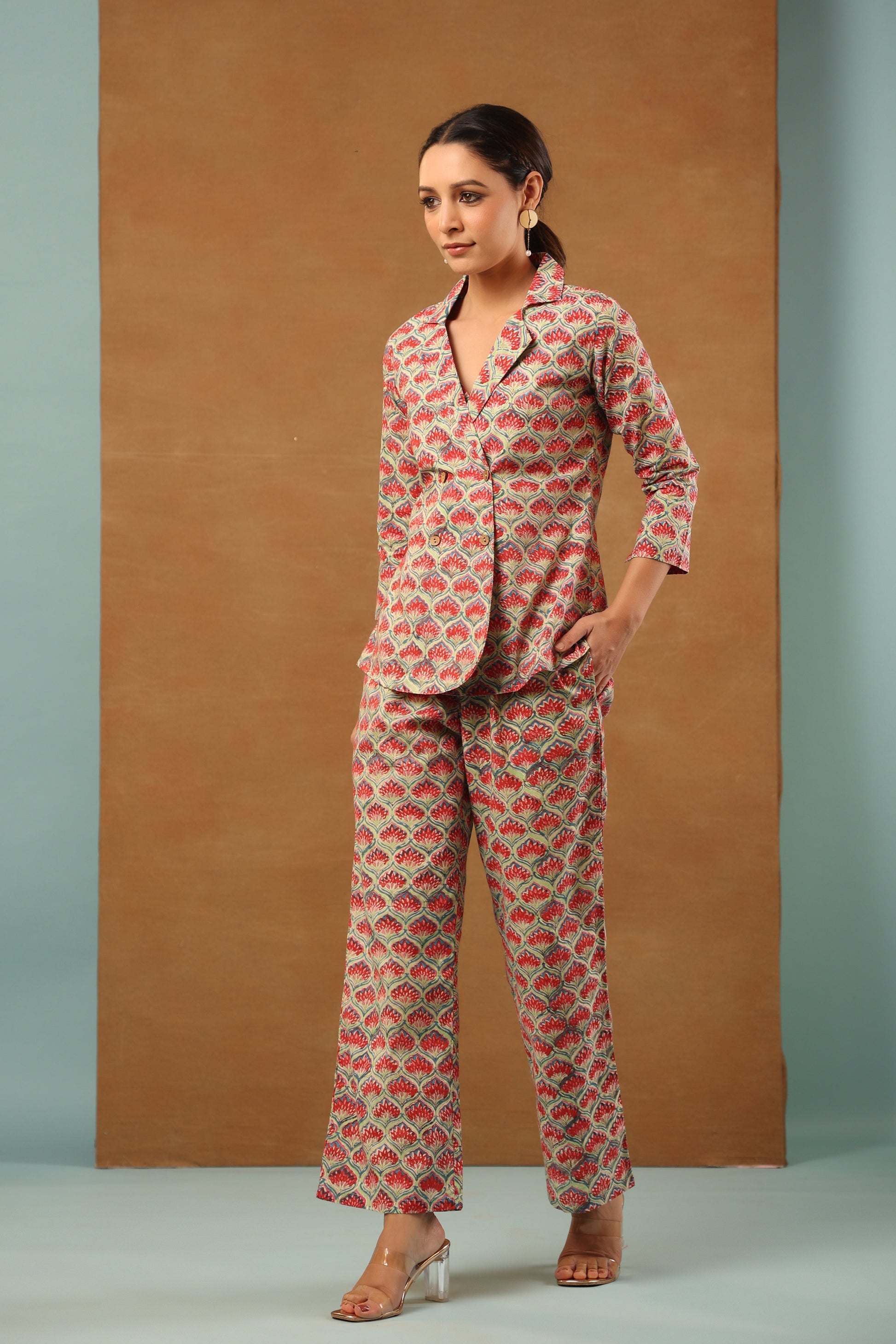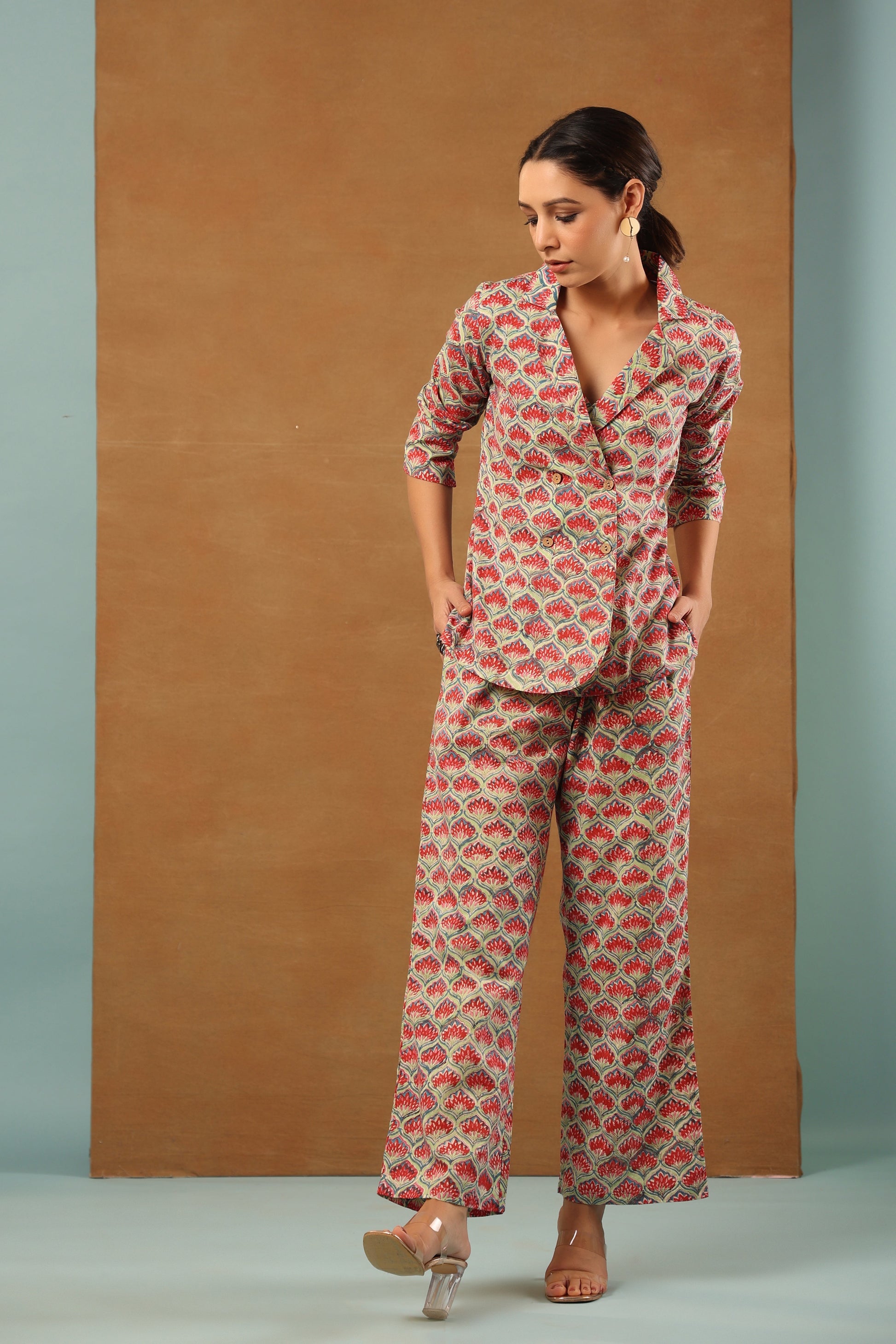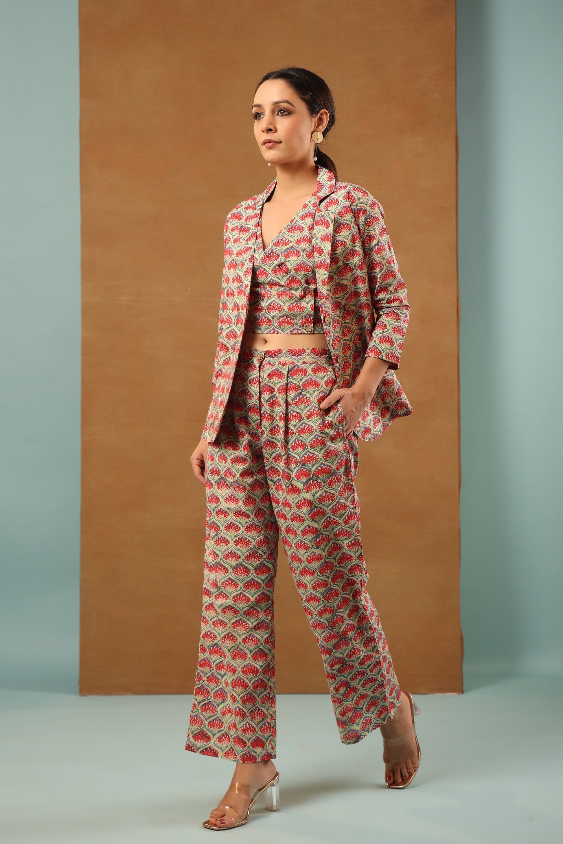Our classic Mint Green floral printed cotton collared blazer come with crop top inside and back elasticated waist pant, 3 Piece Co-ord Set by shuddhi. This co-ord set gives you a comfortable and soft feel, so you can wear it all day long.