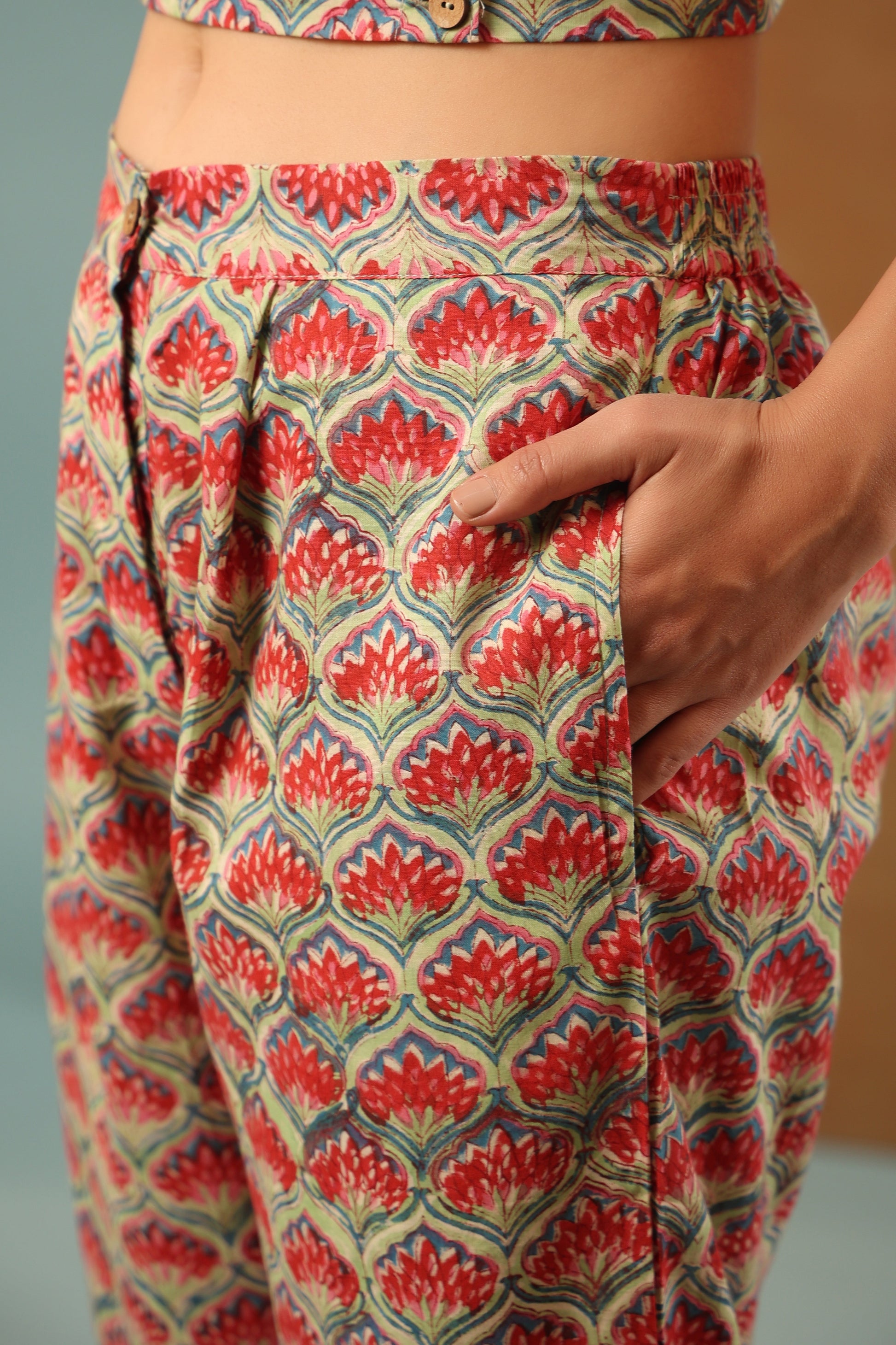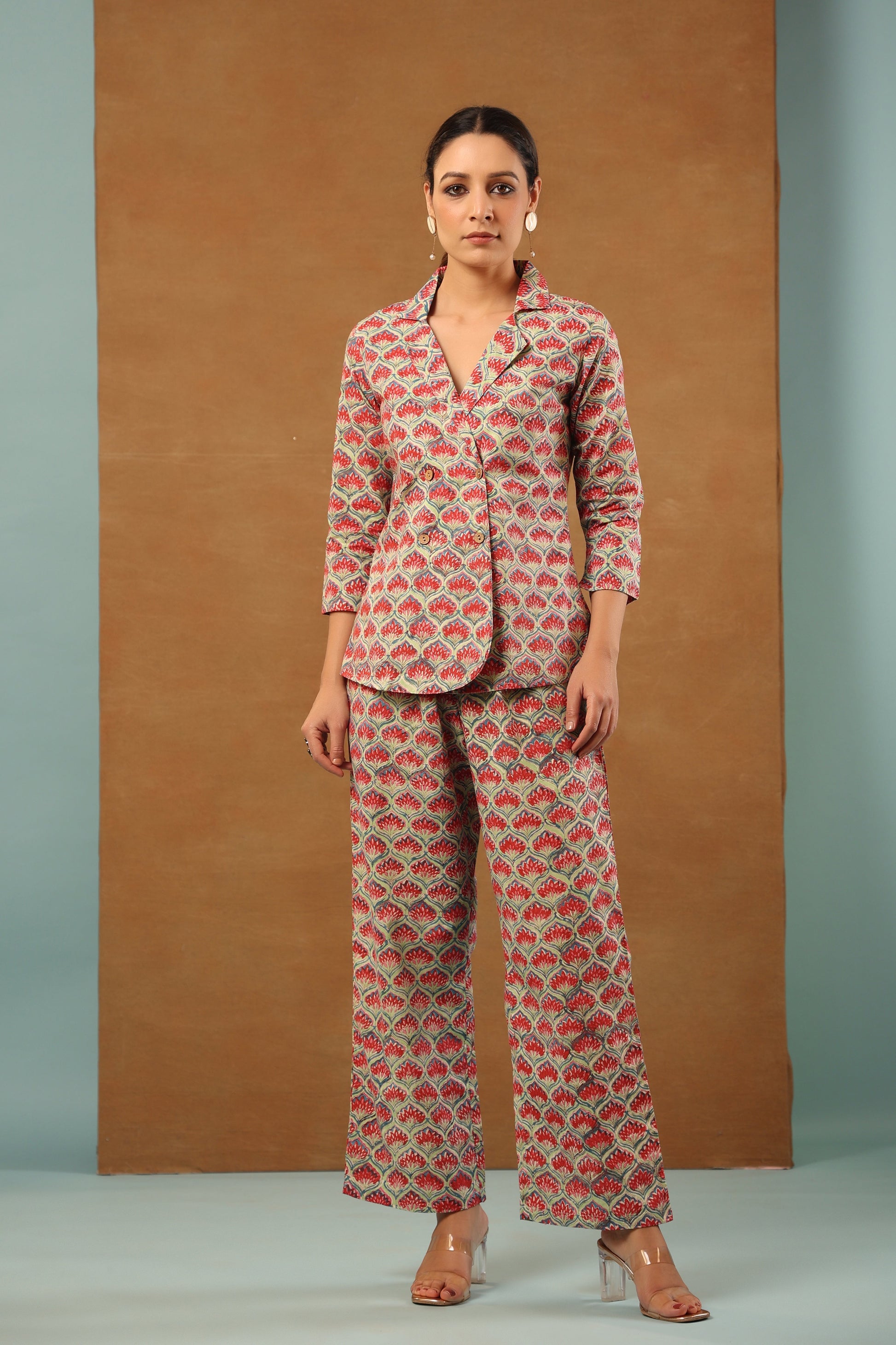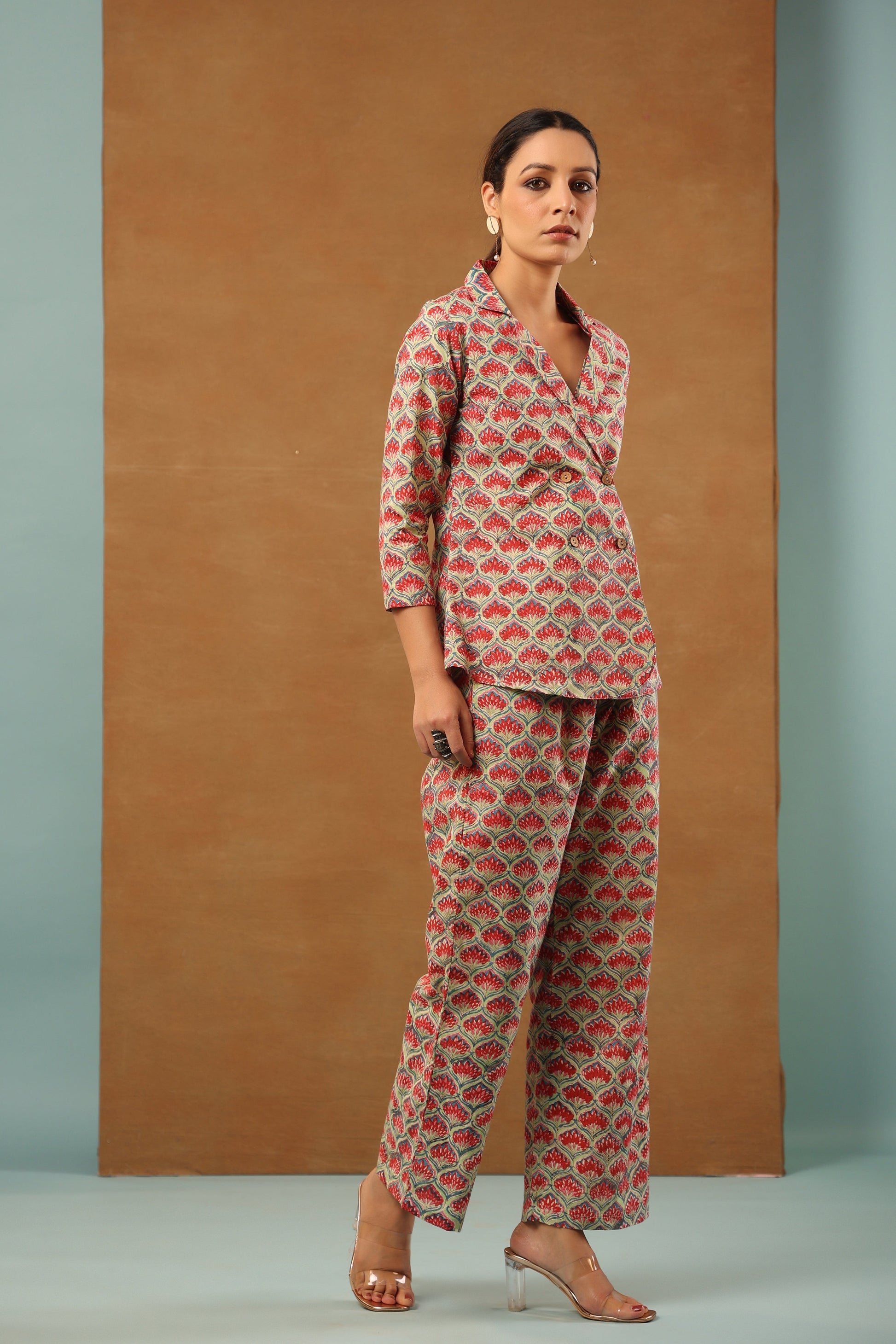 Our classic Mint Green floral printed cotton collared blazer come with crop top inside and back elasticated waist pant, 3 Piece Co-ord Set by shuddhi. This co-ord set gives you a comfortable and soft feel, so you can wear it all day long.
