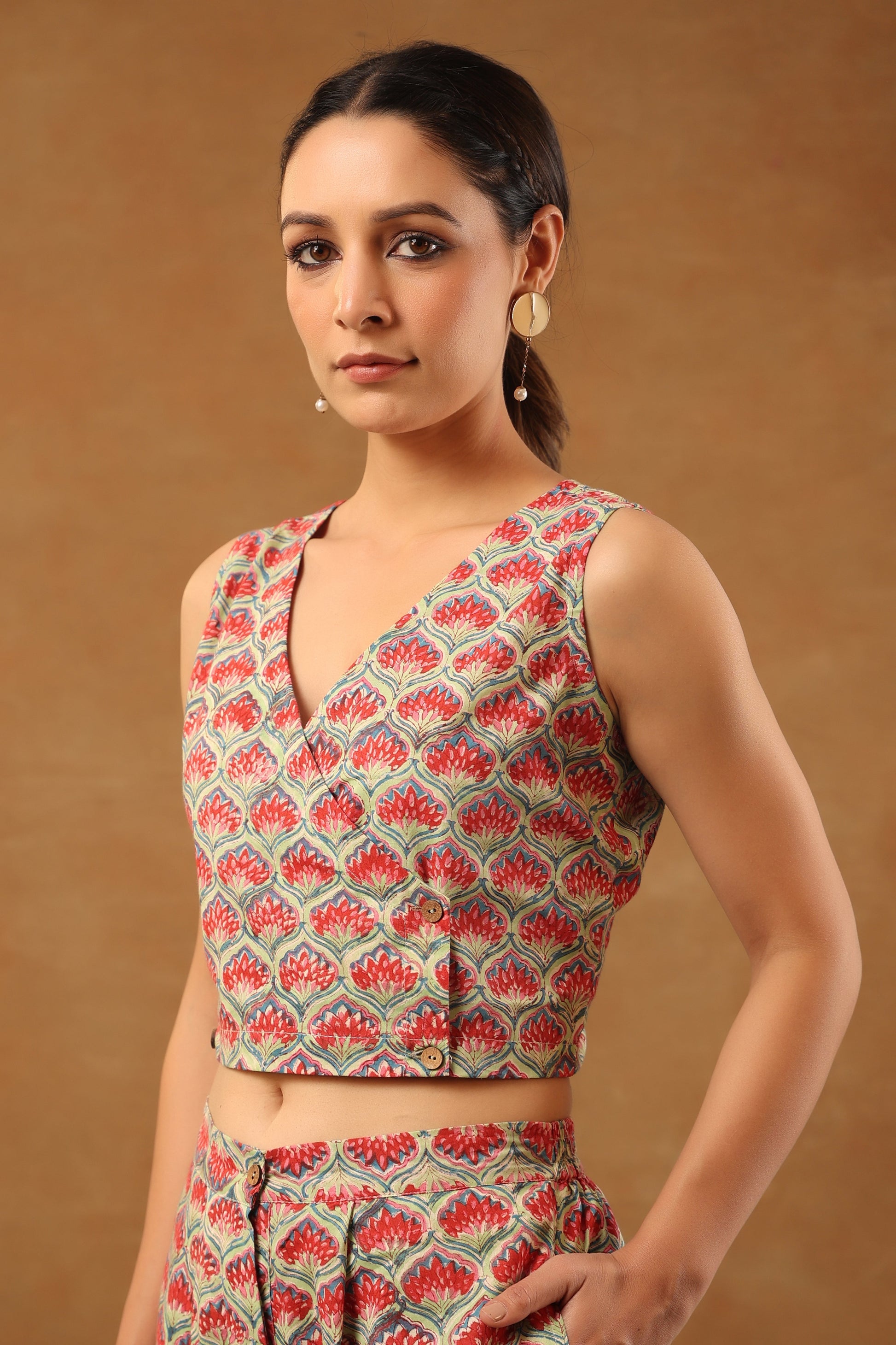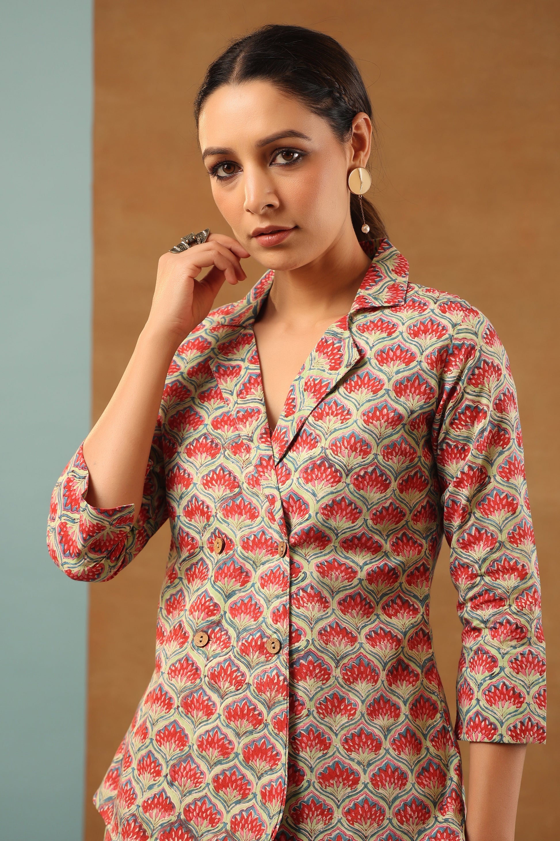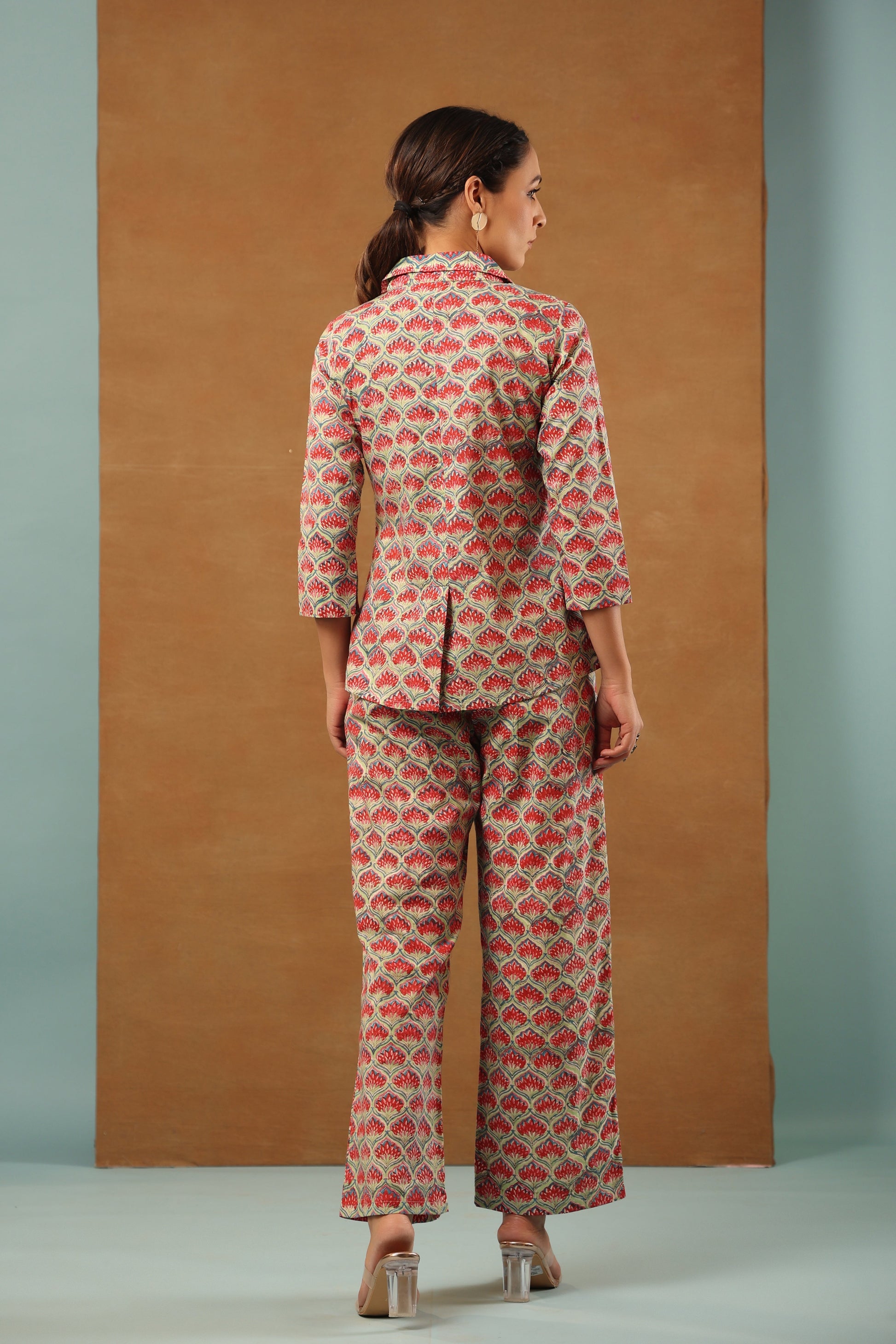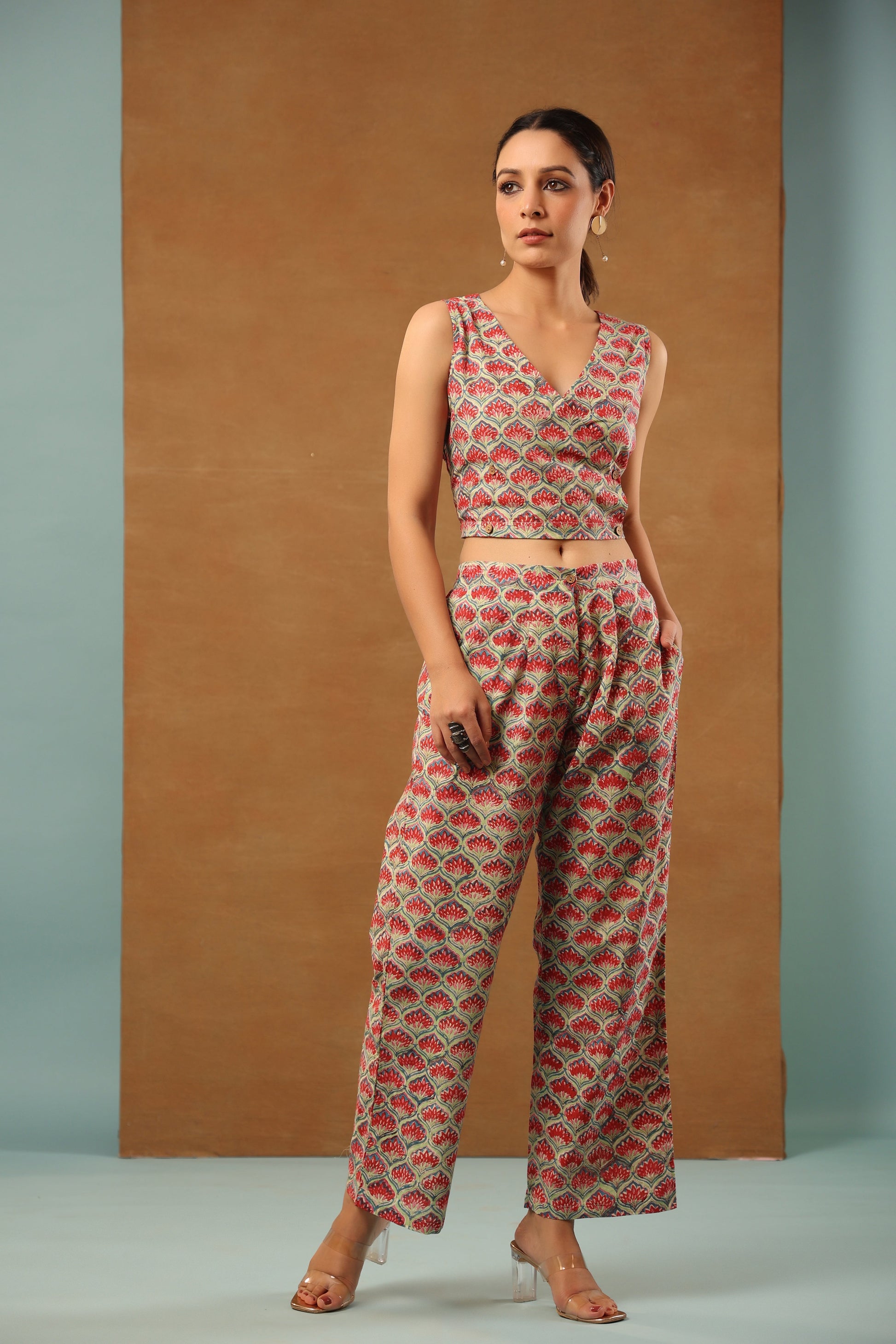 Our classic Mint Green floral printed cotton collared blazer come with crop top inside and back elasticated waist pant, 3 Piece Co-ord Set by shuddhi. This co-ord set gives you a comfortable and soft feel, so you can wear it all day long.