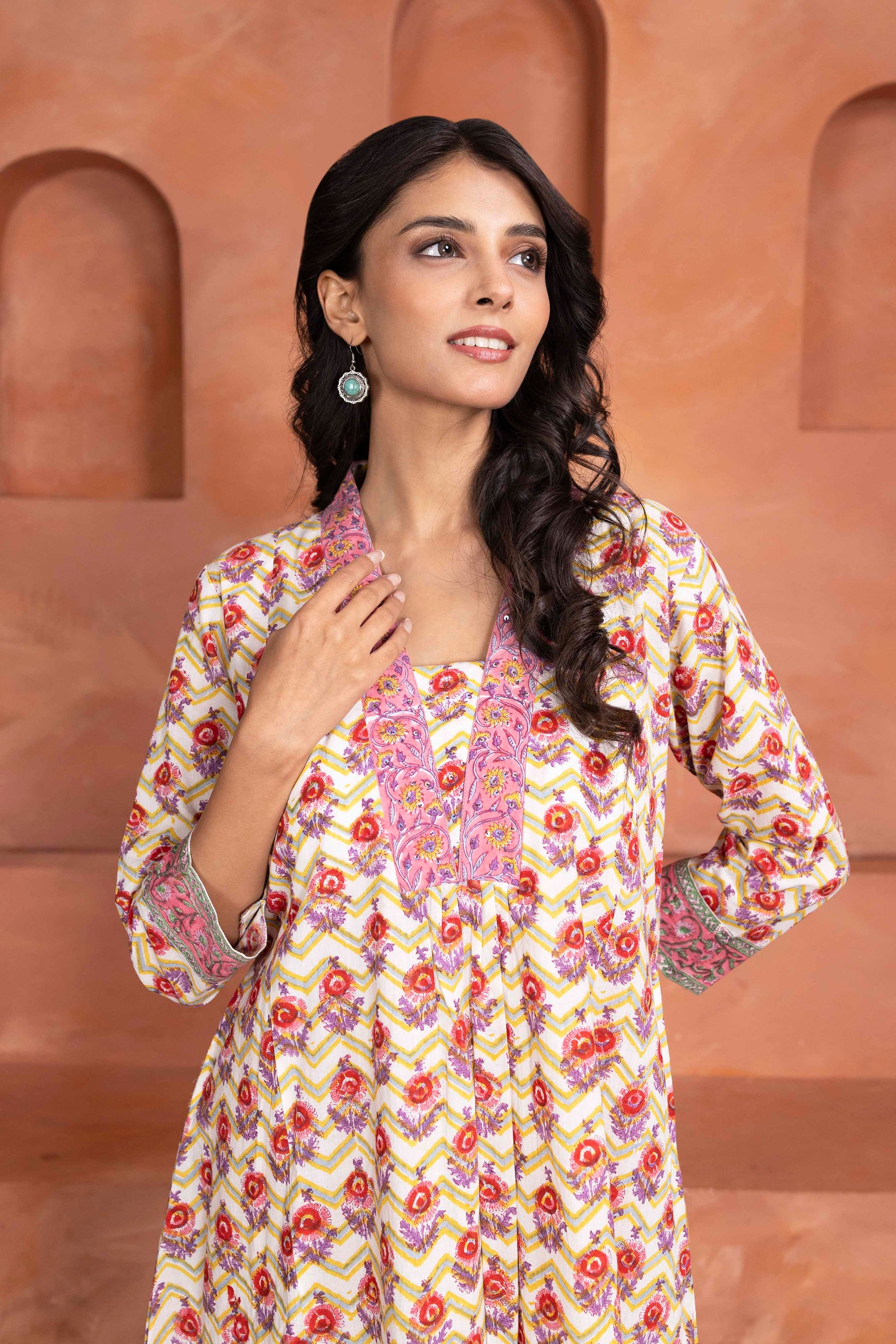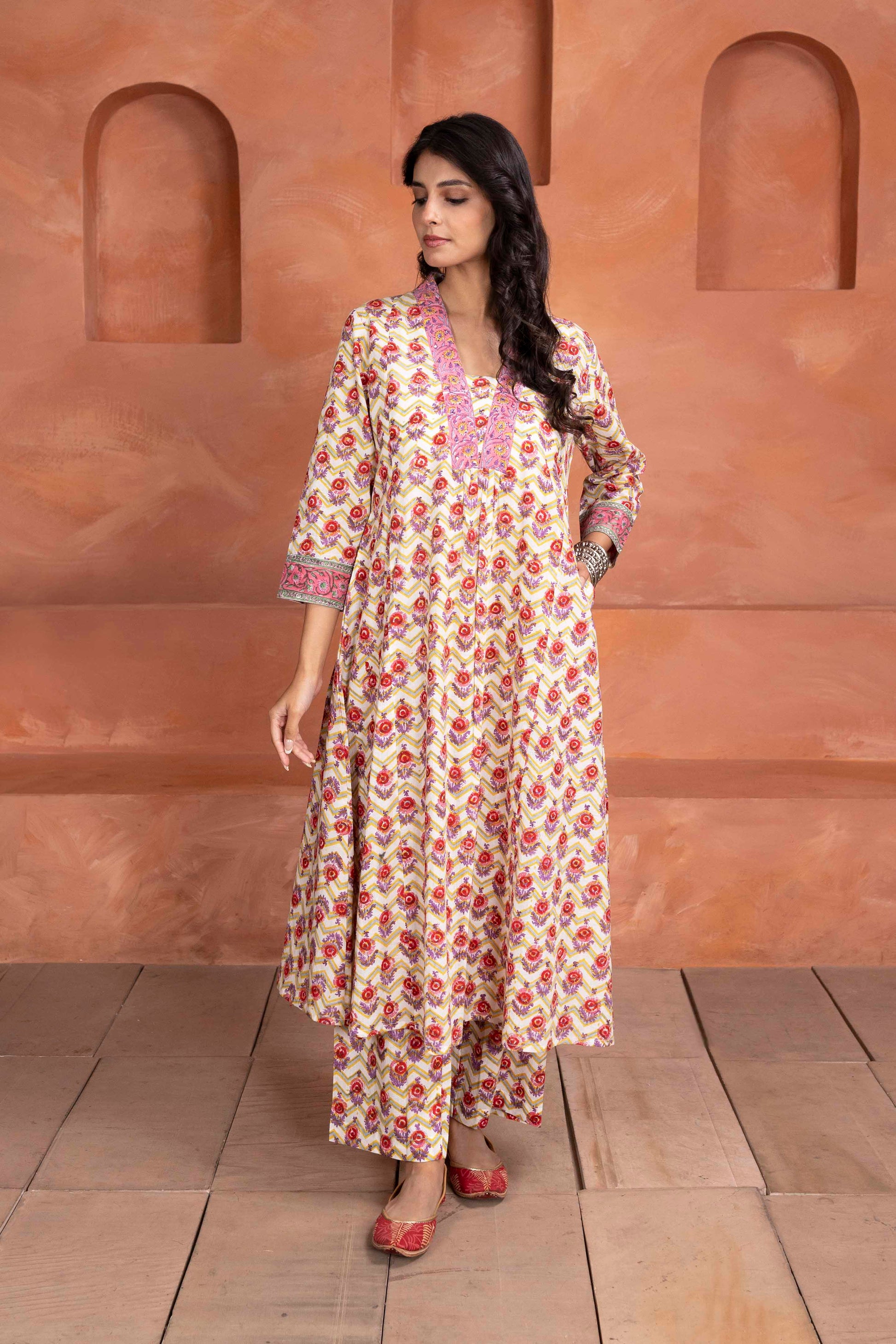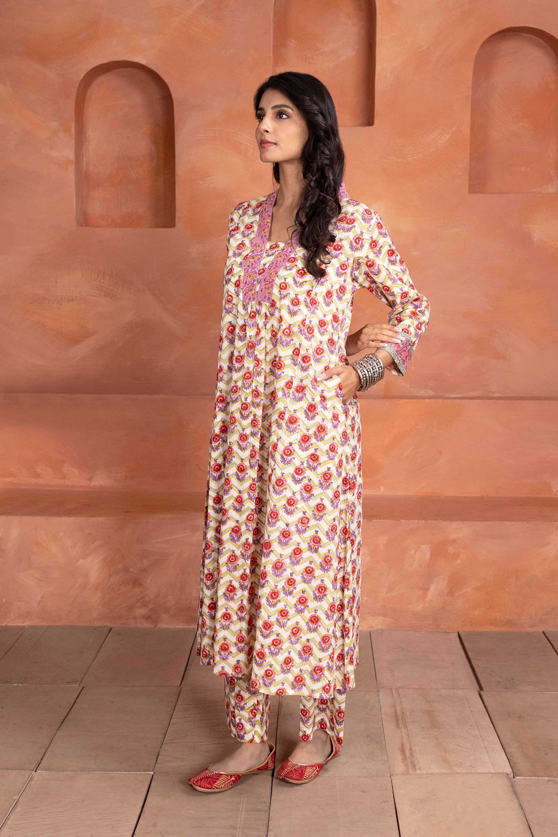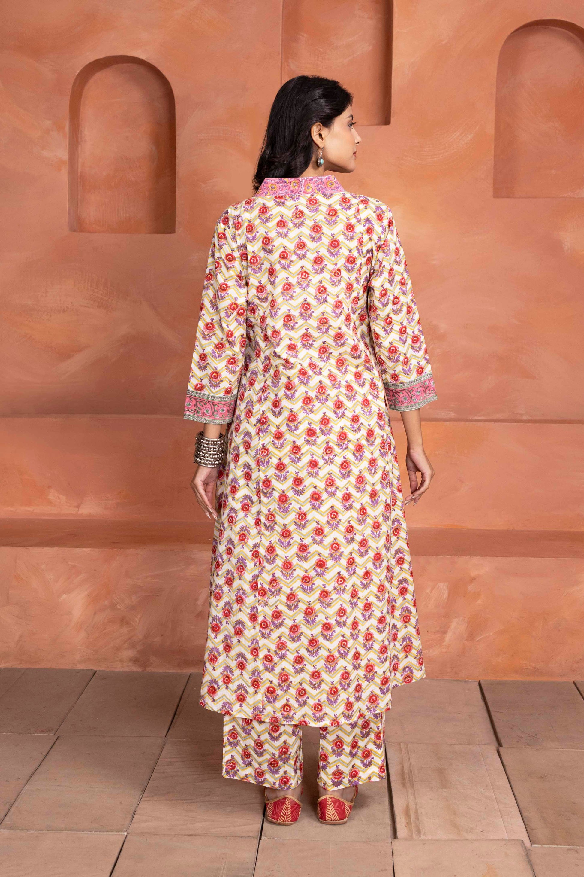 This vibrant handblock-printed 3-piece set showcases a charming mix of traditional and contemporary aesthetics. The kurta features a striking floral motif in warm pink, lilac and yellow tones, accentuated by intricate detailing on the neckline and sleeve cuffs. Paired with matching printed pants and a soft, flowing dupatta featuring chevron and floral patterns, this ensemble offers a perfect blend of elegance and comfort—ideal for festive occasions or casual ethnic outings.