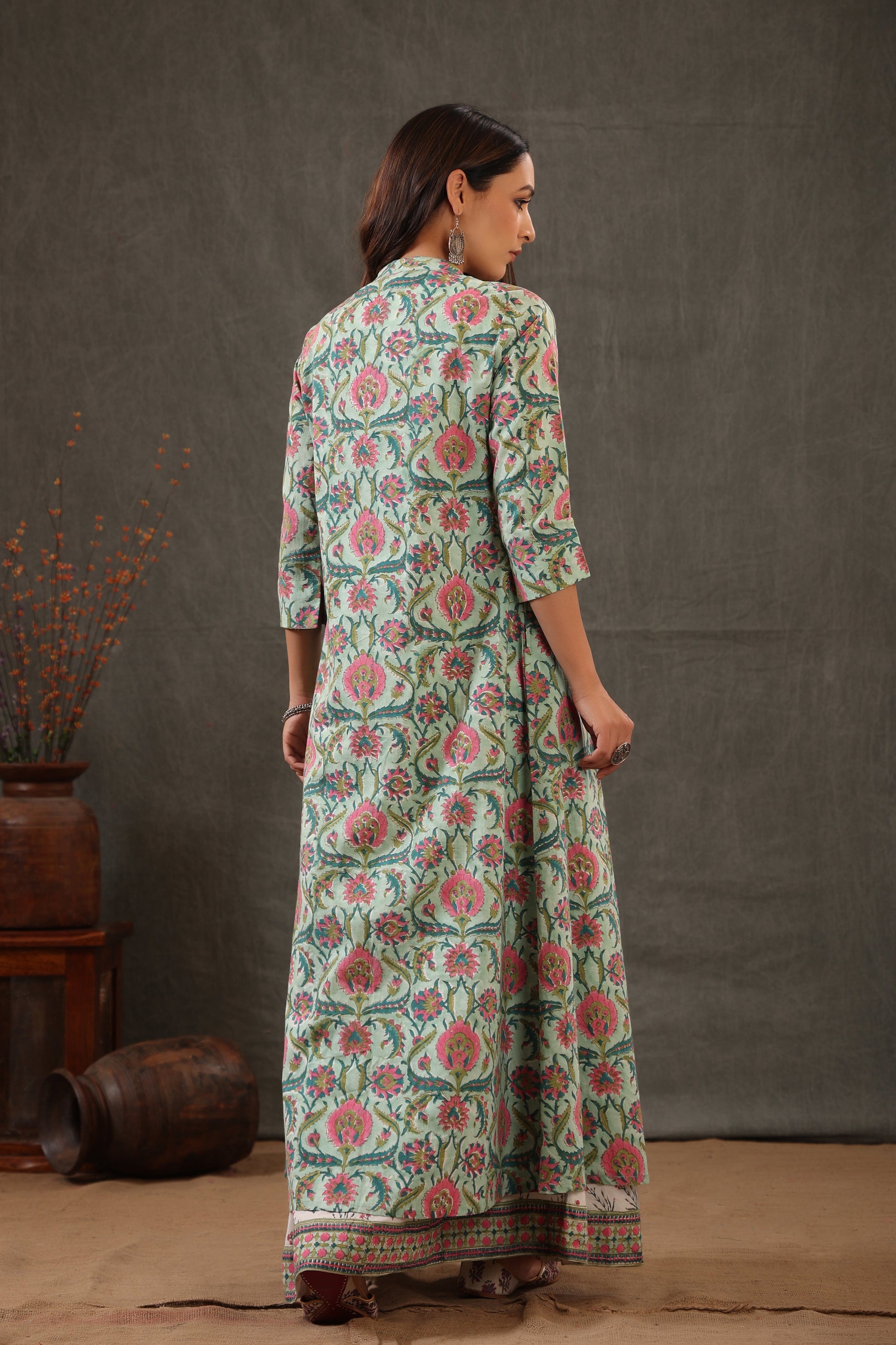 A cotton cape double layered dress. This garment is handcrafted design to flaunt the Indian Aesthetic blend with the new era of fashion. Crafted in supreme quality cotton fabric. It features 3/4th sleeves , round neck with side pockets. A comfortable design that blends in subtle charm and comfort. By wearing this stunner of a look from shuddhi. Pair it with juti or Kolhapur for perfect look.