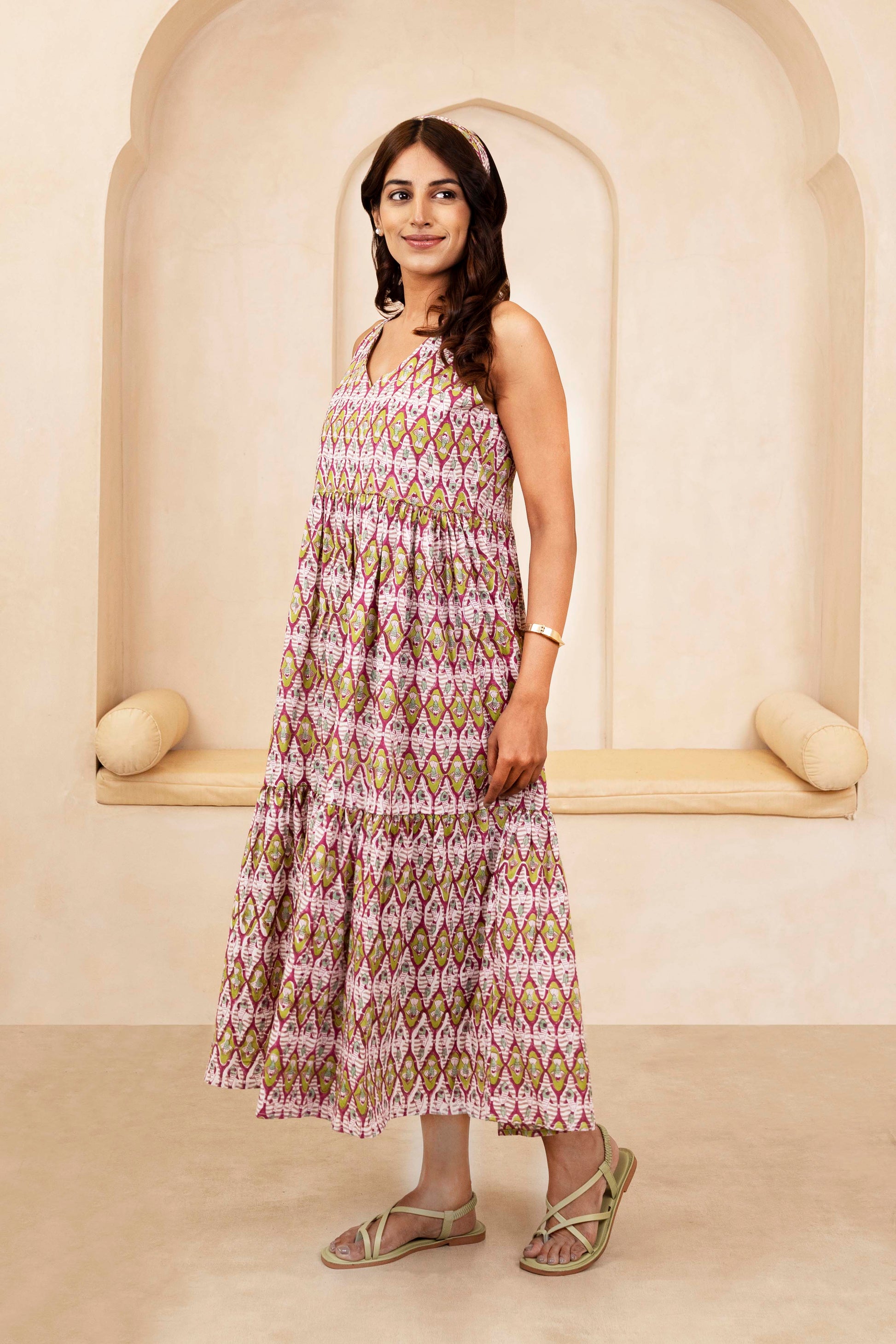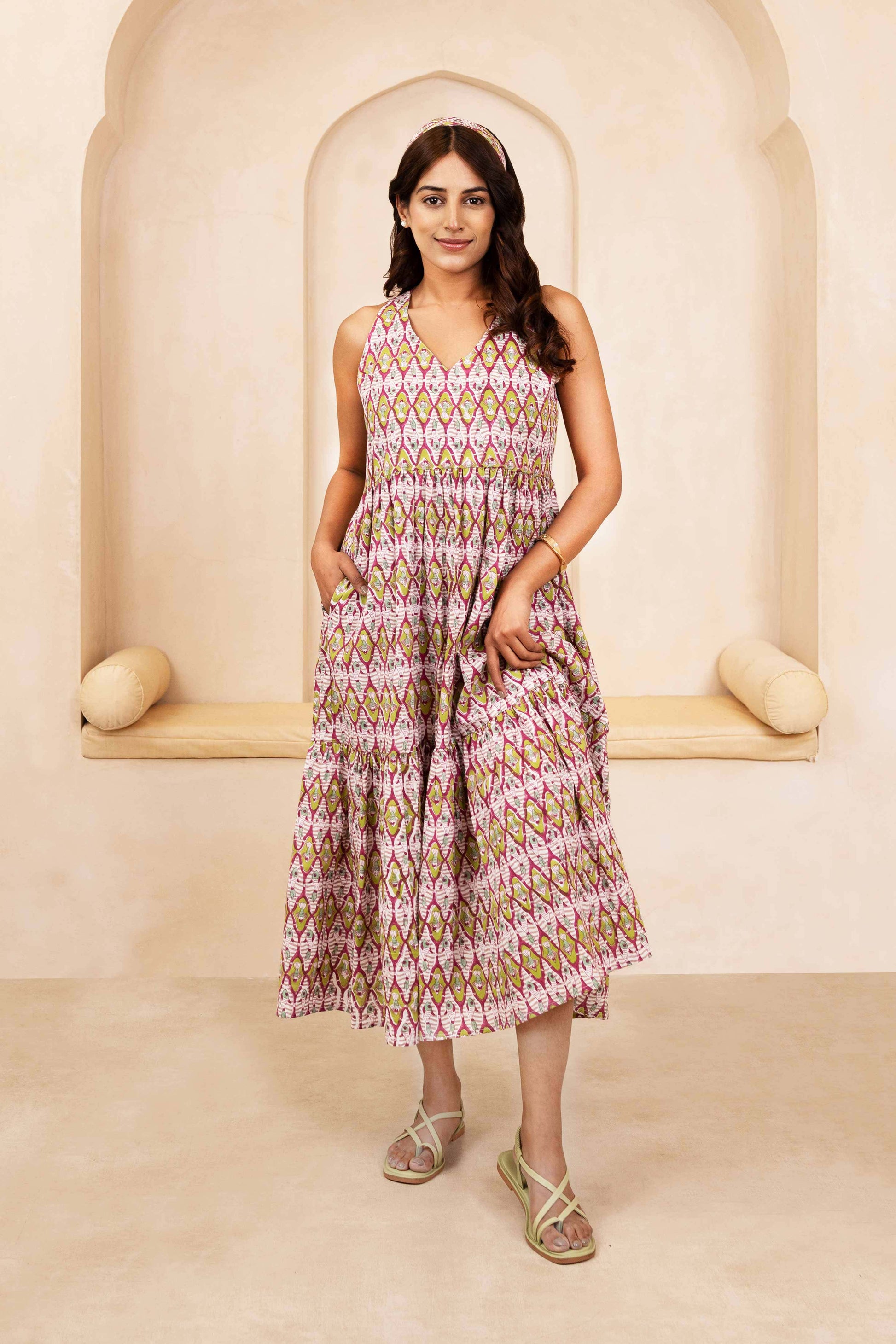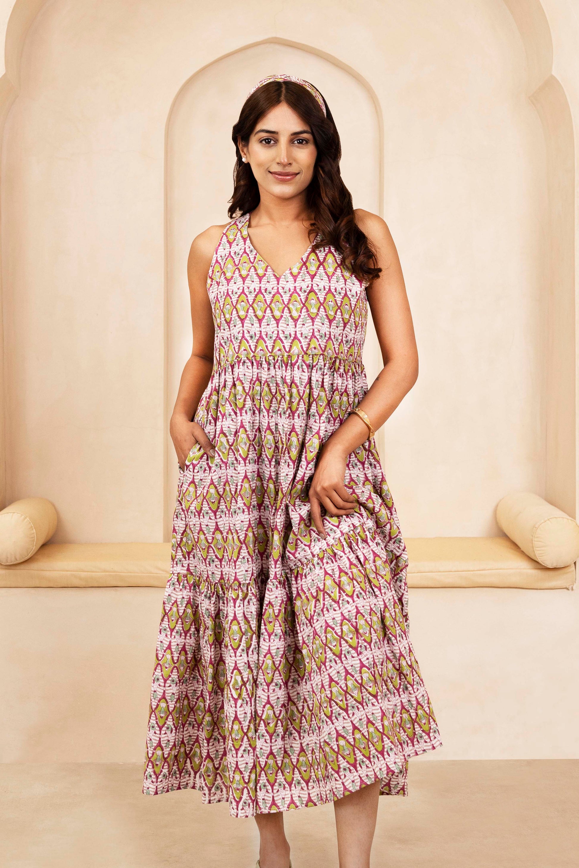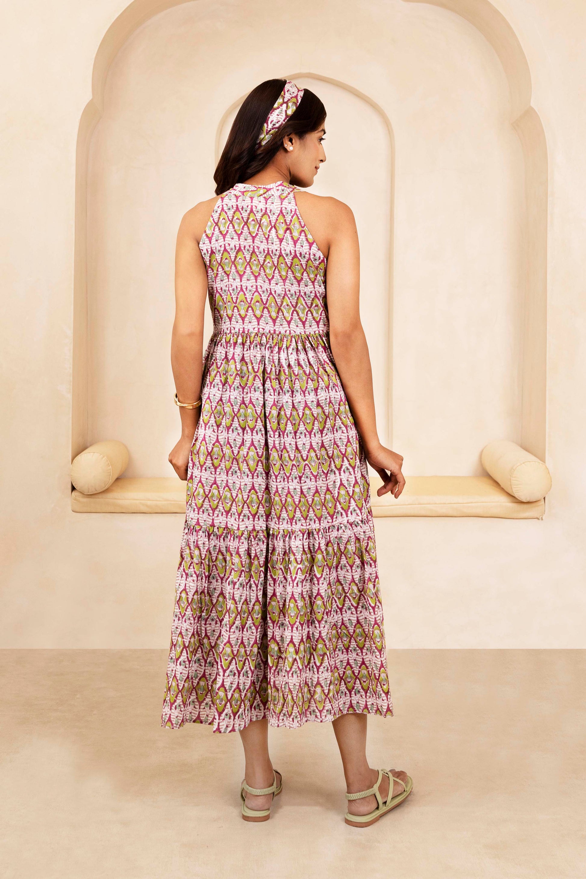 This handblock halterneck dress features a beautifully flared silhouette and delicate traditional prints that add an ethnic elegance. The halterneck cut lends a chic, modern touch while the soft cotton fabric keeps it light and breathable—perfect for sunny days, vacation getaways, or effortless festive styling. A graceful blend of handcrafted charm and contemporary style.