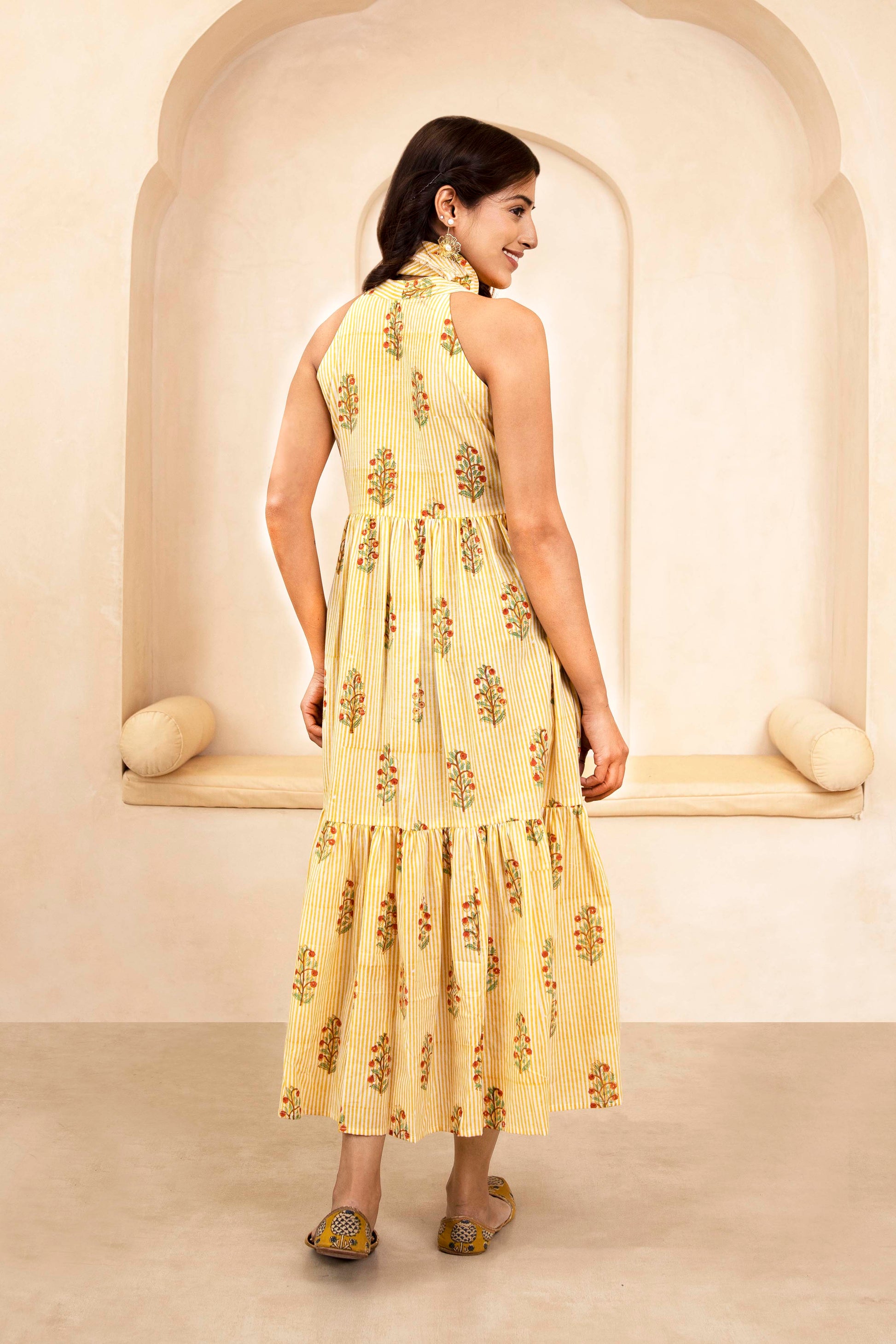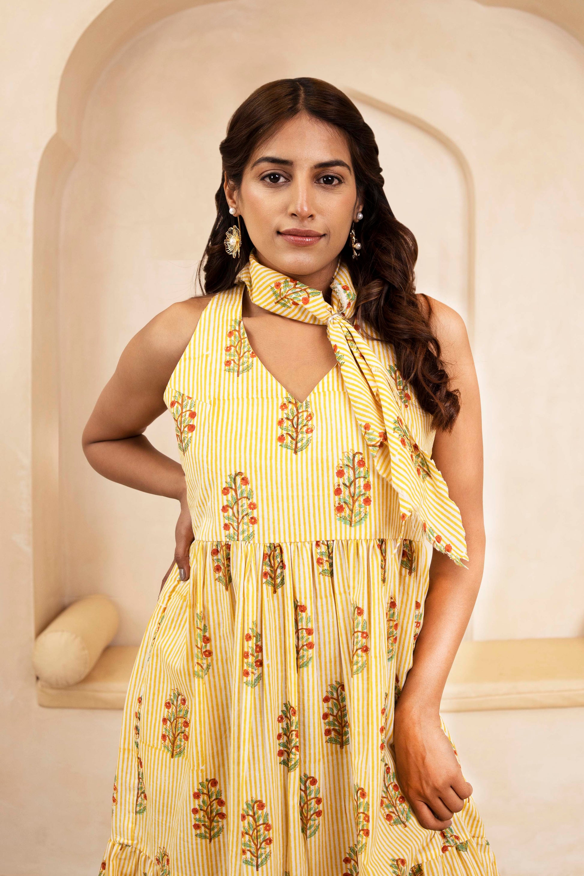 This is a yellow hand-block printed halter neck dress. It features a tiered, flowy design. The dress is sleeveless and has a relaxed fit, making it perfect for warm weather. The print is a mix of floral and geometric patterns in shades of red and green. This style is often made from cotton or other natural fabrics, which are comfortable and breathable.