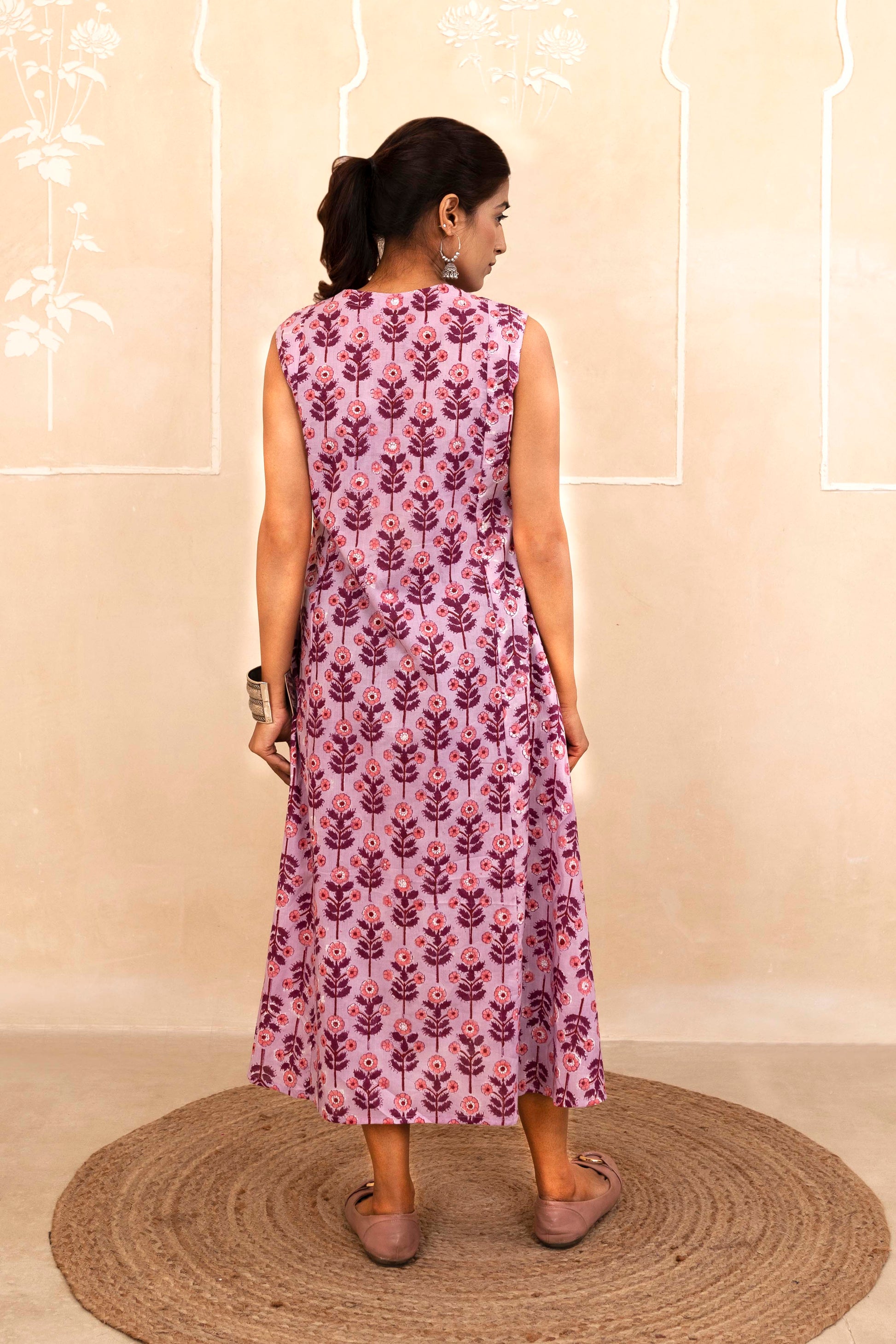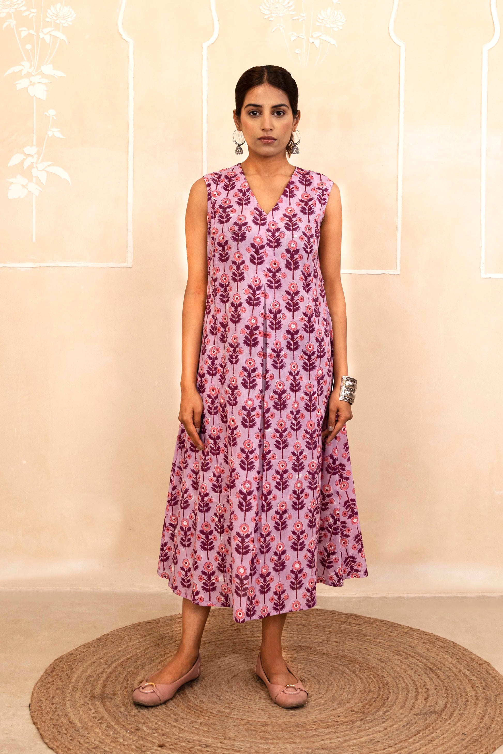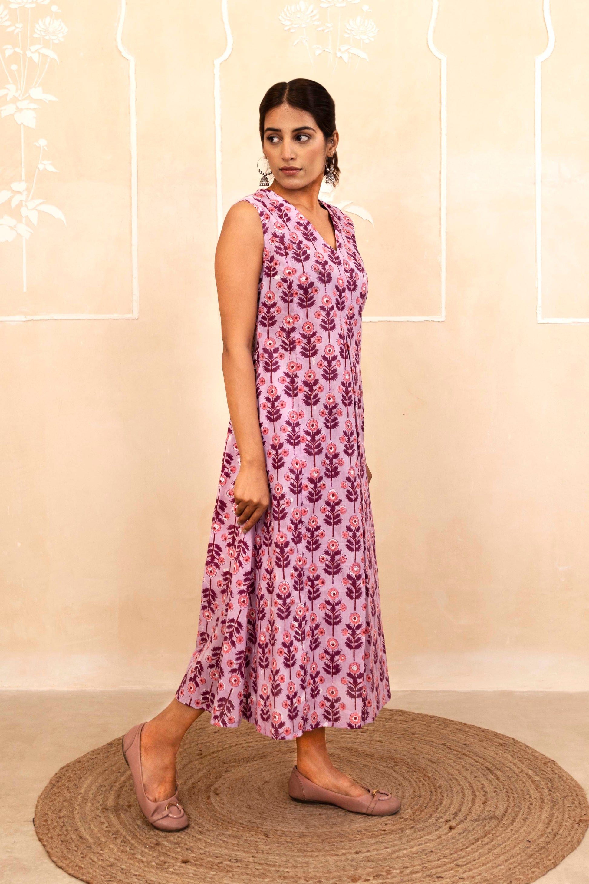 Delicately handblock-printed with floral motifs in shades of pink and plum, this sleeveless lilac dress exudes quiet charm. The V-neck and A-line silhouette offer a relaxed yet elegant fit, perfect for breezy summer outings. Crafted in soft cotton, it's a blend of traditional technique and contemporary grace.