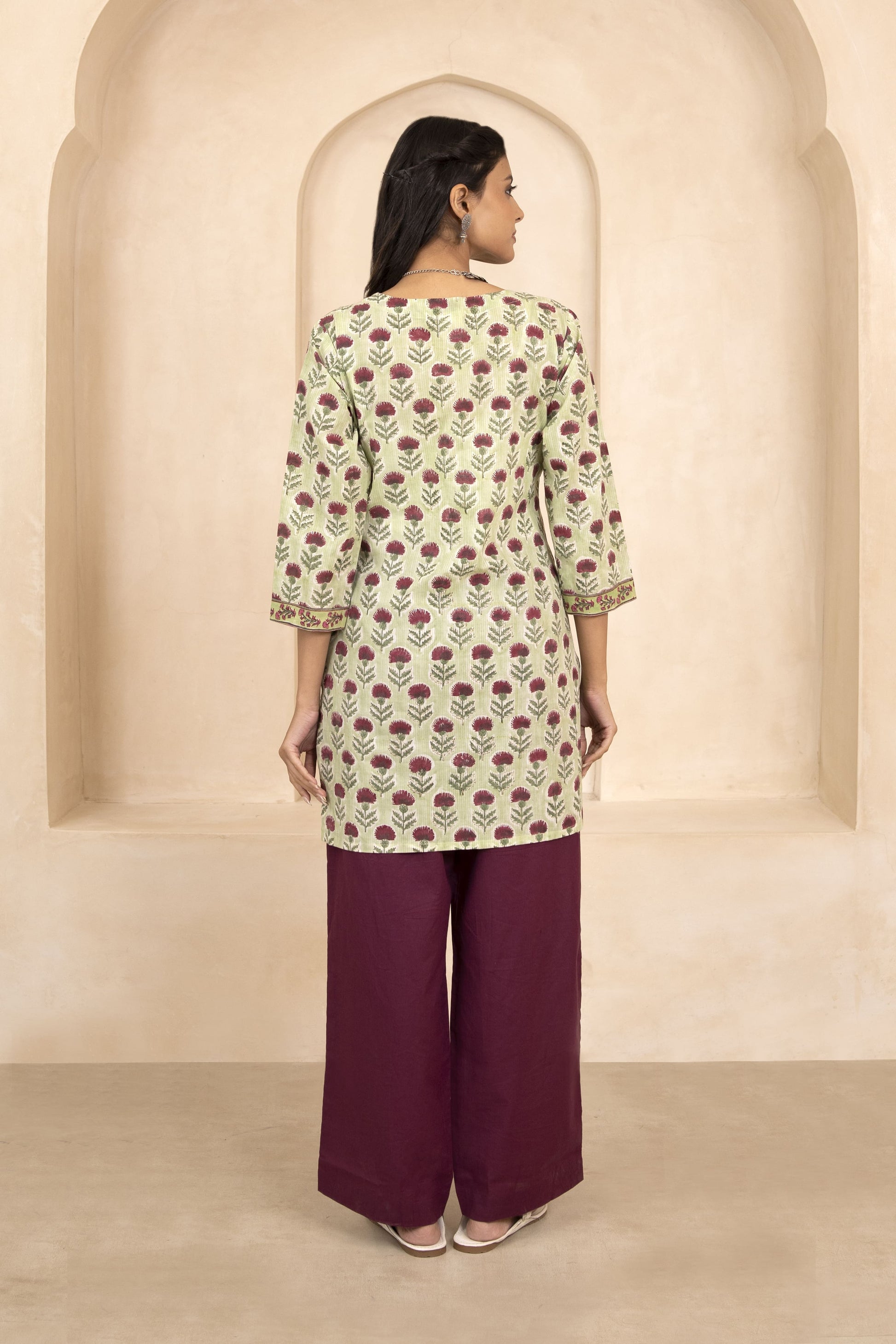 Gracefully adorned with blooming maroon flowers, this sage green short kurta is a celebration of earthy tones and timeless craft. The intricate floral block print is complemented by a deep maroon yoke detail and striped inner placket, adding a refined edge to the neckline. Tailored in breathable, soft cotton, it offers day-long comfort with ethnic flair—ideal for brunches, errands, or light festive gatherings.