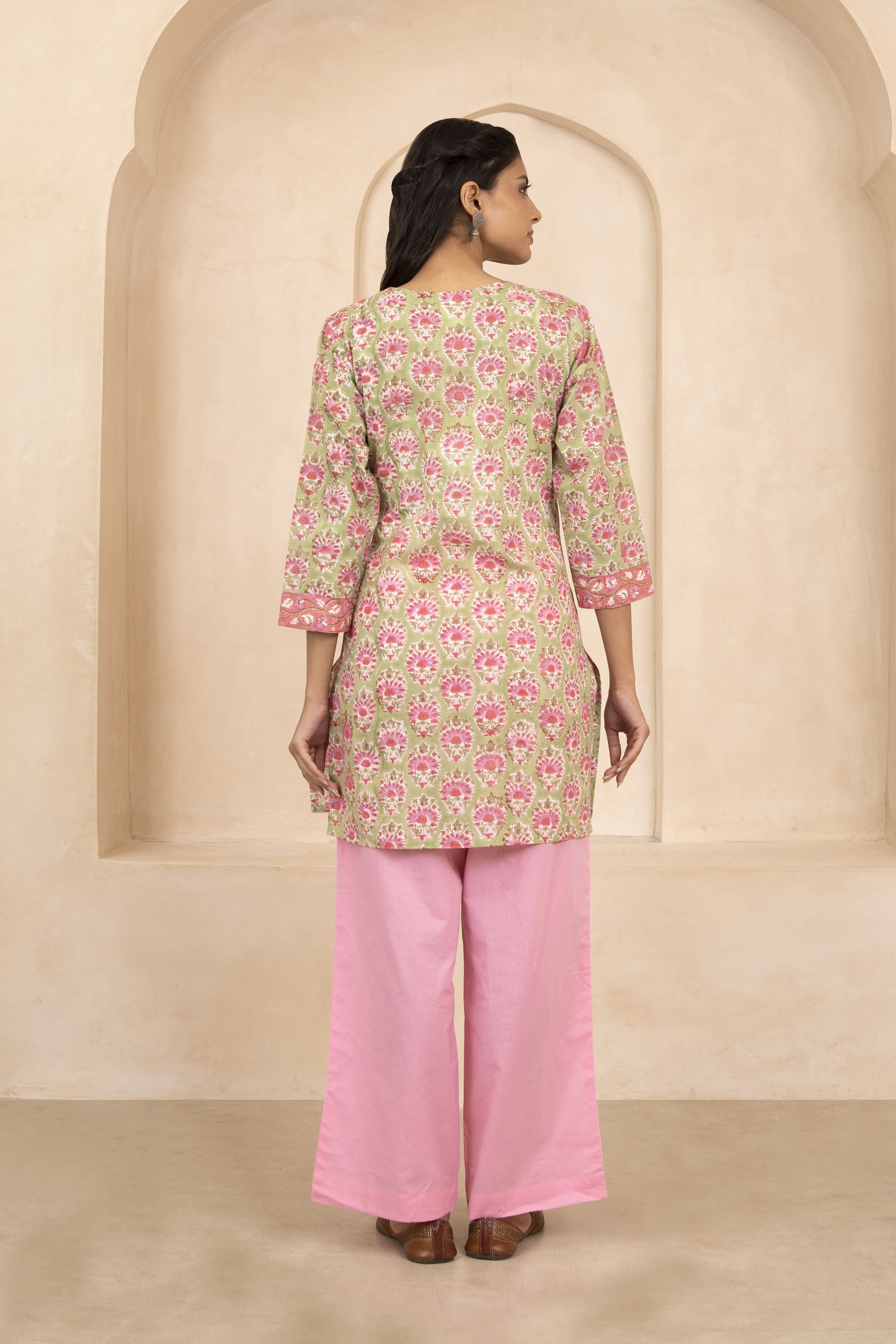 Step into everyday elegance with this hand block printed cotton Short Kurti featuring a vibrant floral motif in pink over a soothing green base. The soft, breathable cotton fabric ensures all-day comfort, while the detailed neckline with contrast piping adds a refined touch. Designed with 3/4 sleeves and a straight silhouette, this piece blends traditional craft with effortless charm—perfect for casual outings or festive gatherings.