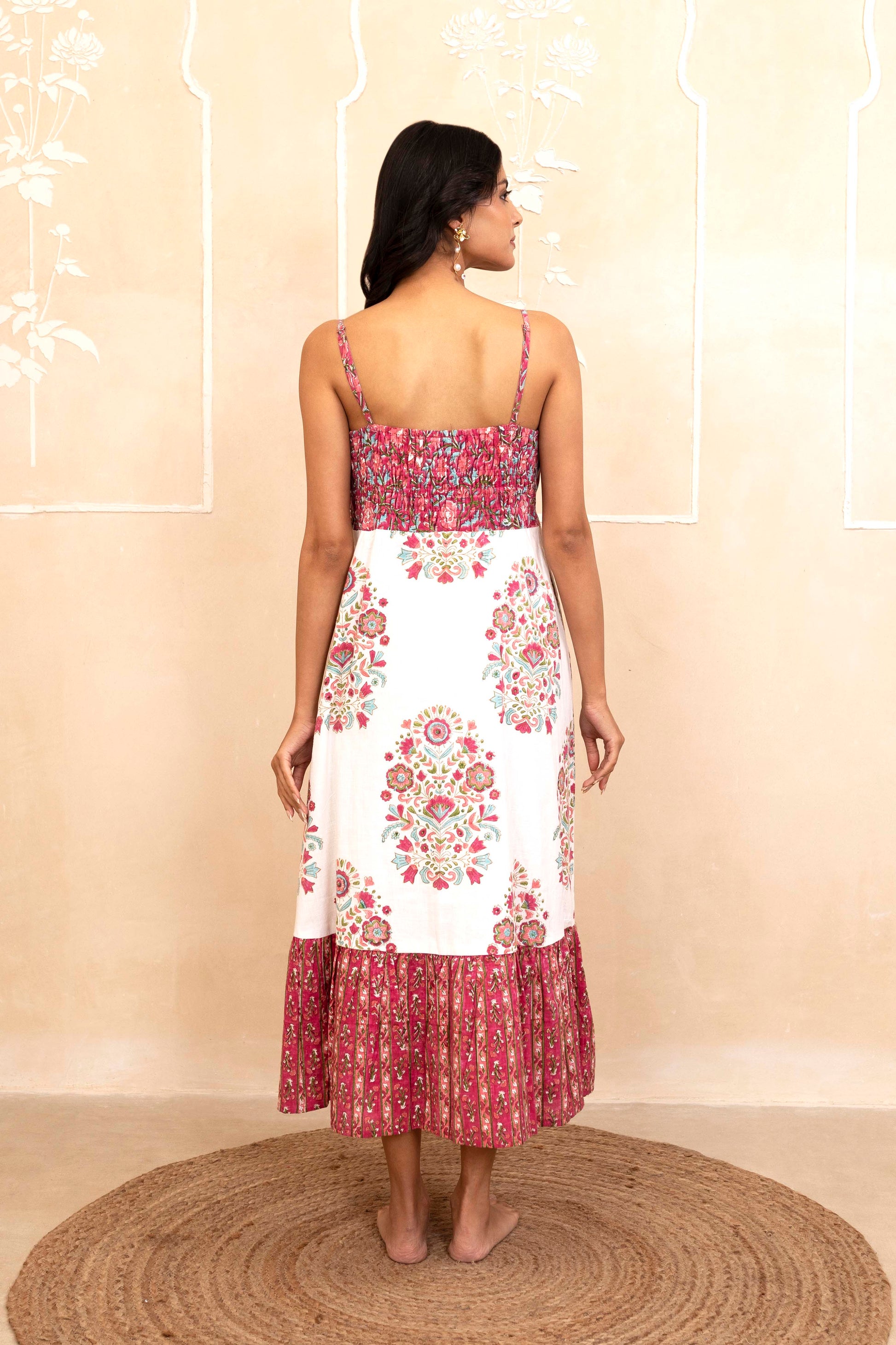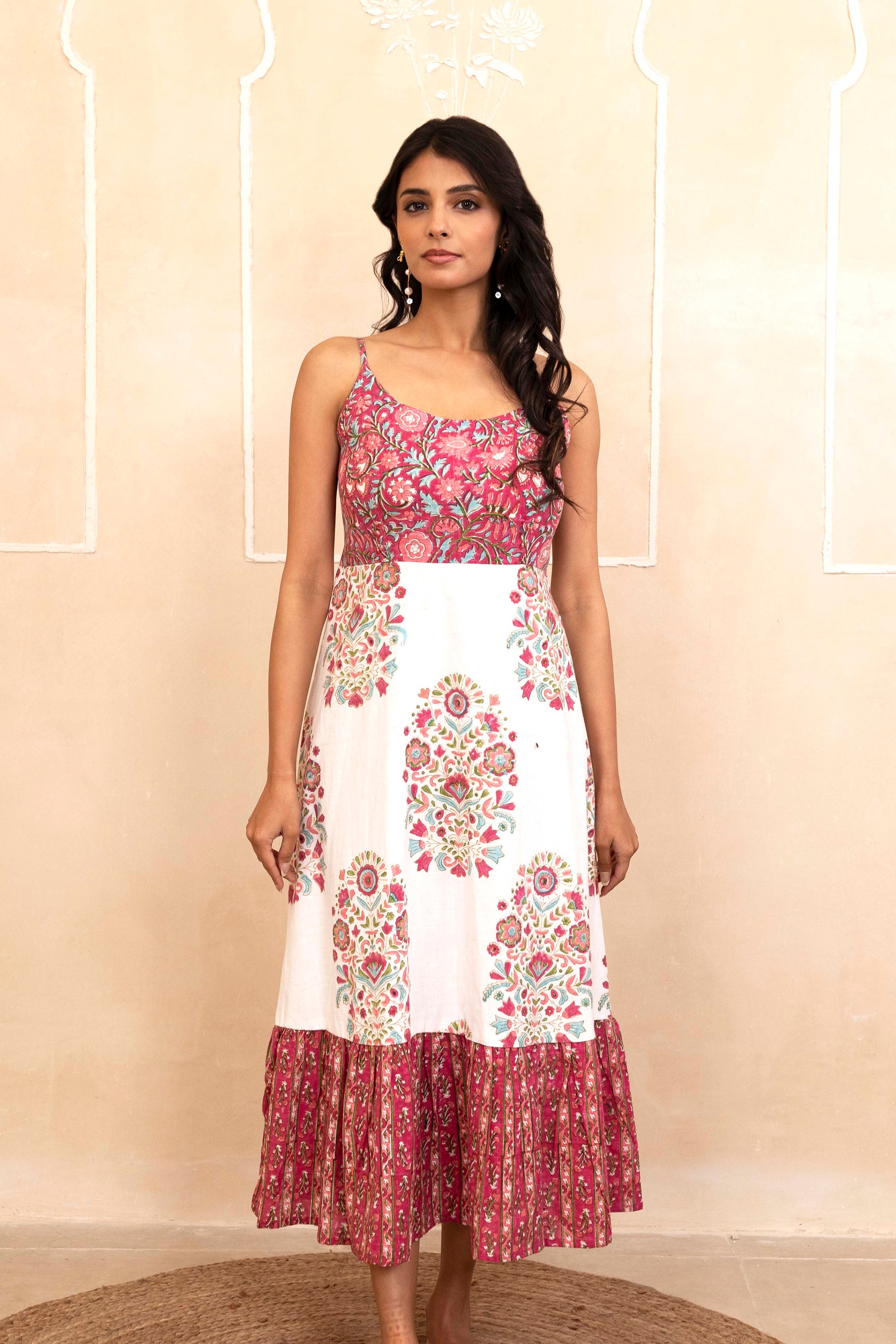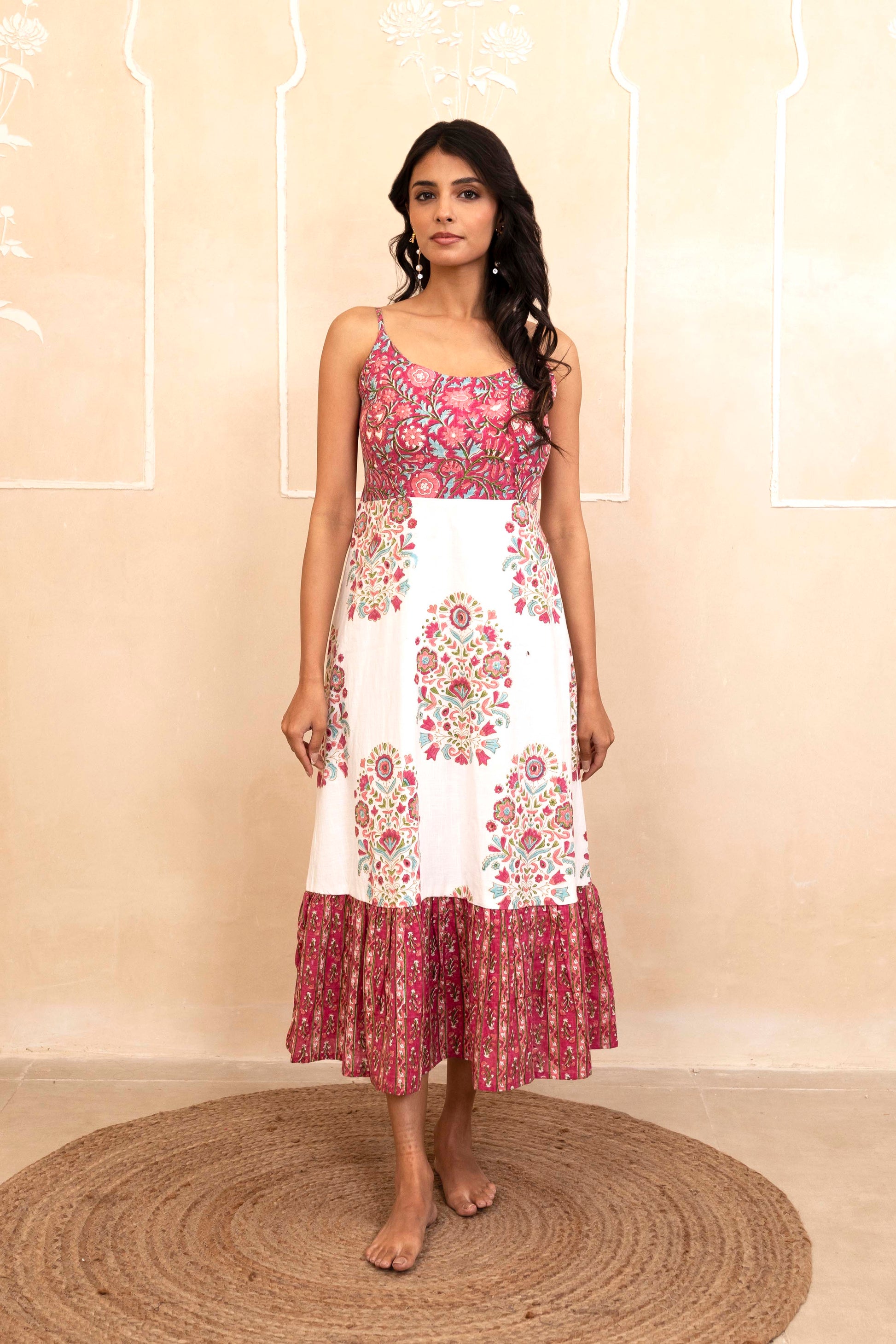 This handblock spaghetti dress features a vibrant, hand-printed pattern on a cotton fabric. The dress has a fitted bodice with thin spaghetti straps and a flowing midi-length skirt, finished with a ruffled hem. The design is ideal for warm weather, offering both comfort and style. The hand-block print gives it a unique, artisanal touch, making it a standout piece for casual or semi-formal occasions.