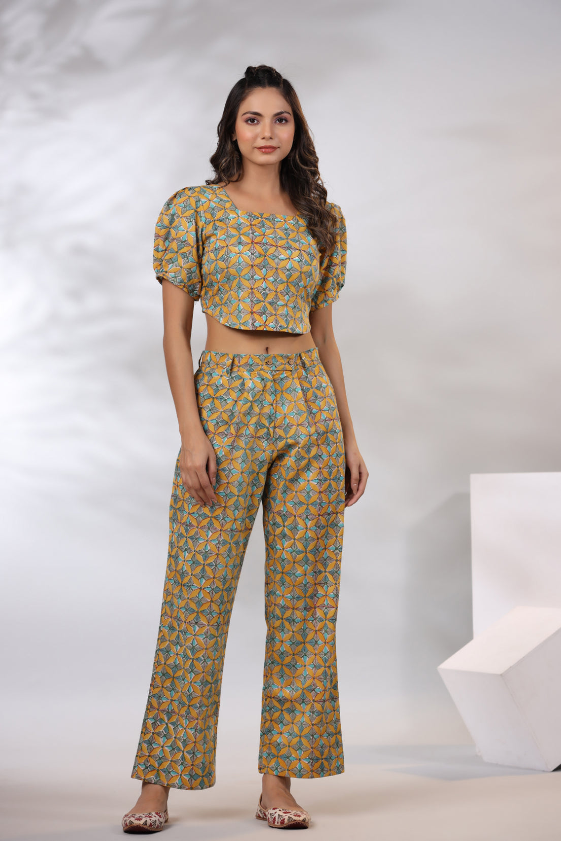 Our Fascinating Mustard 2-Piece Co-Ord Set Comes With A Combination Of Forest Green Hues With Puff Sleeves, Carefully Assembled For Perfect Look.