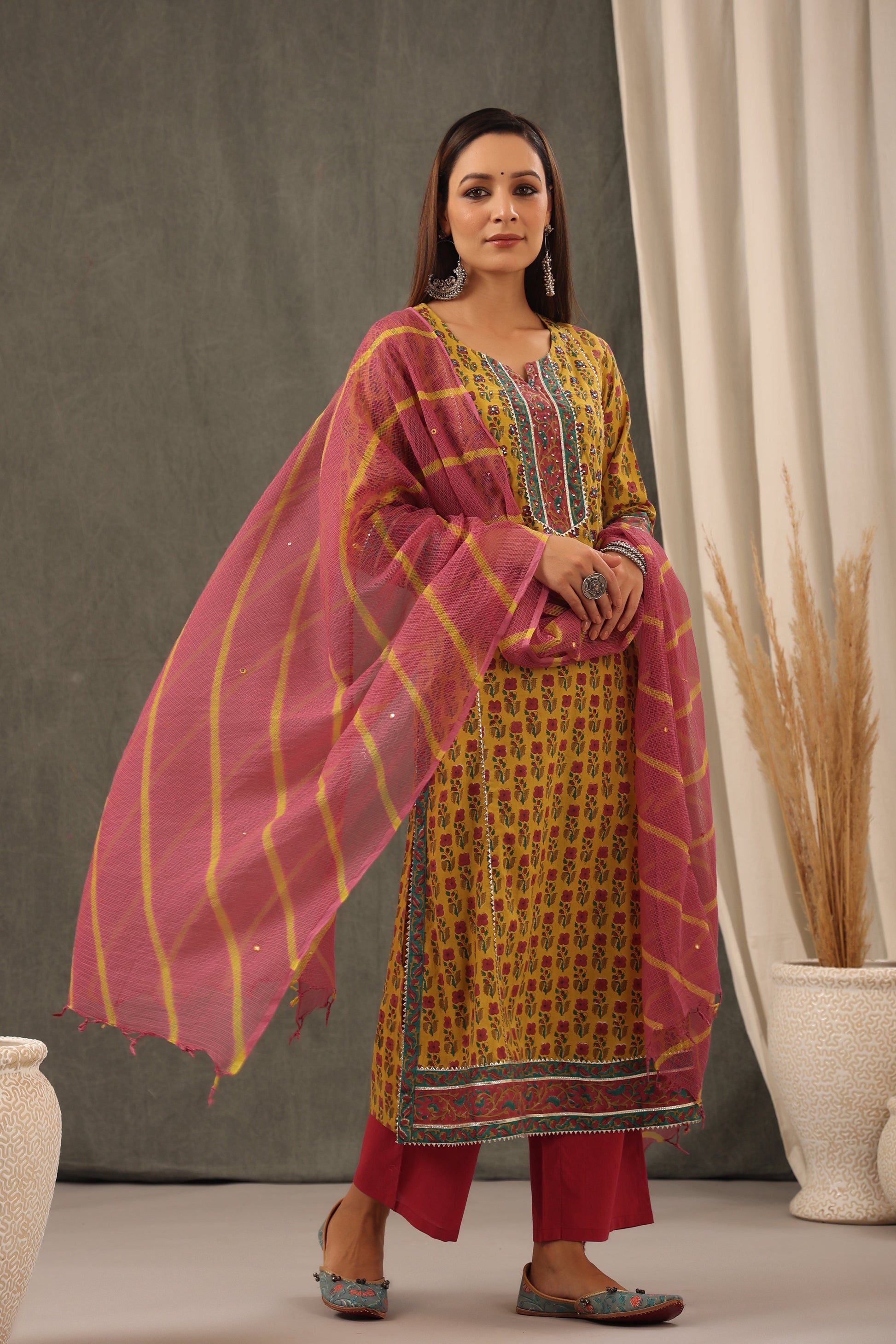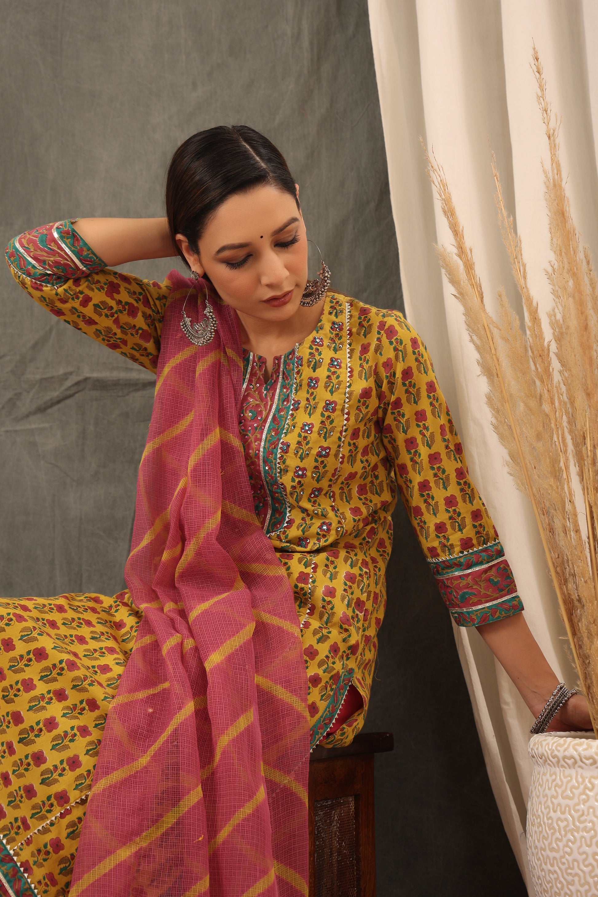 Our classic exquisite craftsmanship, cotton kurta. Showcases a pleasing mustard shade with the combination of scarlet red and brass green. This piece comes embellished with intricate sequence detailing on neck and cuff. Carefully assembled for a gorgeous look.