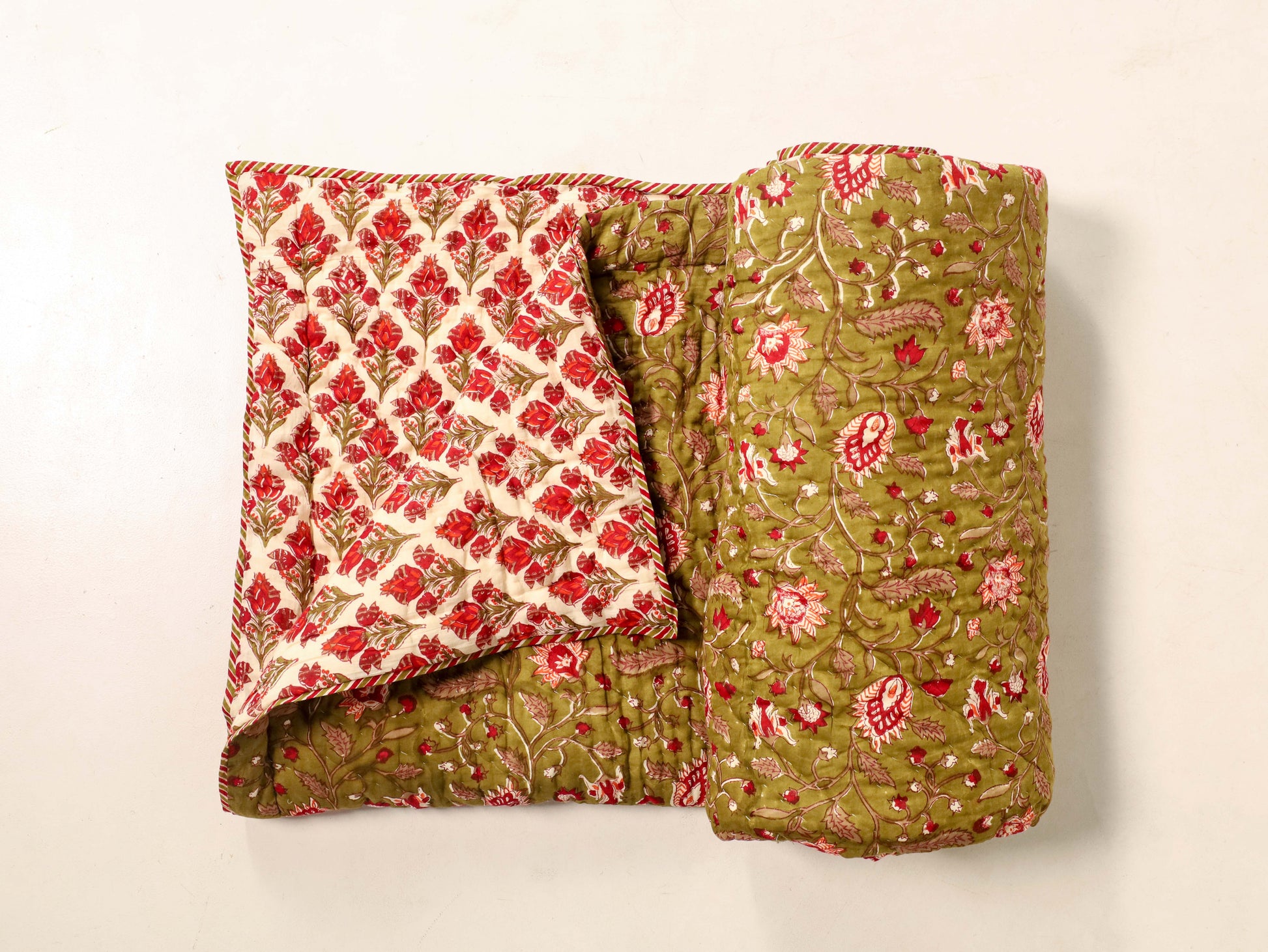 Olive Green and Red Single Bed Reversible Quilted Razai