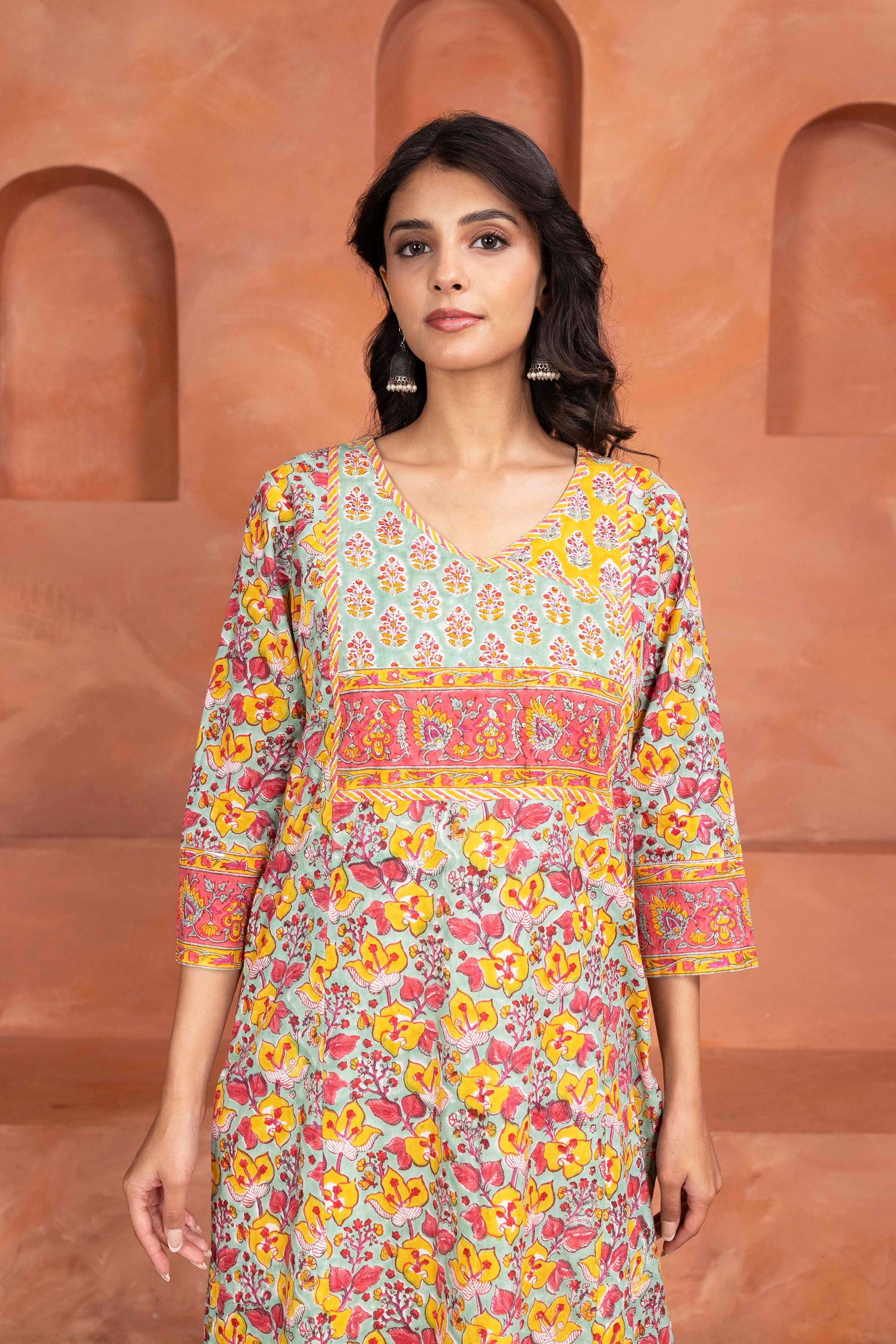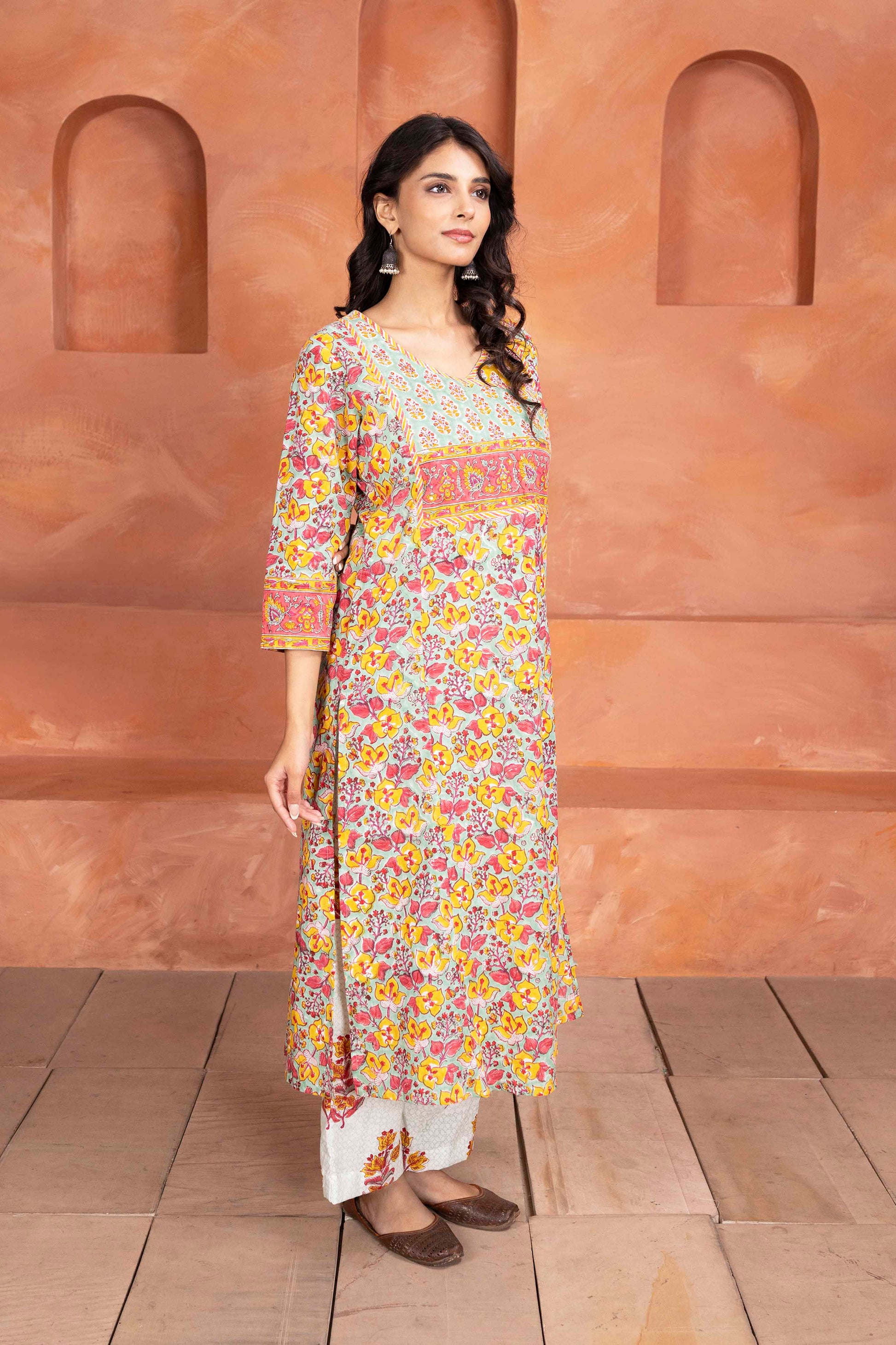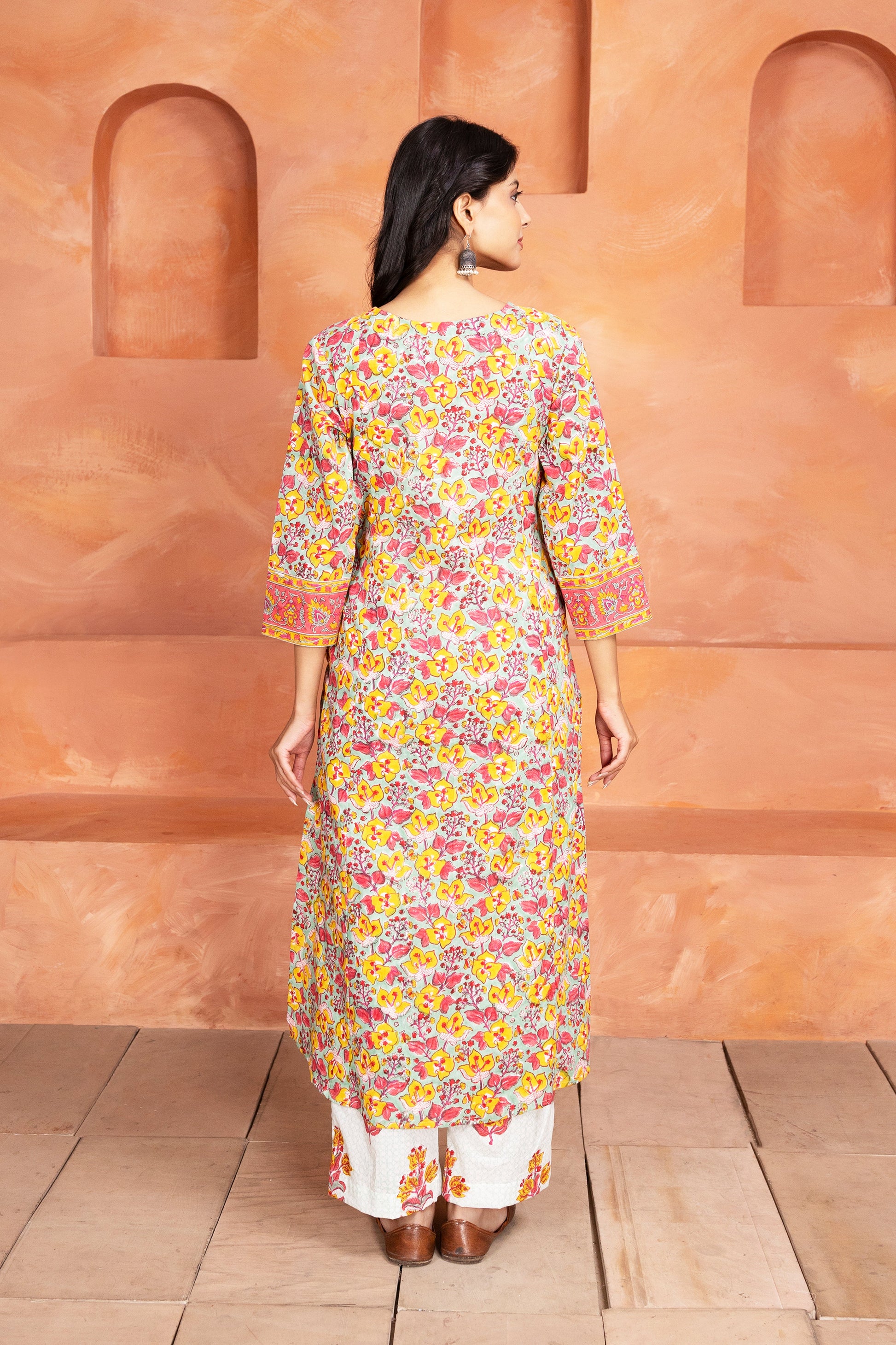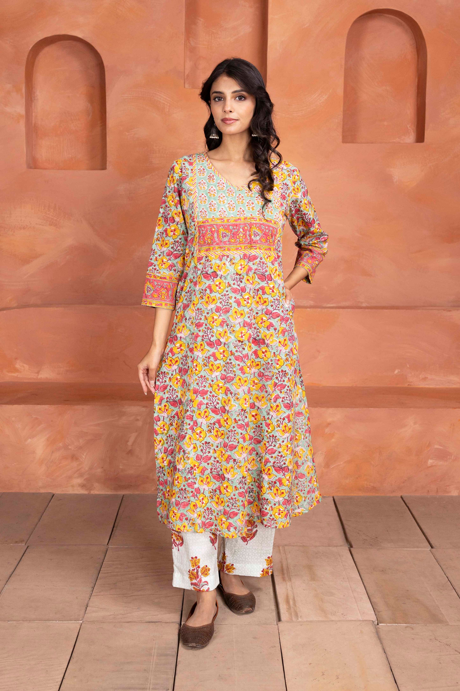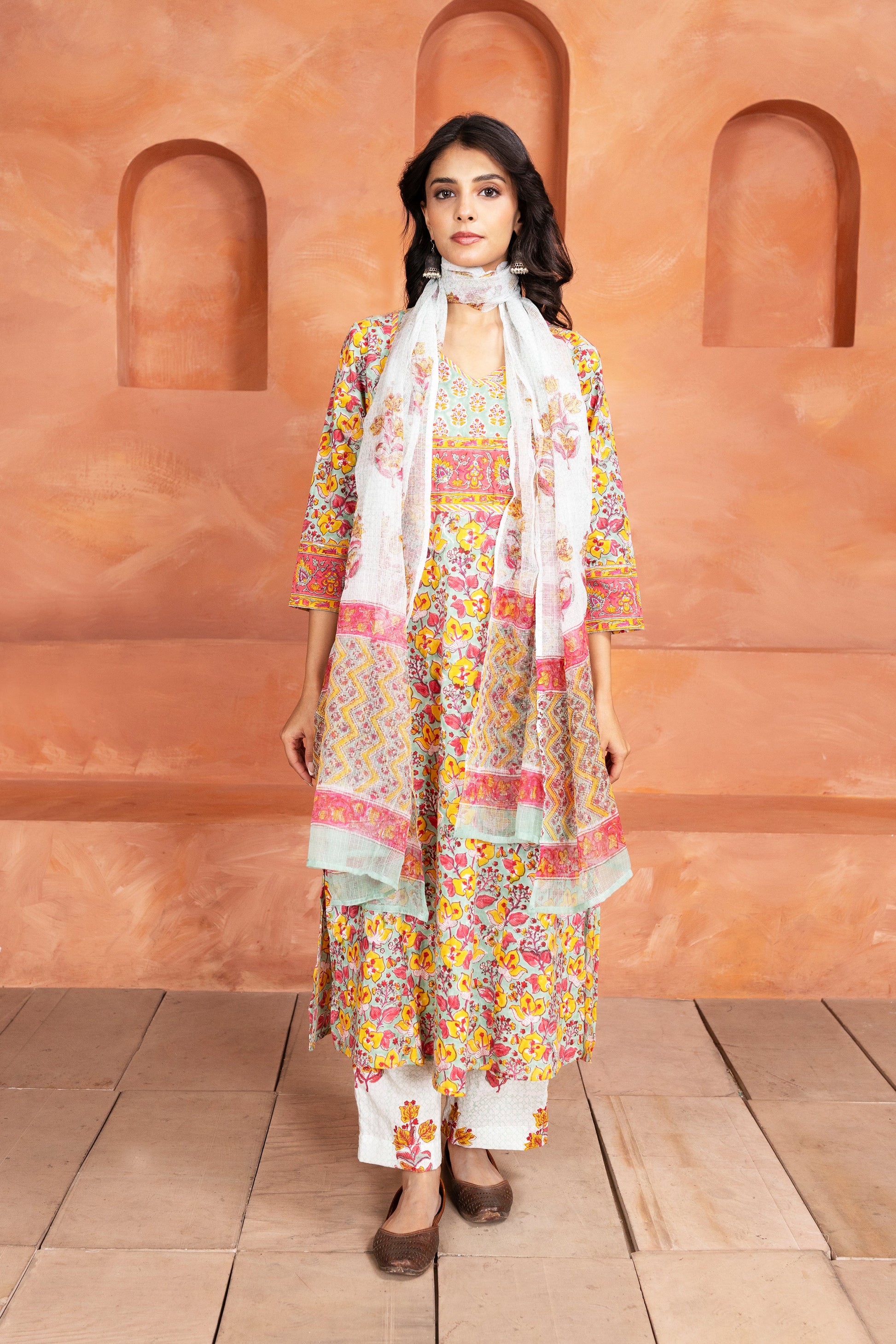A fusion of prints and patterns, this kurta set features a striking floral yoke detail and a lively multicolor palette. Coordinated pants and a pastel-bordered dupatta complete the look with finesse.