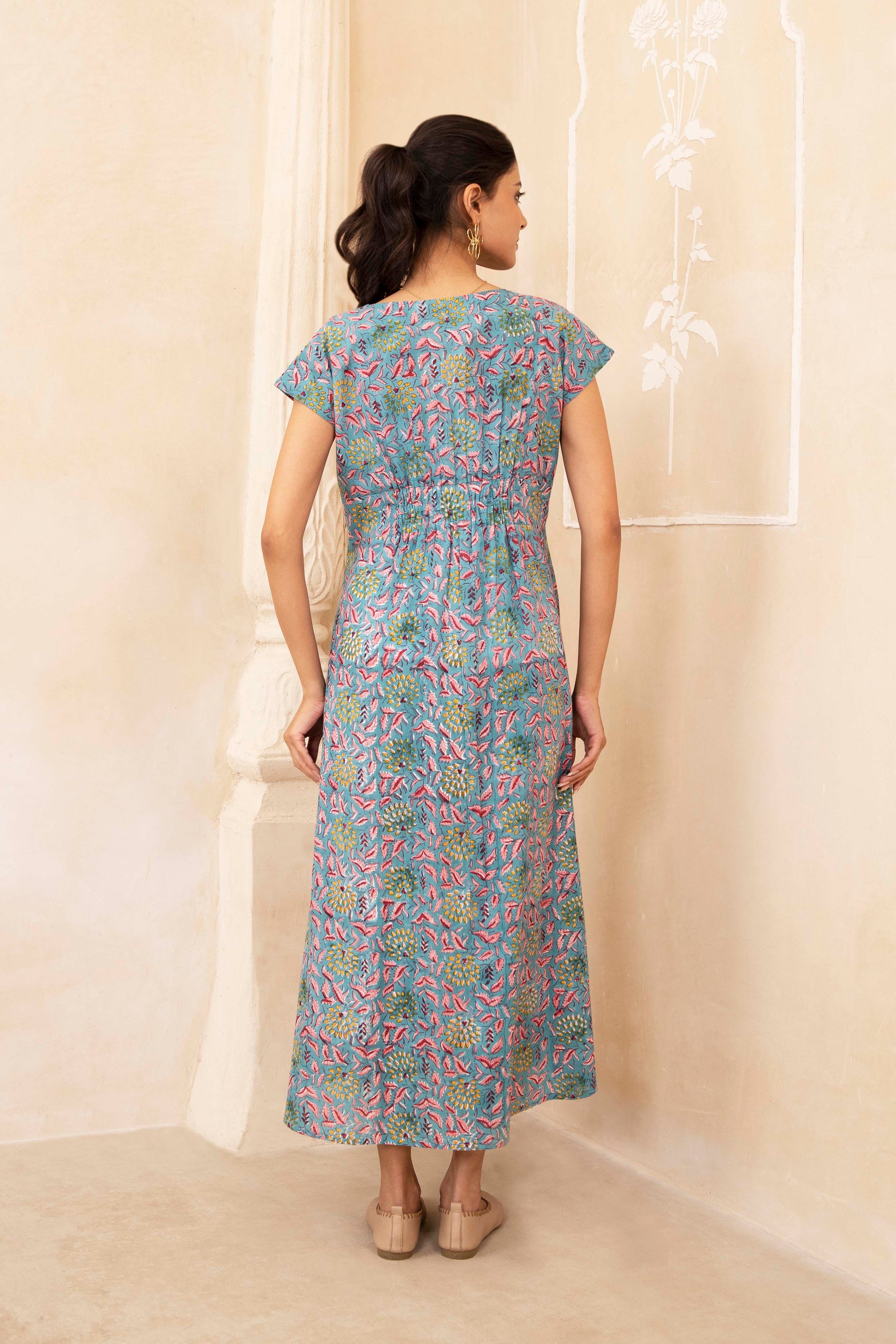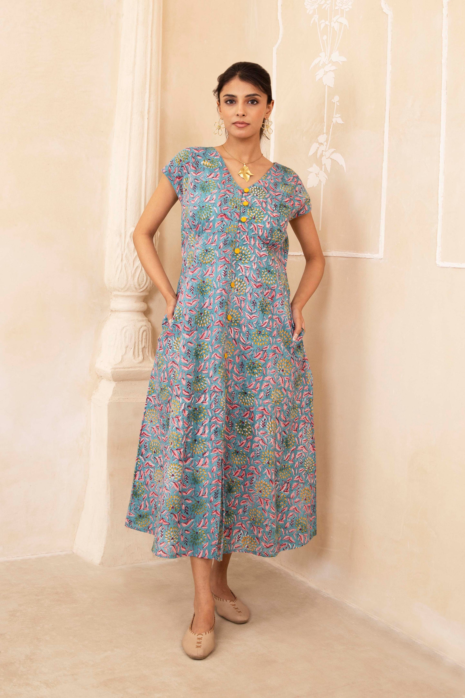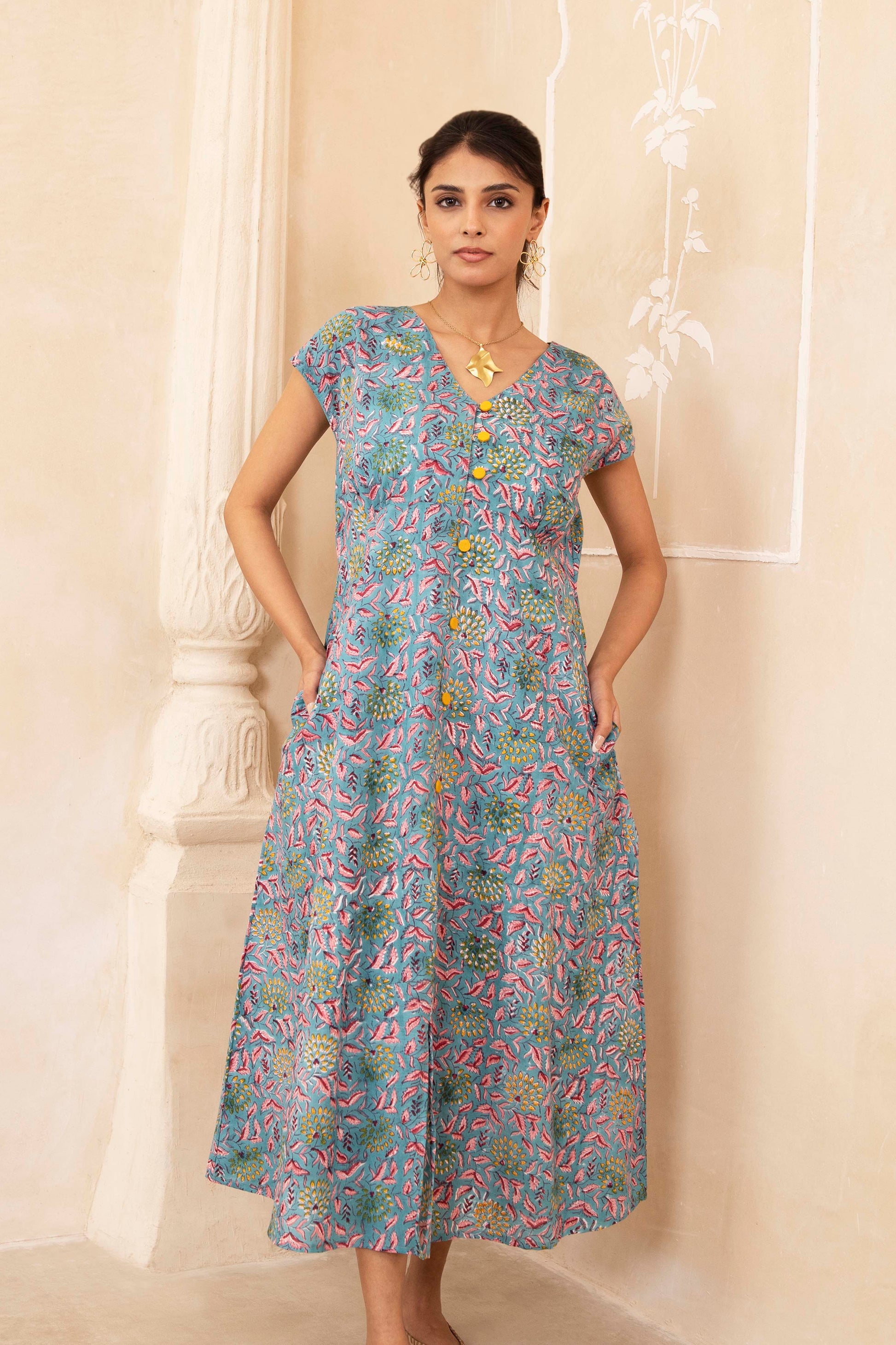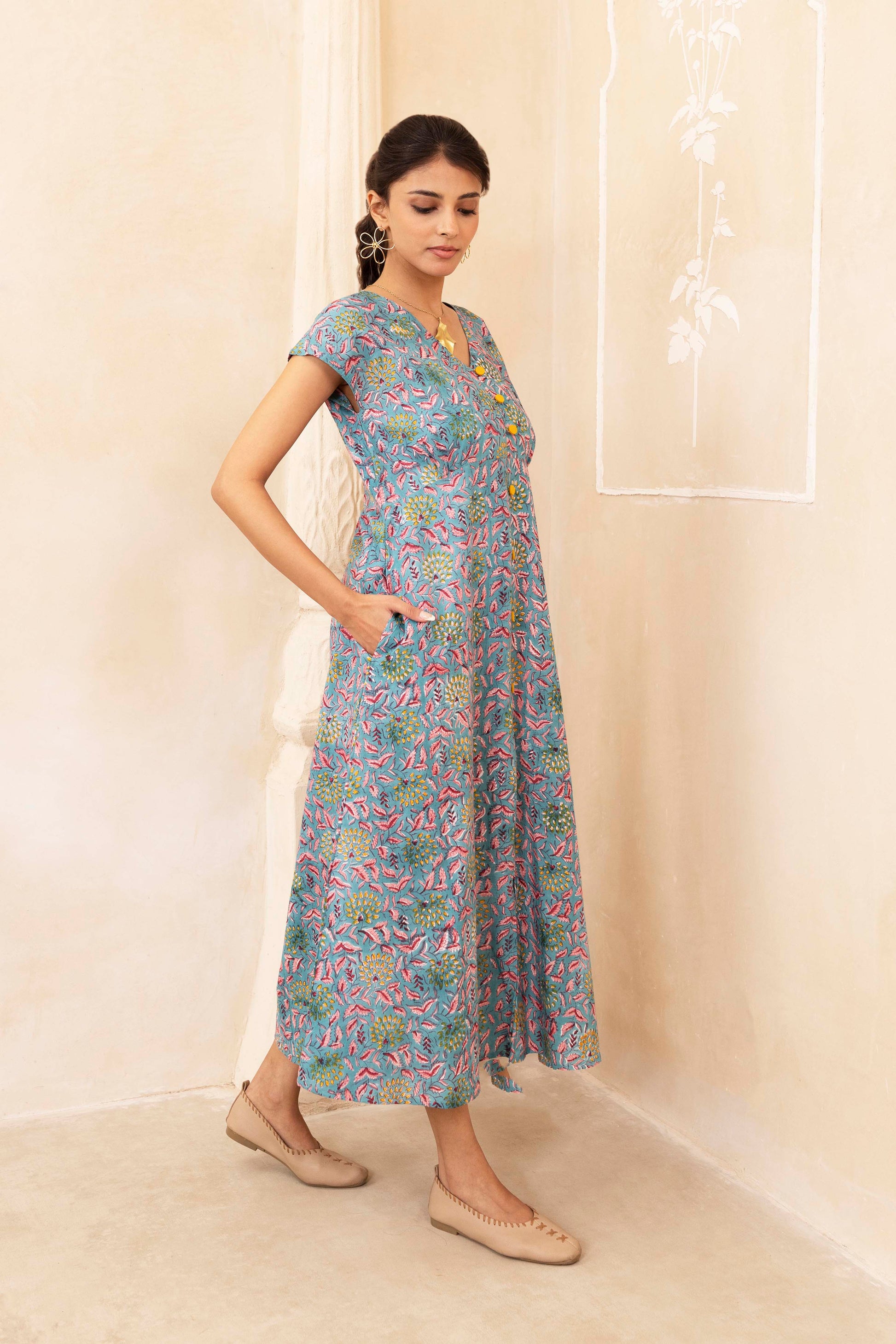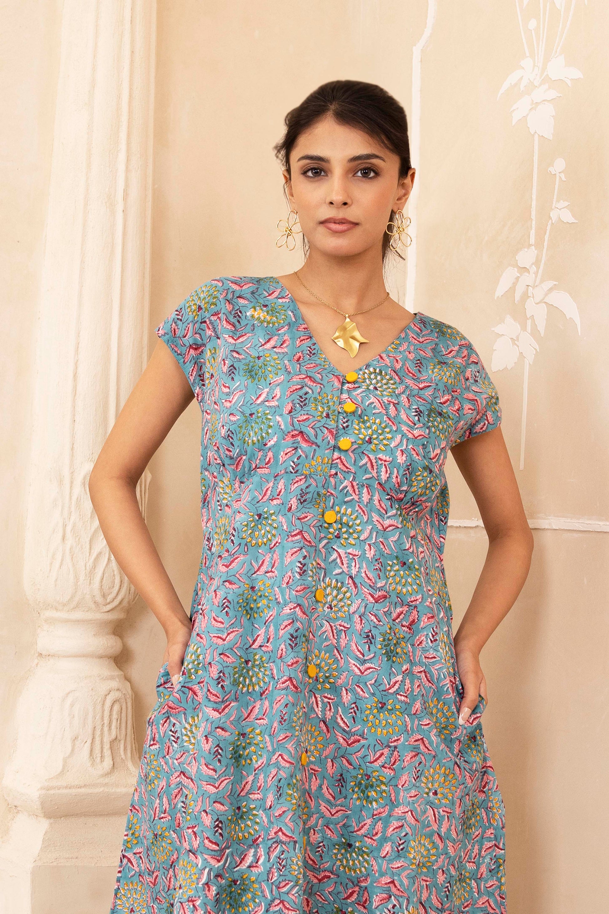 A delightful blend of comfort and elegance, this blue-hued handblock dress features a vibrant floral pattern in pinks, yellow and greens. Designed with cap sleeves, functional front buttons, and roomy side pockets, it’s an easy pick for effortless daywear. Crafted in breathable cotton for all-day ease.