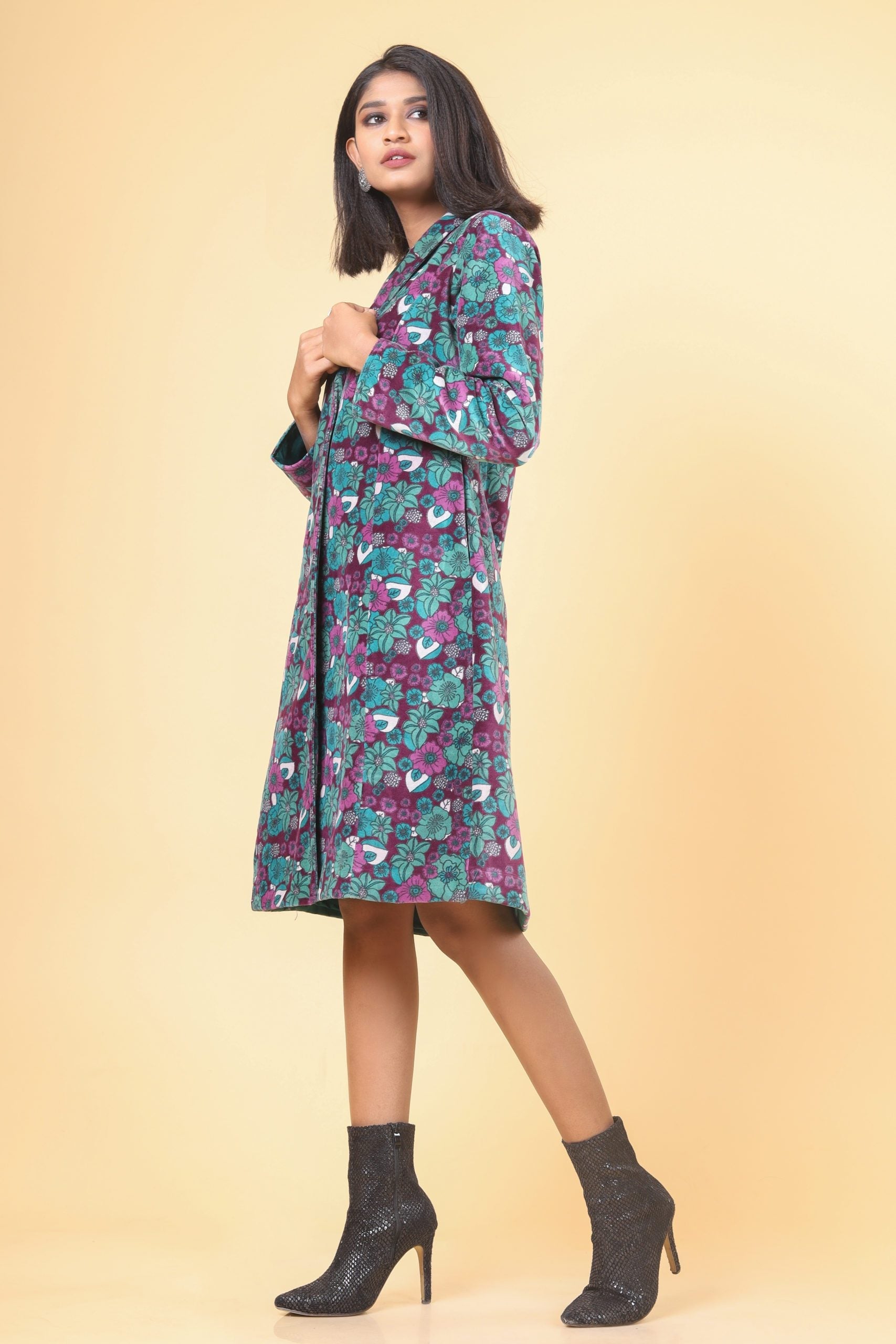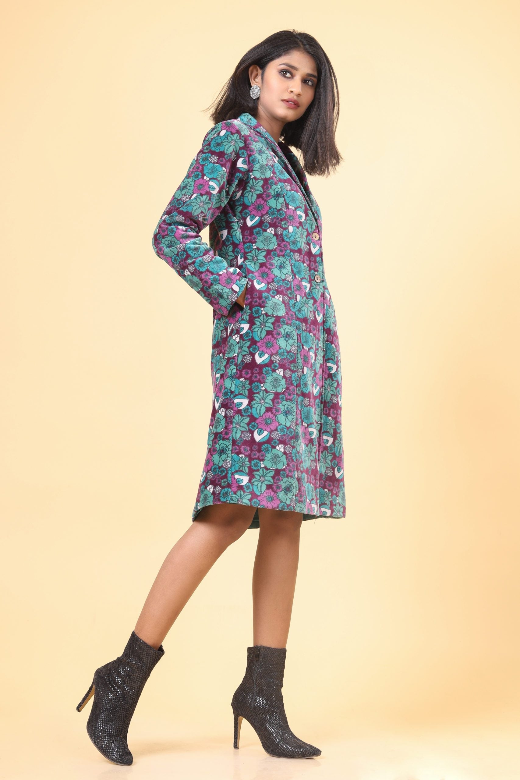 Jungle with pine green with a combination of mauve and mulberry collared style, knee-length long velvet warm jacket.