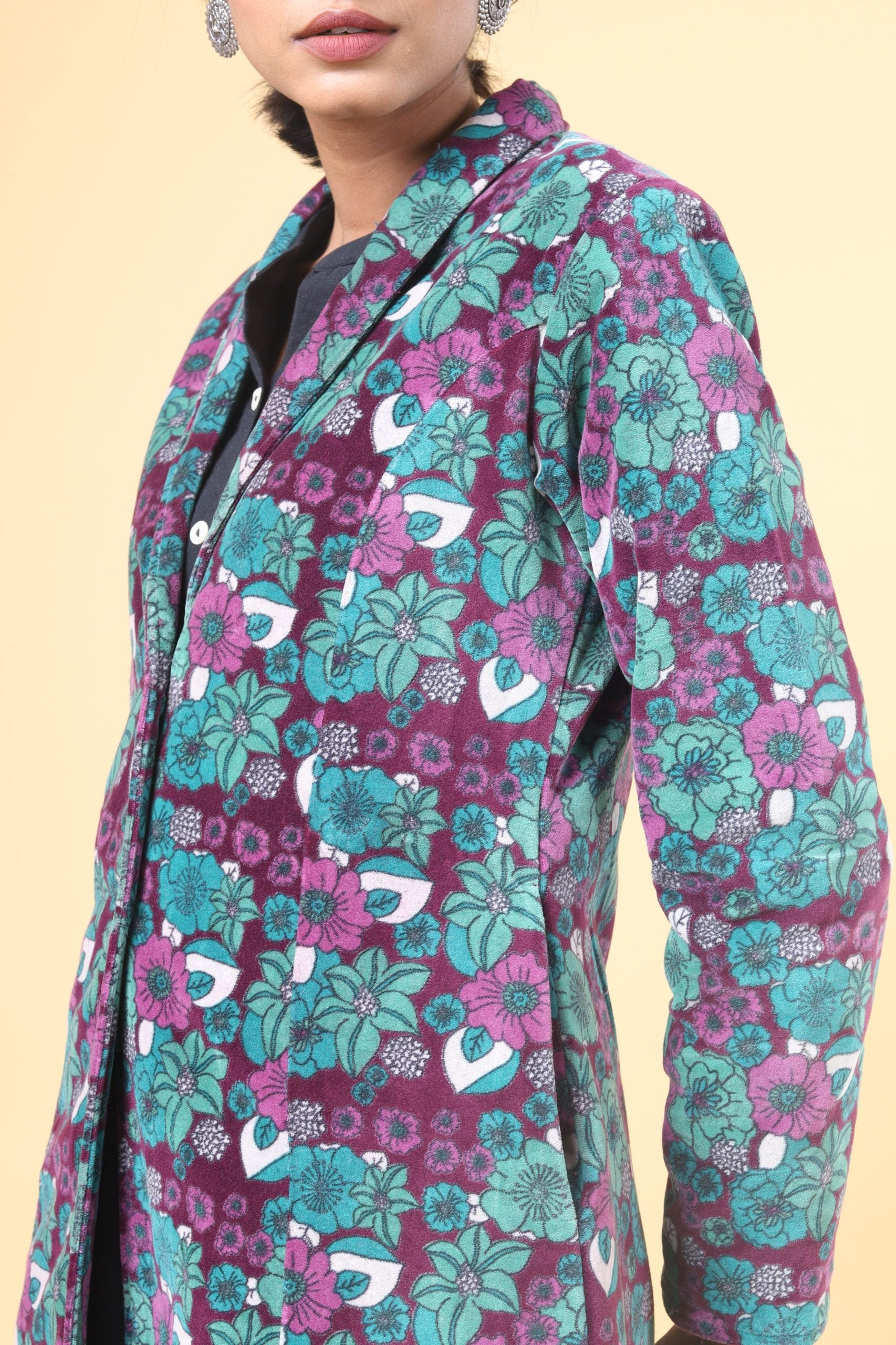 Pine green with mulberry collared long velvet jacket